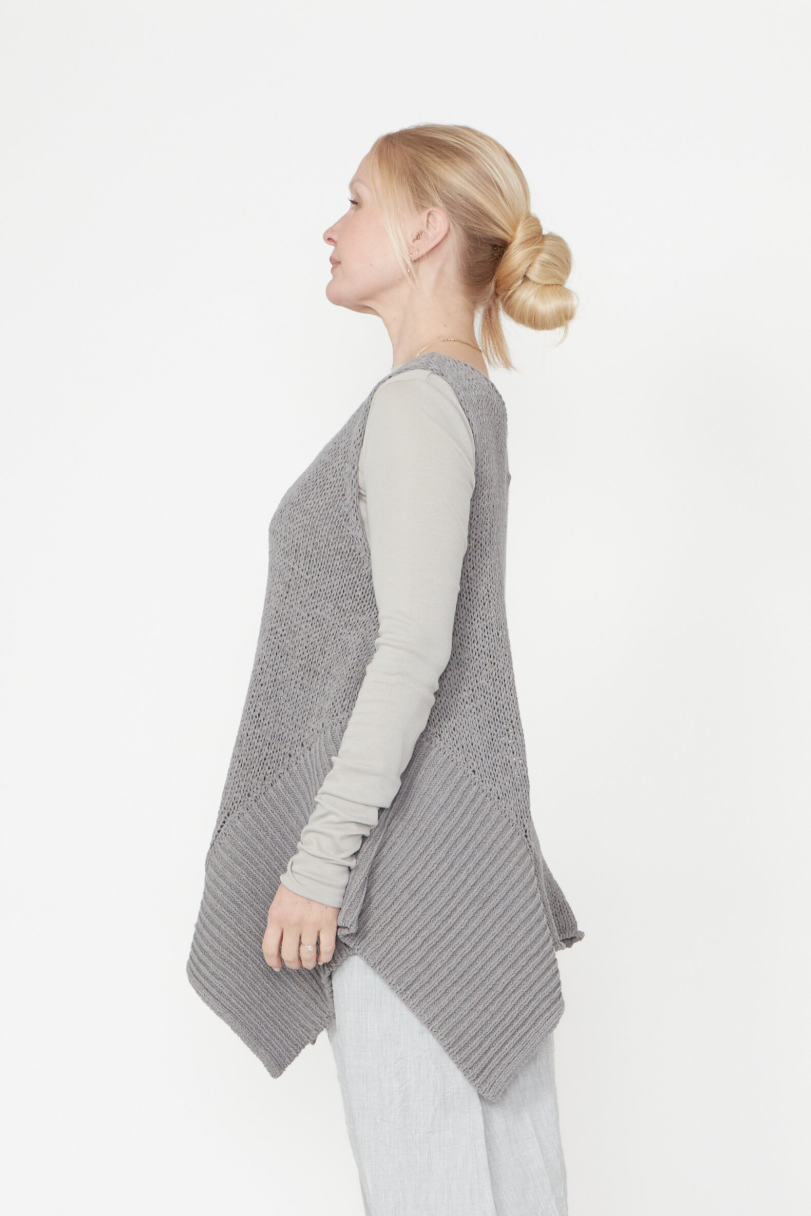 Ærmeløs løst-strikket top lavet i en lækker blød bomuldsblanding. Toppen har brede ribkanter forneden. Findes i flere farver.