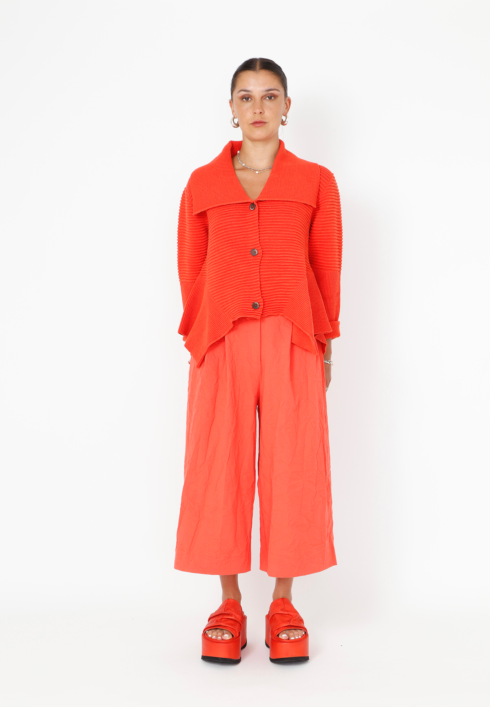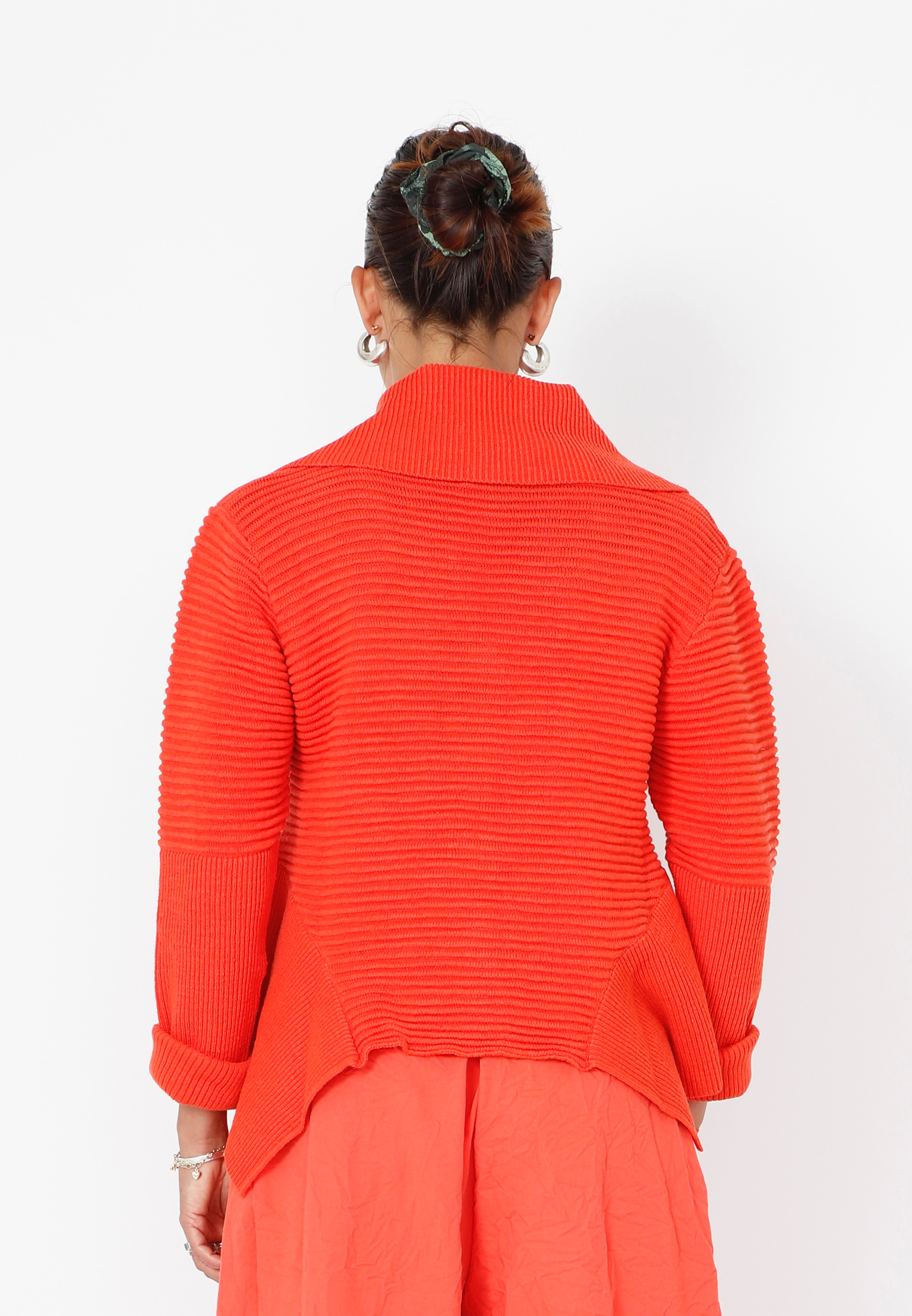 Strikbluse med krave og knapper. Blusen har lange ærmer og er asymmetrisk forneden. Blusen er lavet i en lækker blød blanding af bomuld og hør. Findes i flere farver.