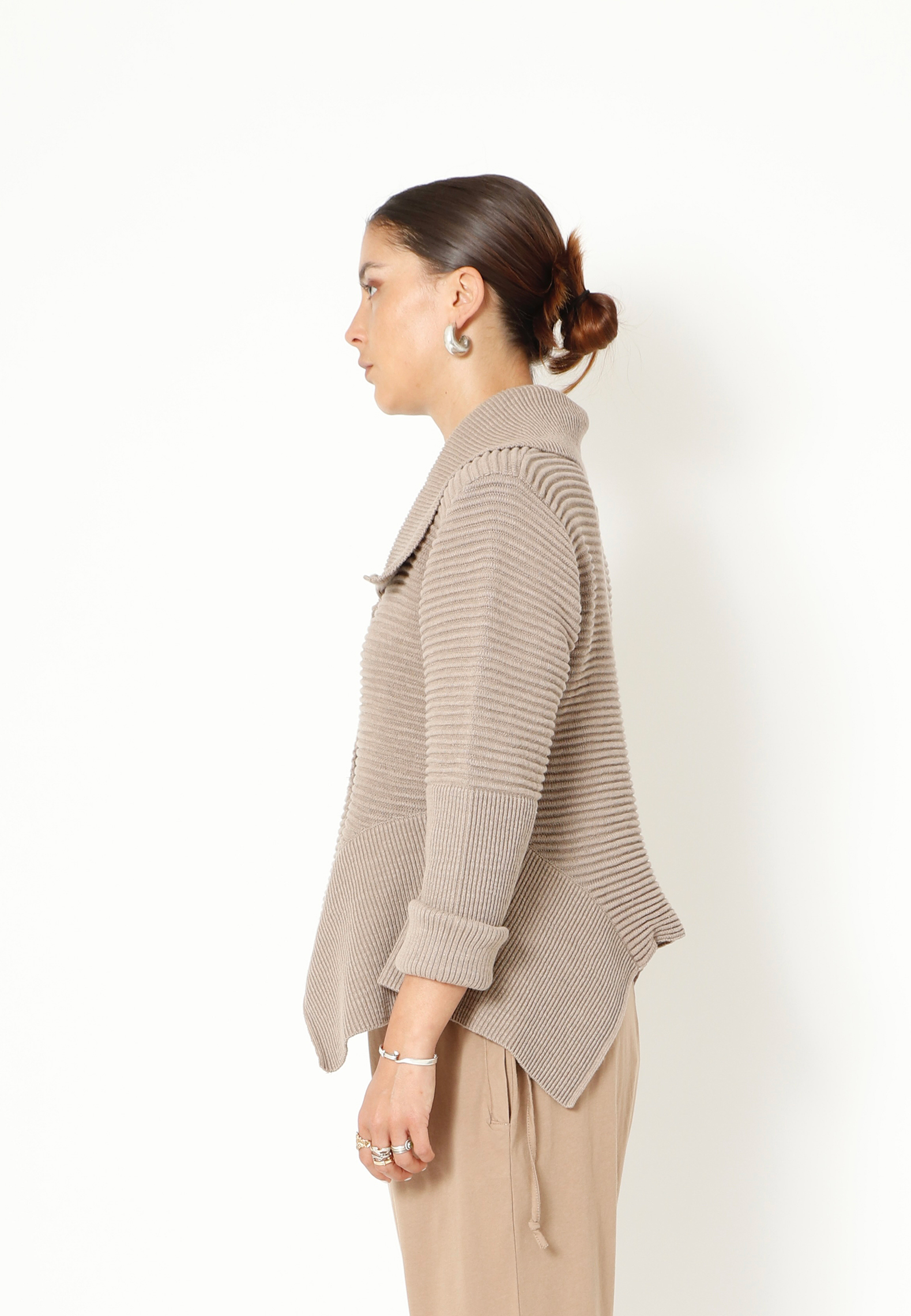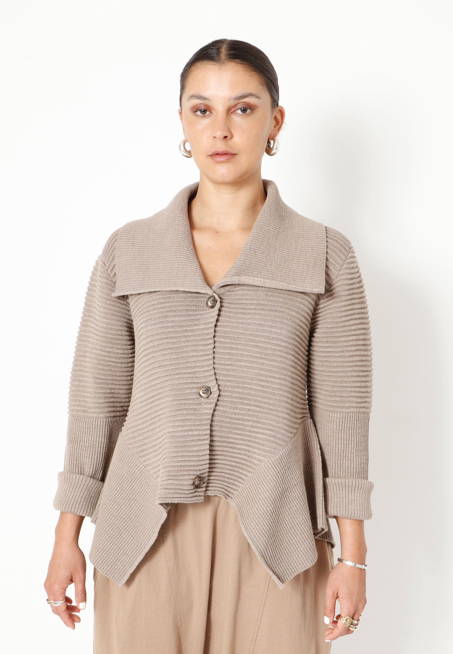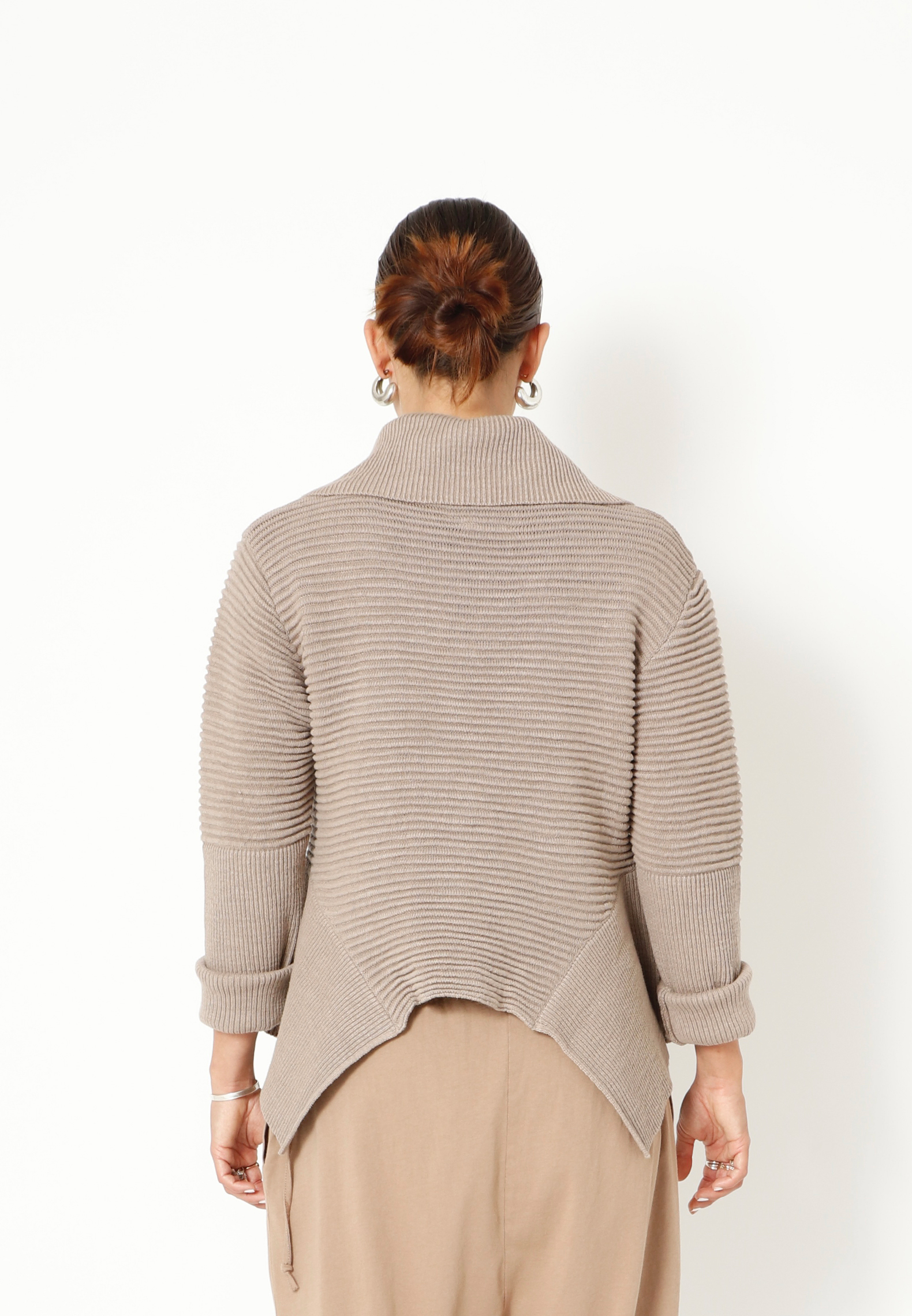 Strikbluse med krave og knapper. Blusen har lange ærmer og er asymmetrisk forneden. Blusen er lavet i en lækker blød blanding af bomuld og hør. Findes i flere farver.