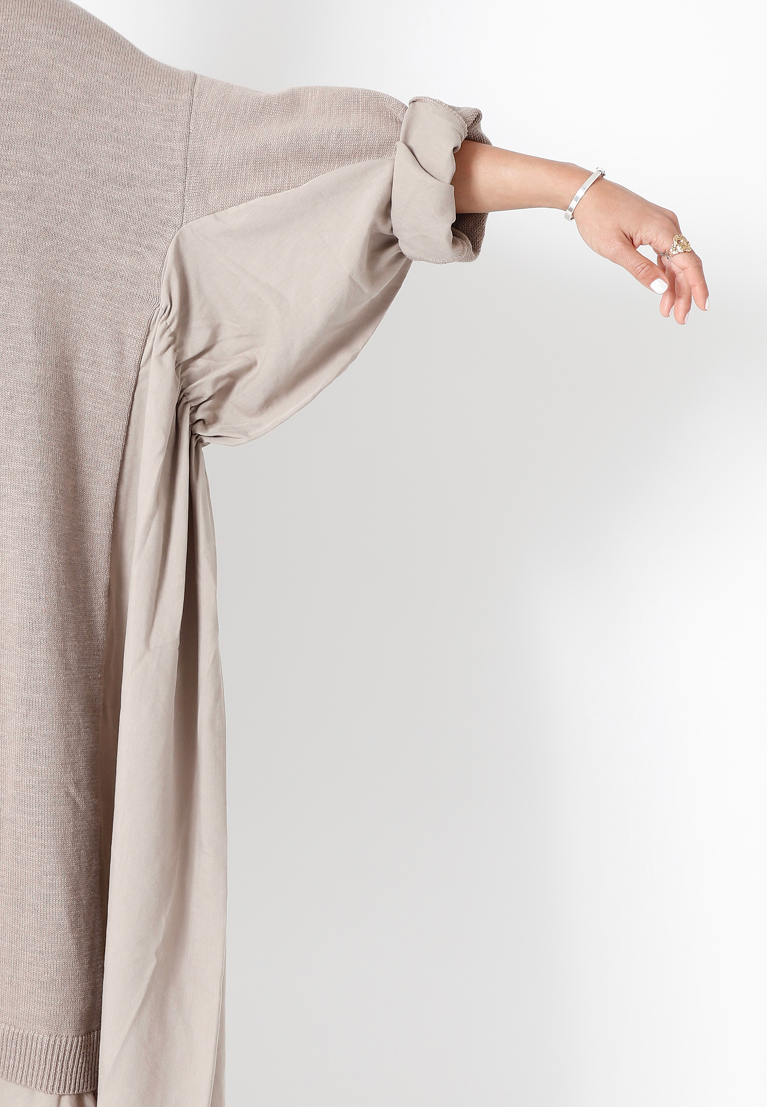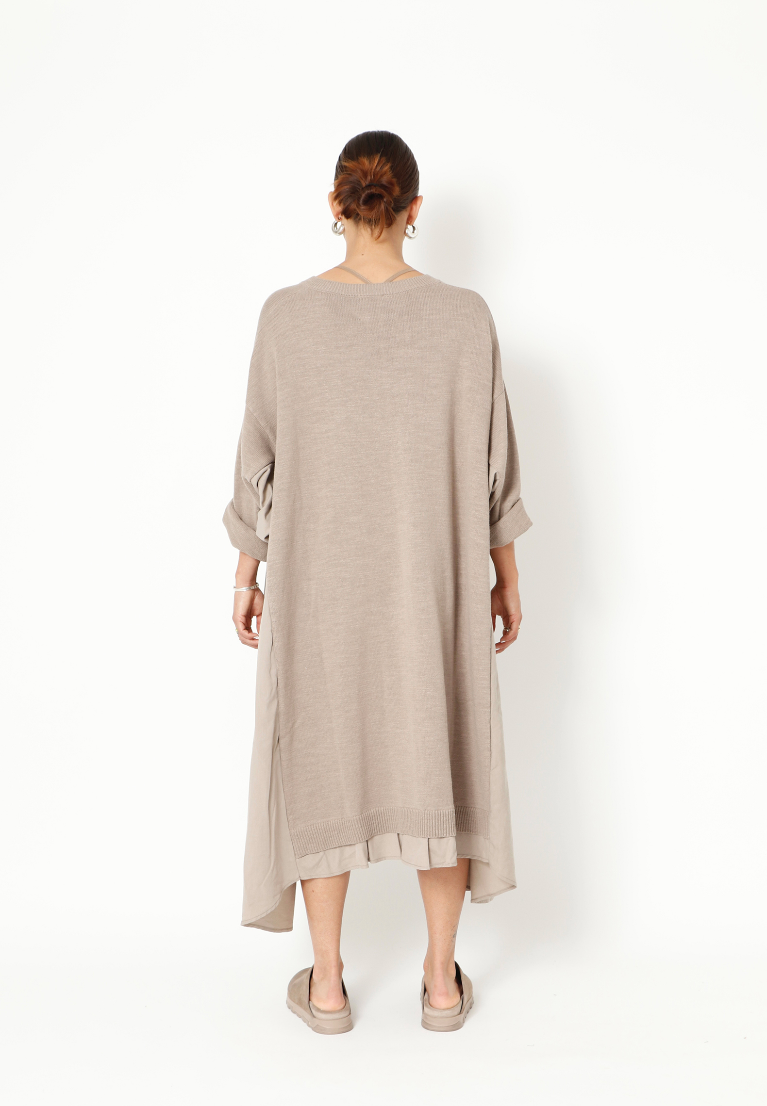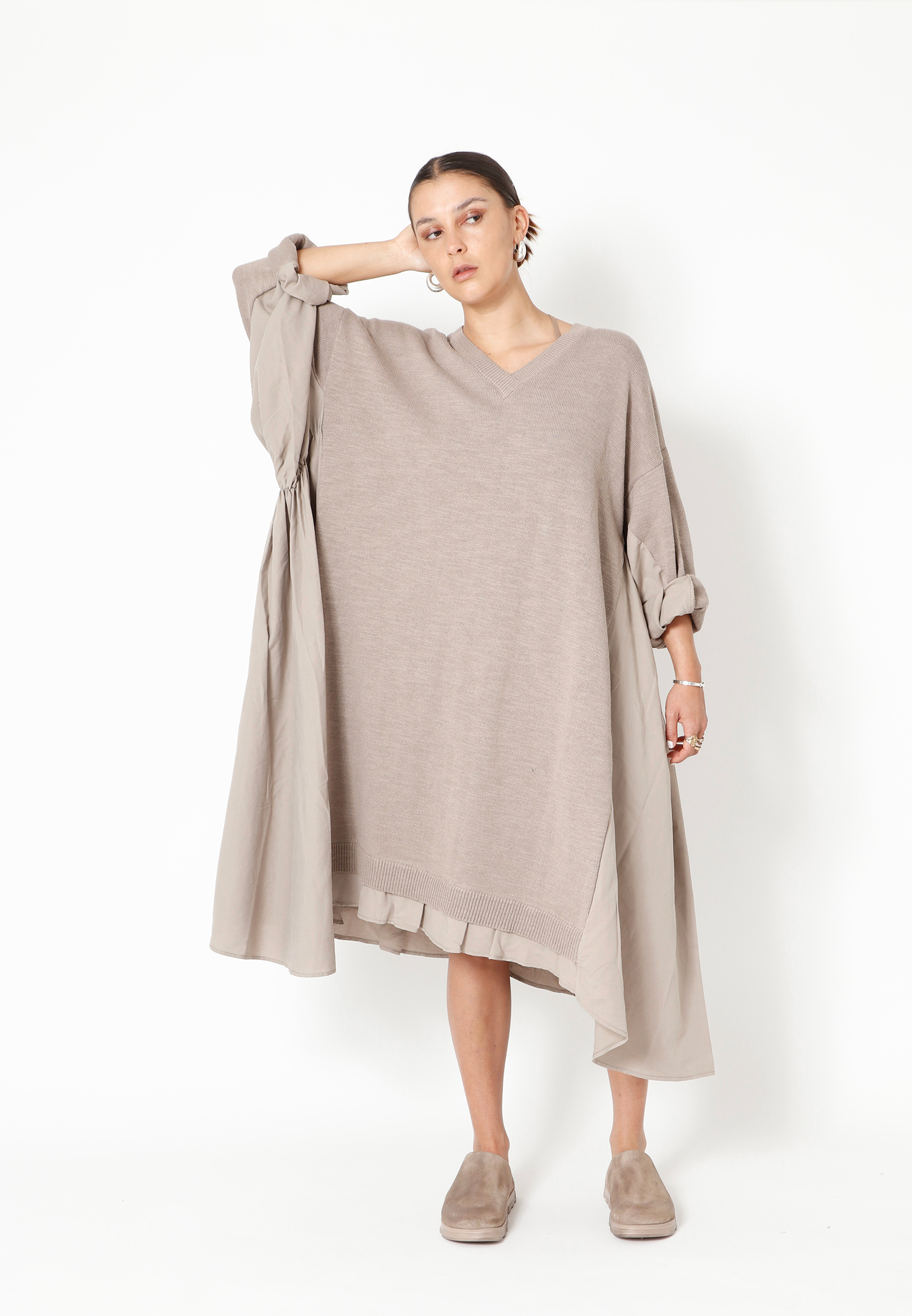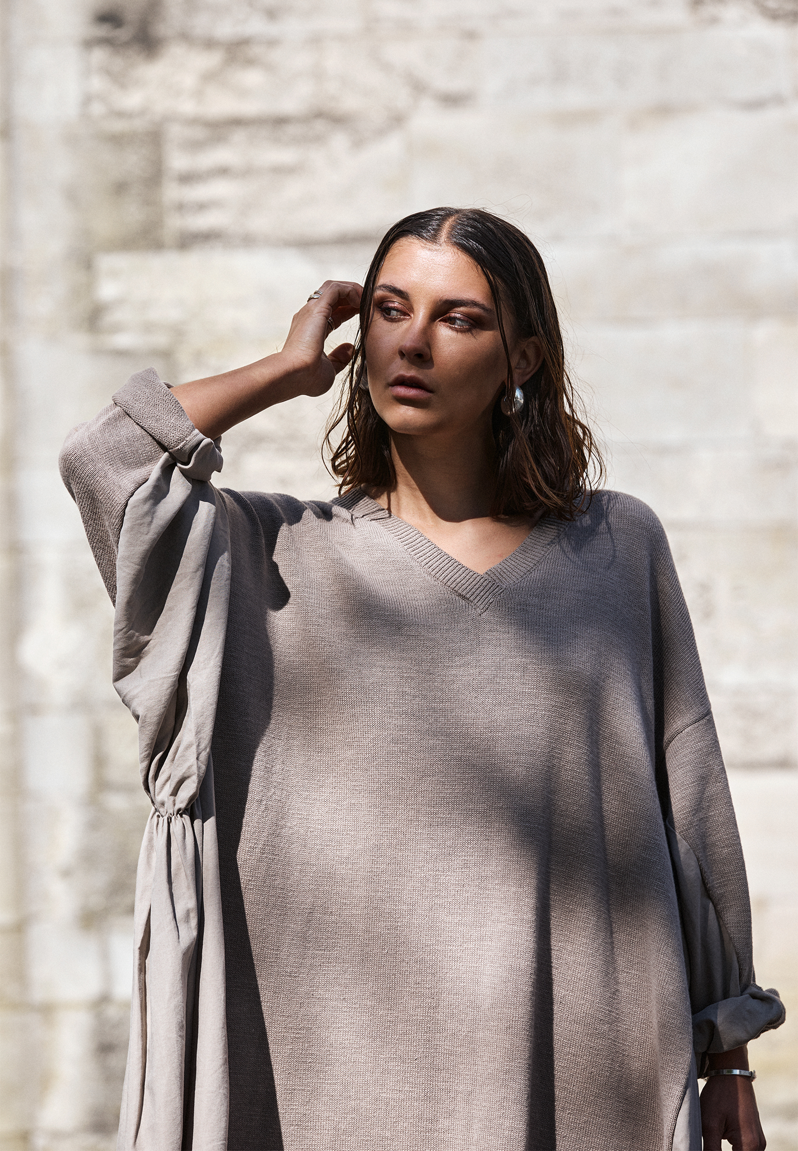 Oversized strikkjole med v-hals og brede ærmer med rynk-effekt lavet i en lækker blanding af bomuld og hør. Findes i flere farver.