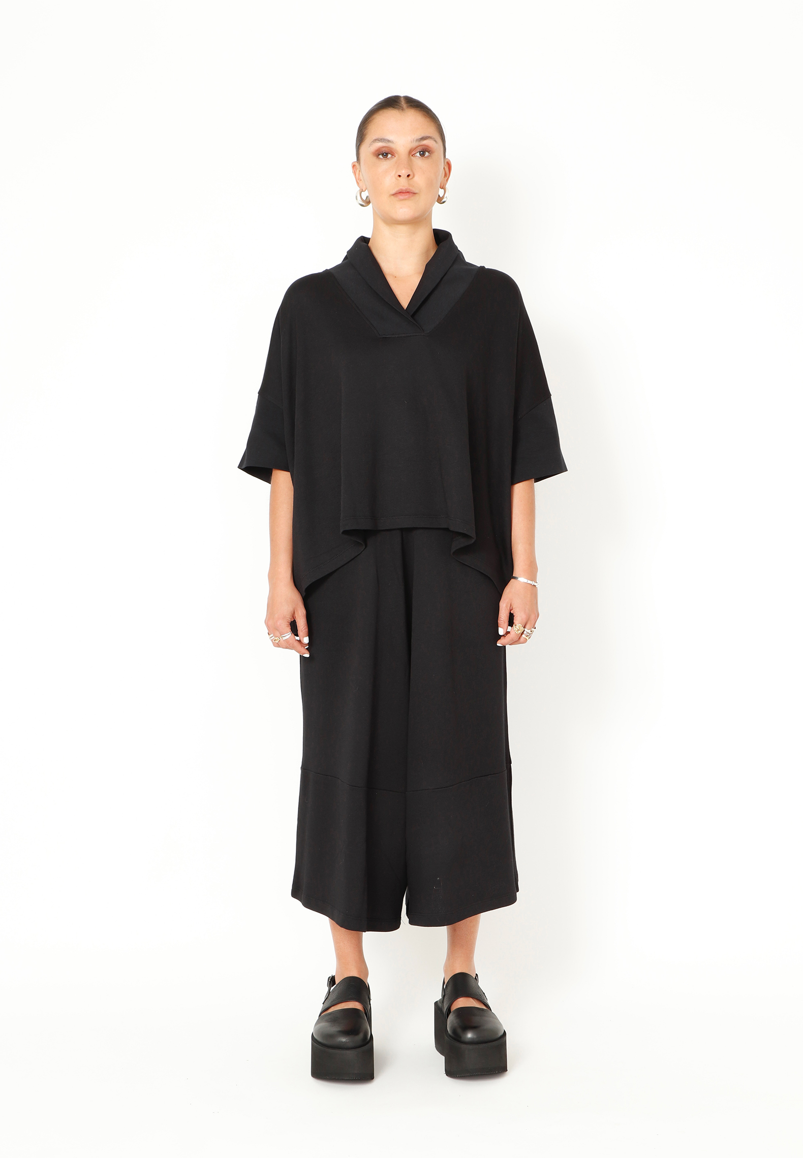 3/4 bukser med vide ben, bred elastik i taljen og lommer. Lavet i en eksklusiv blød sweatkvalitet med et moderne og casual look. Alt Sort Aarhus tøj er produceret i Portugal af nøje udvalgte lokale materialer og kvaliteter med fokus på design og pasform.