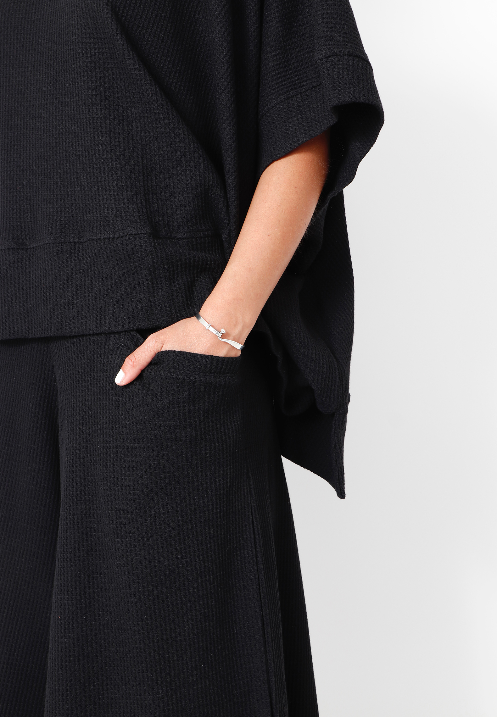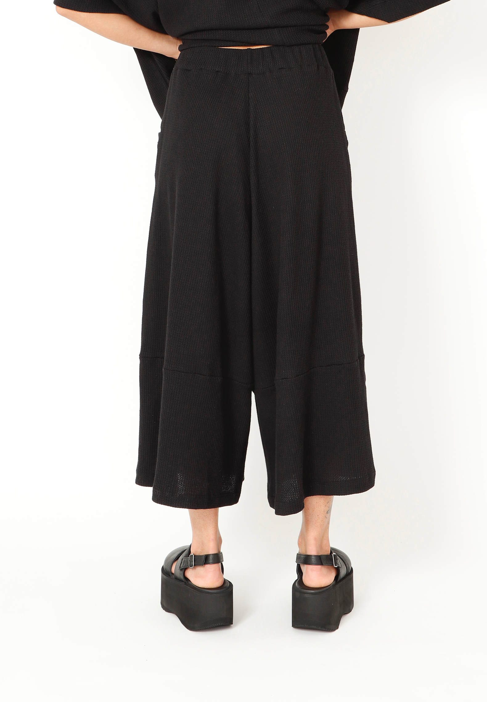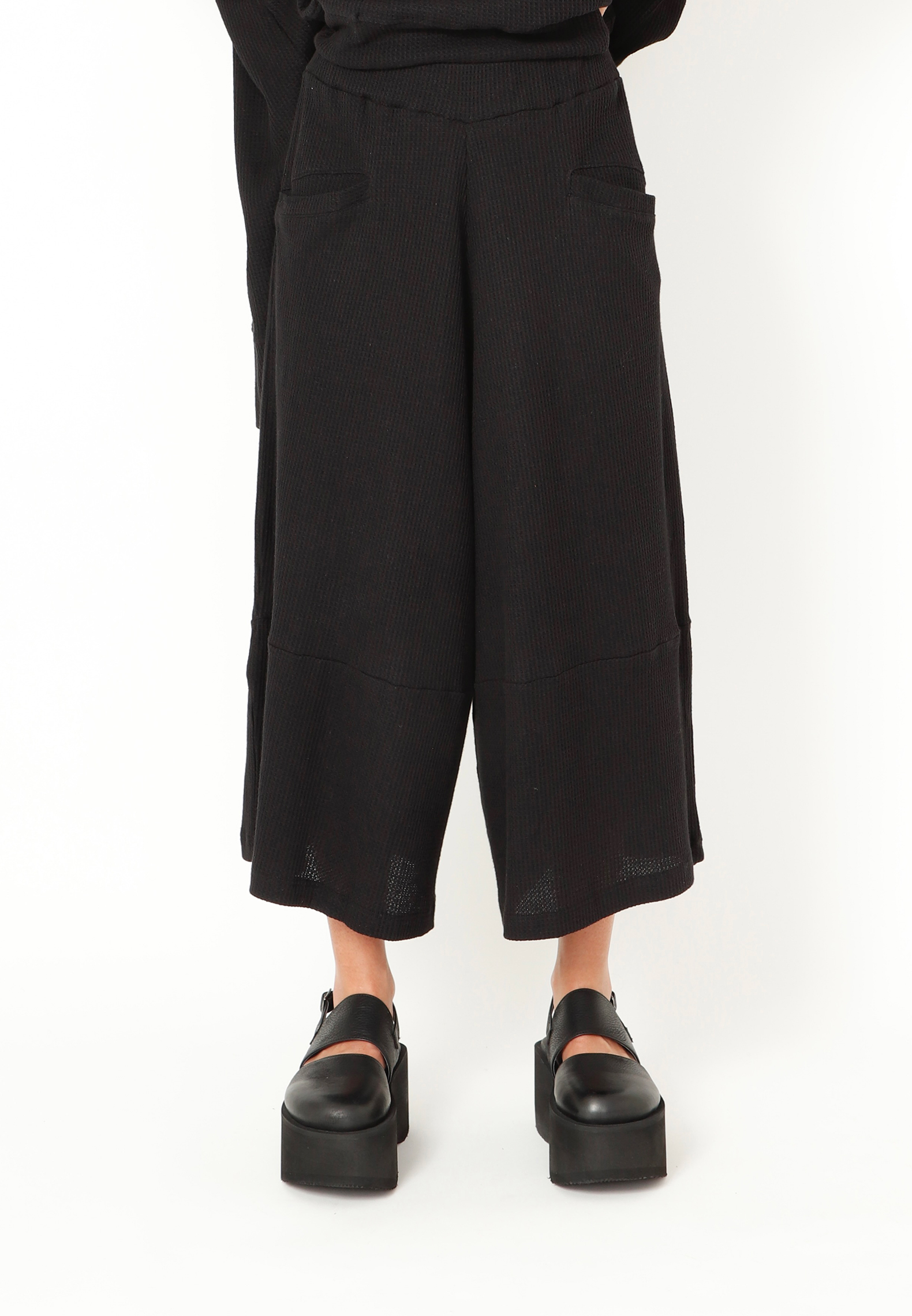 3/4 bukser med vide ben, bred elastik i taljen og lommer. Lavet i en eksklusiv bomuld/hør blanding med flot struktur. Alt Sort Aarhus tøj er produceret i Portugal af nøje udvalgte lokale materialer og kvaliteter med fokus på design og pasform.