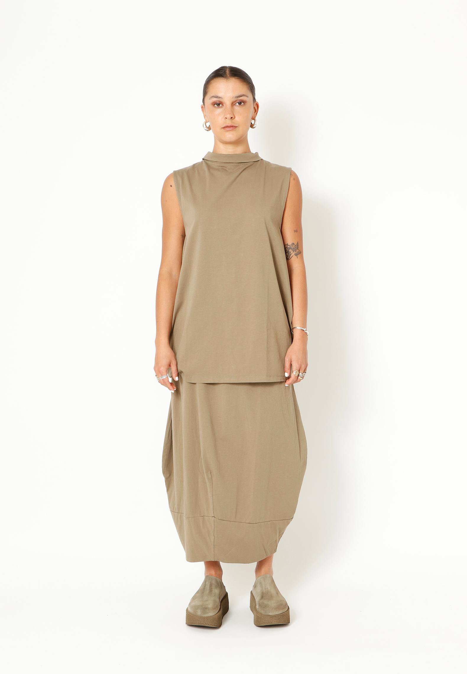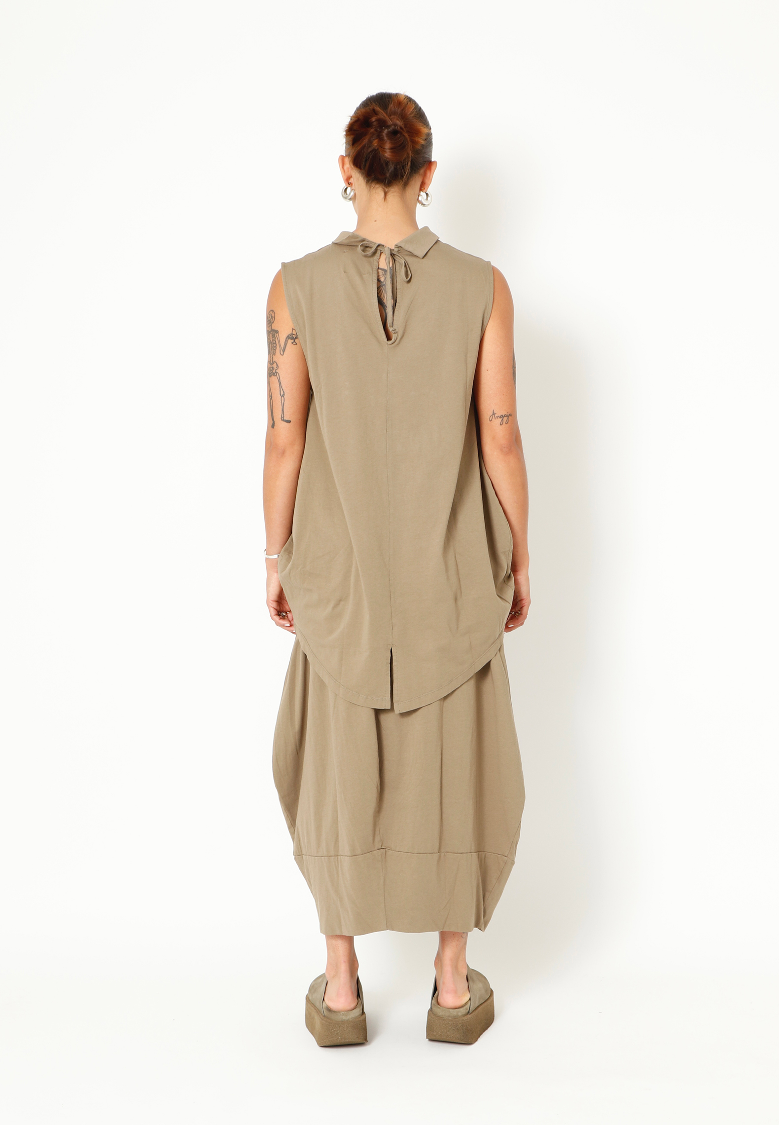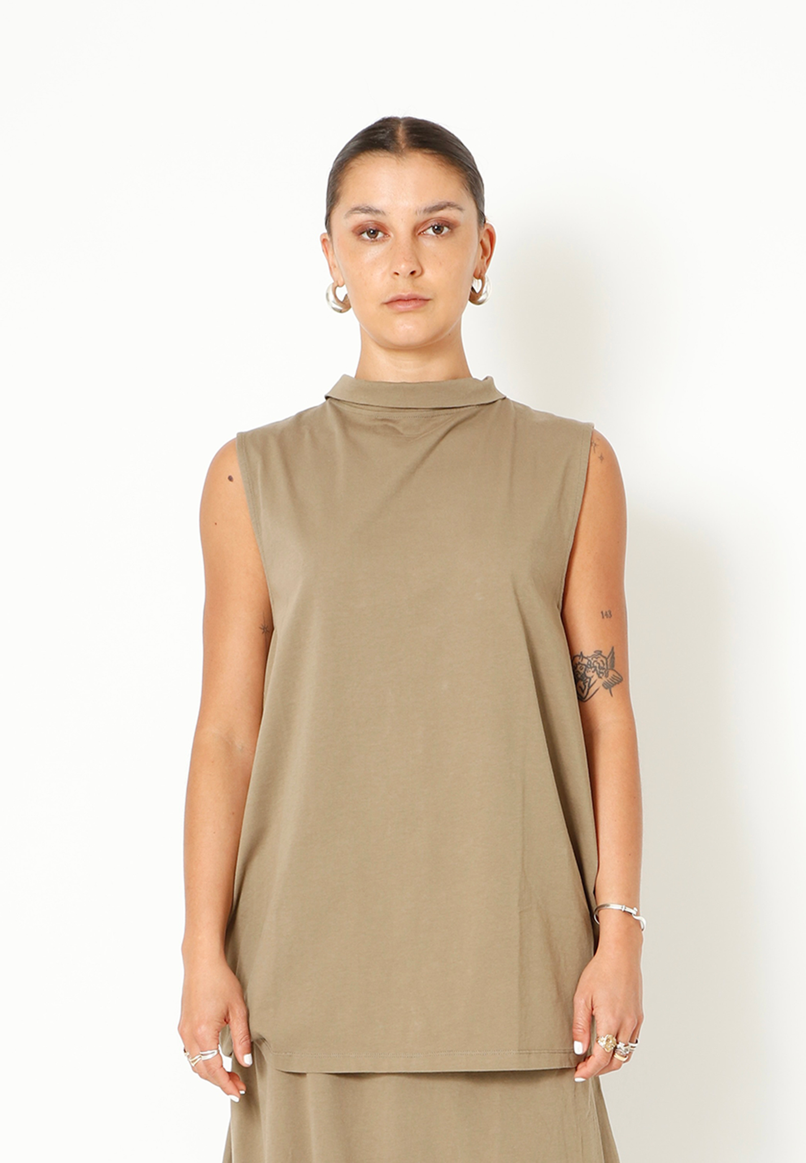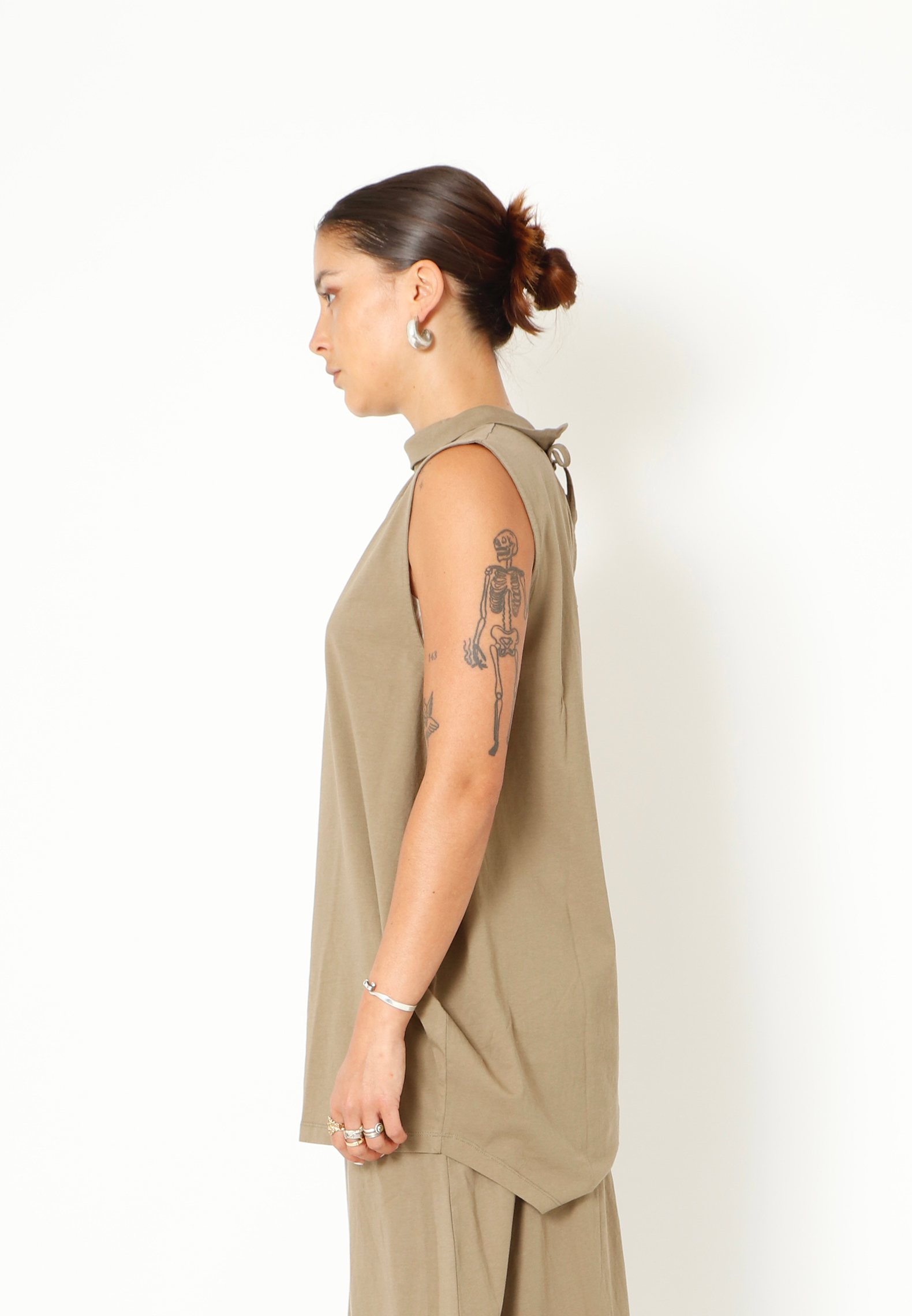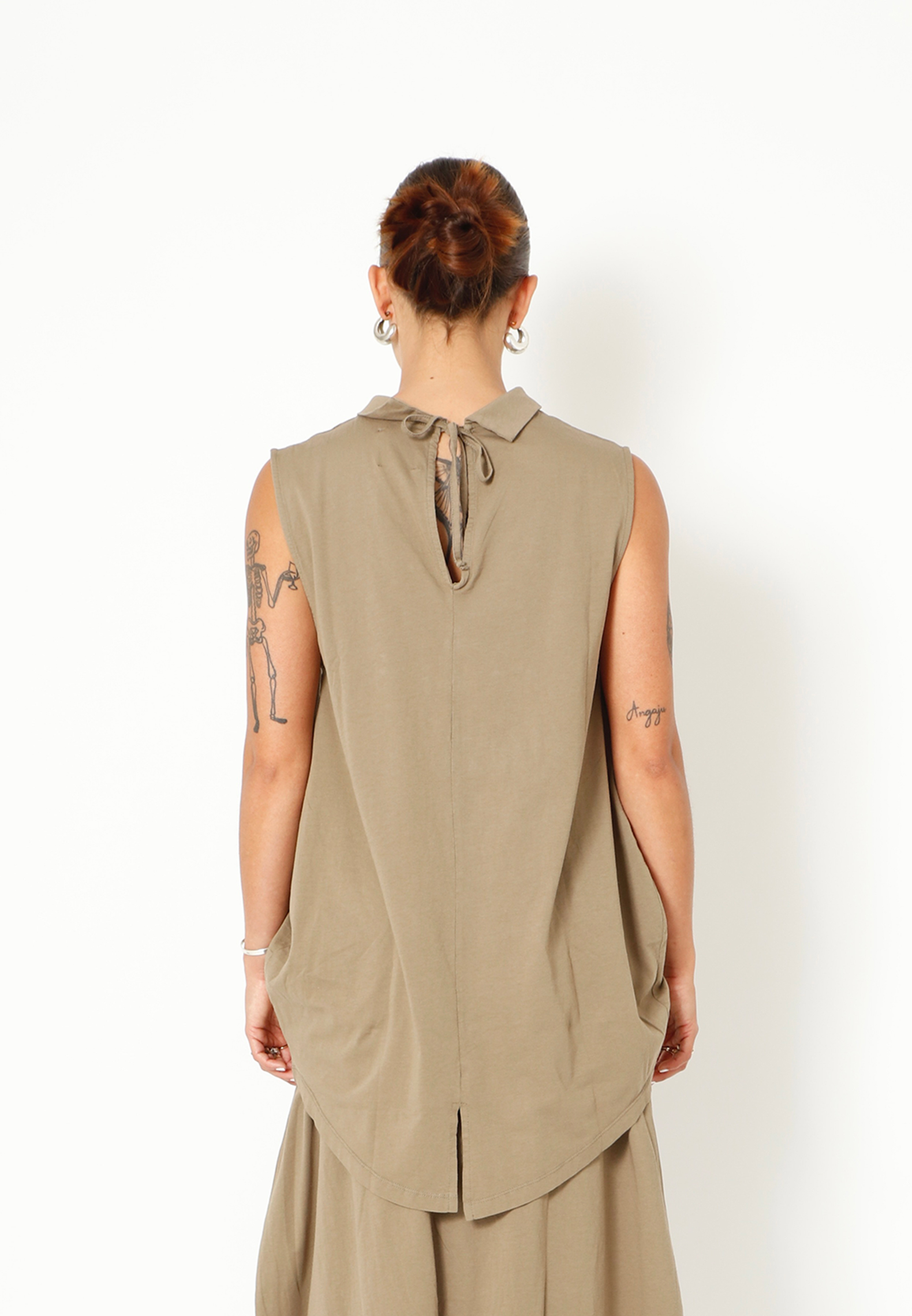 Sleeveless blouse in organic cotton with neck tie. The blouse is longer on the back and comes with a split.