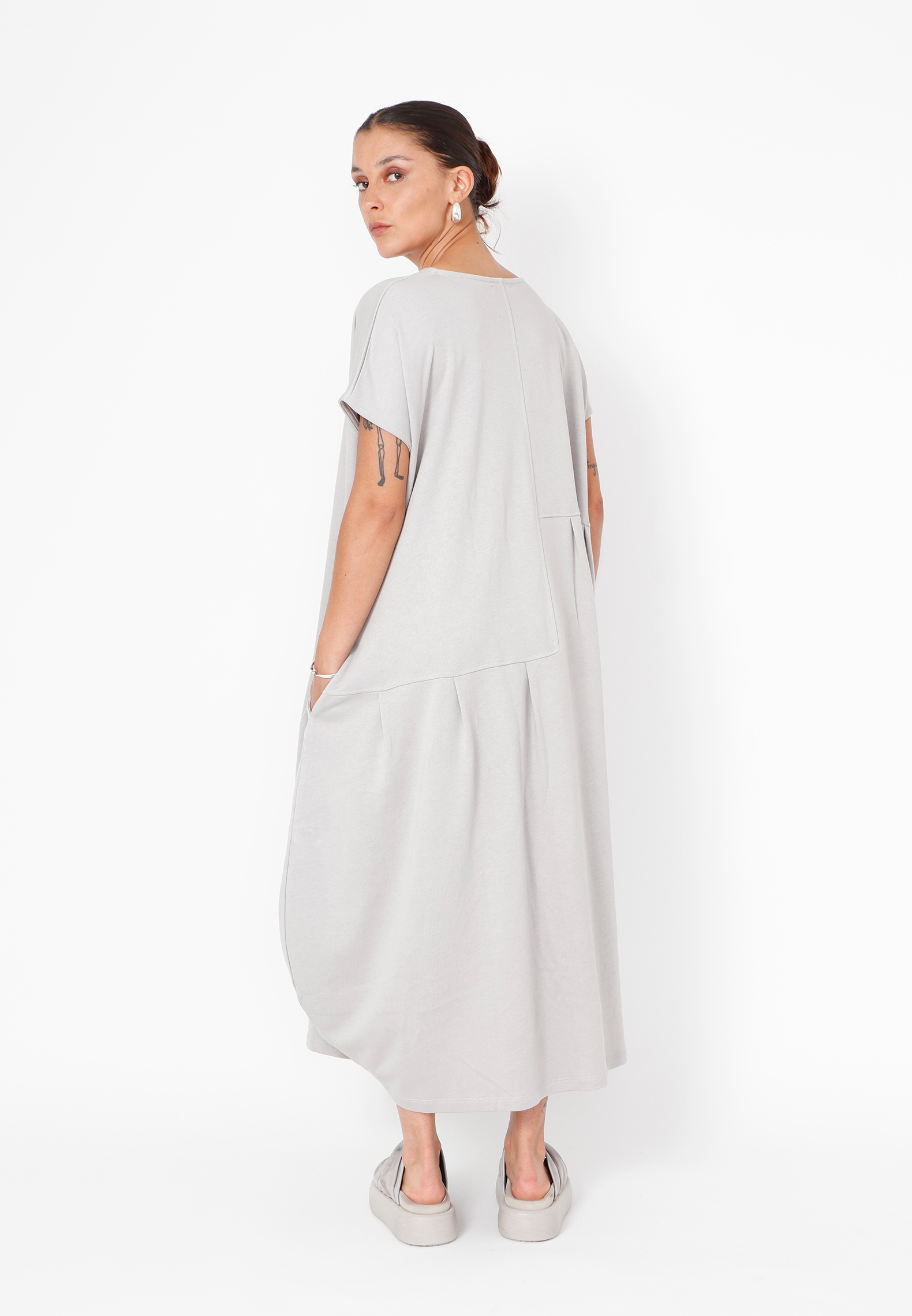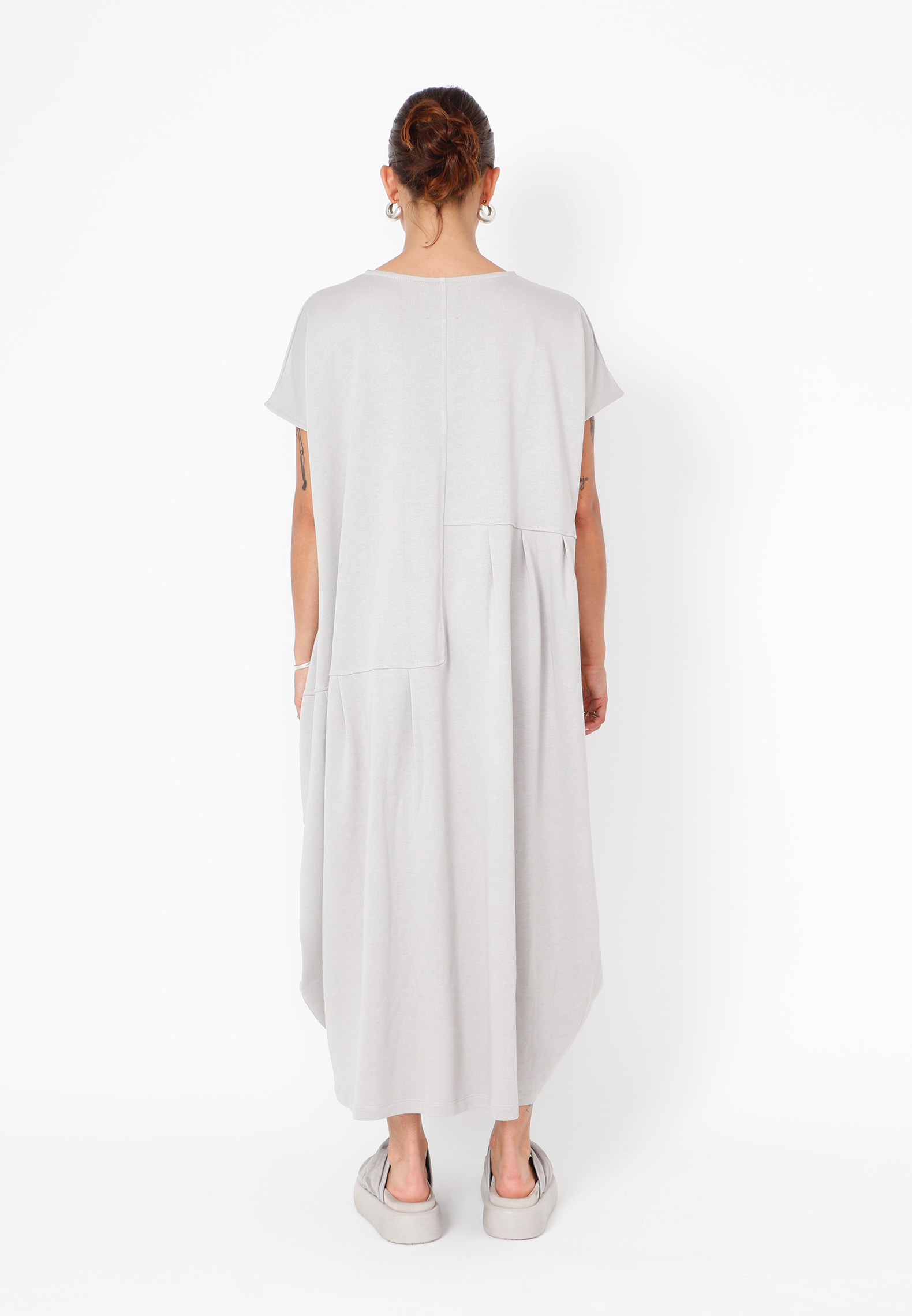 Oversize kjole med asymetriske læg. Lavet i en eksklusiv blød sweatkvalitet med et moderne og casual look. Alt Sort Aarhus tøj er produceret i Portugal af nøje udvalgte lokale materialer og kvaliteter med fokus på design og pasform.