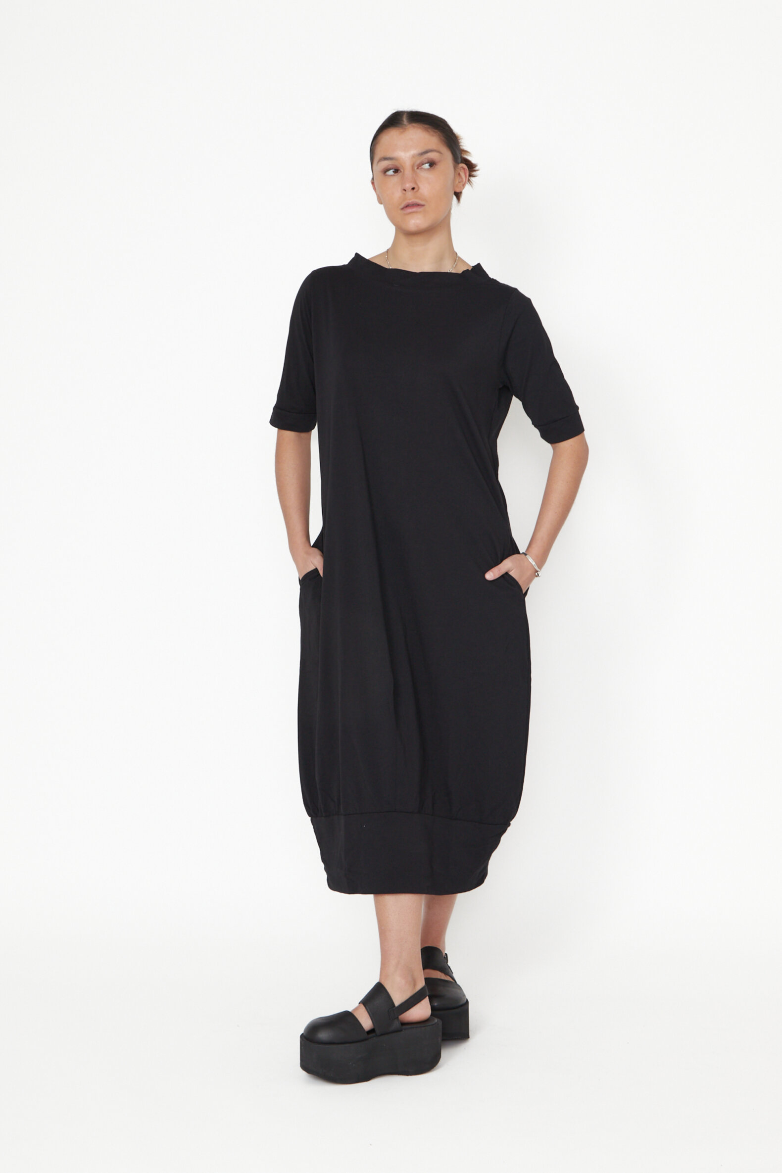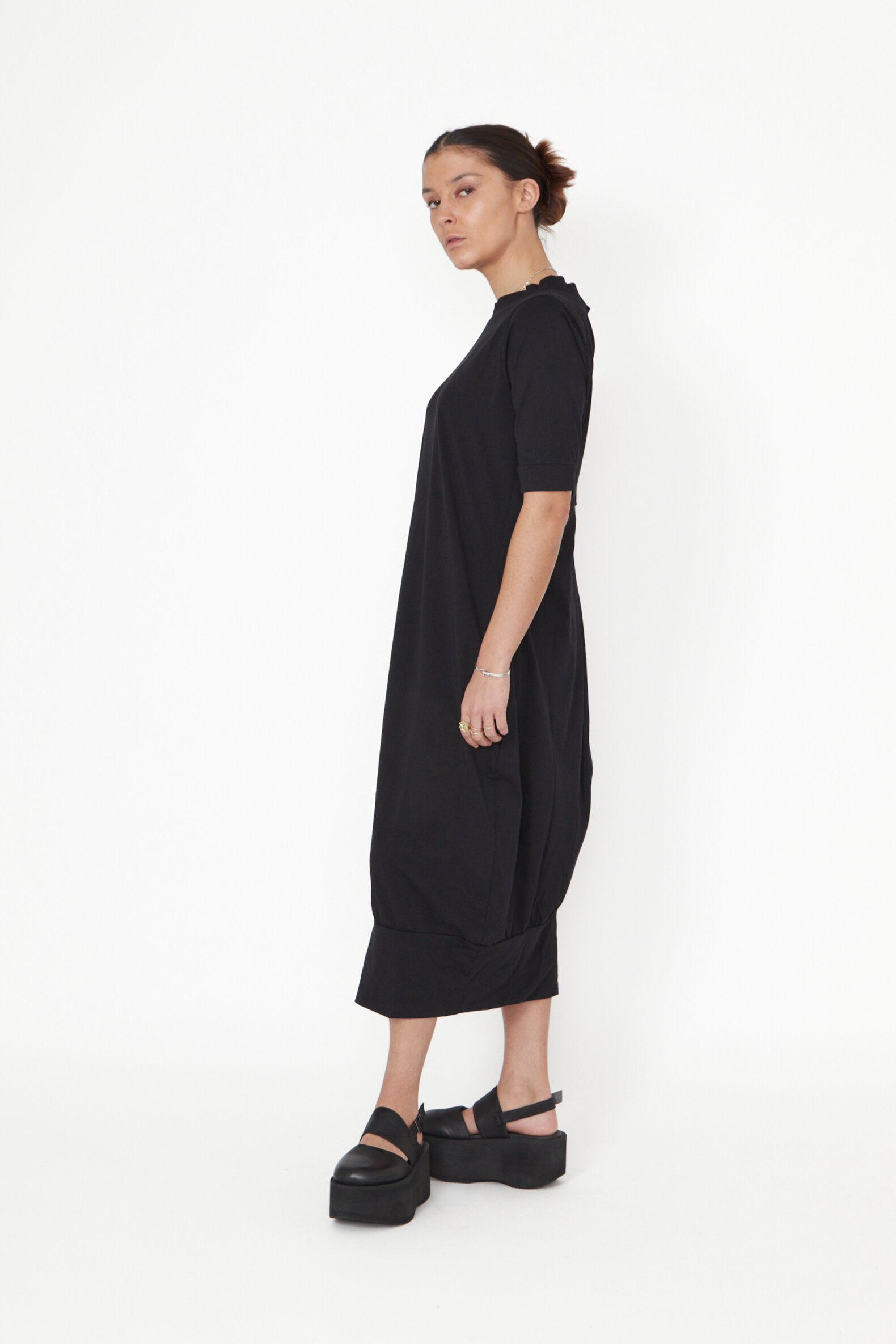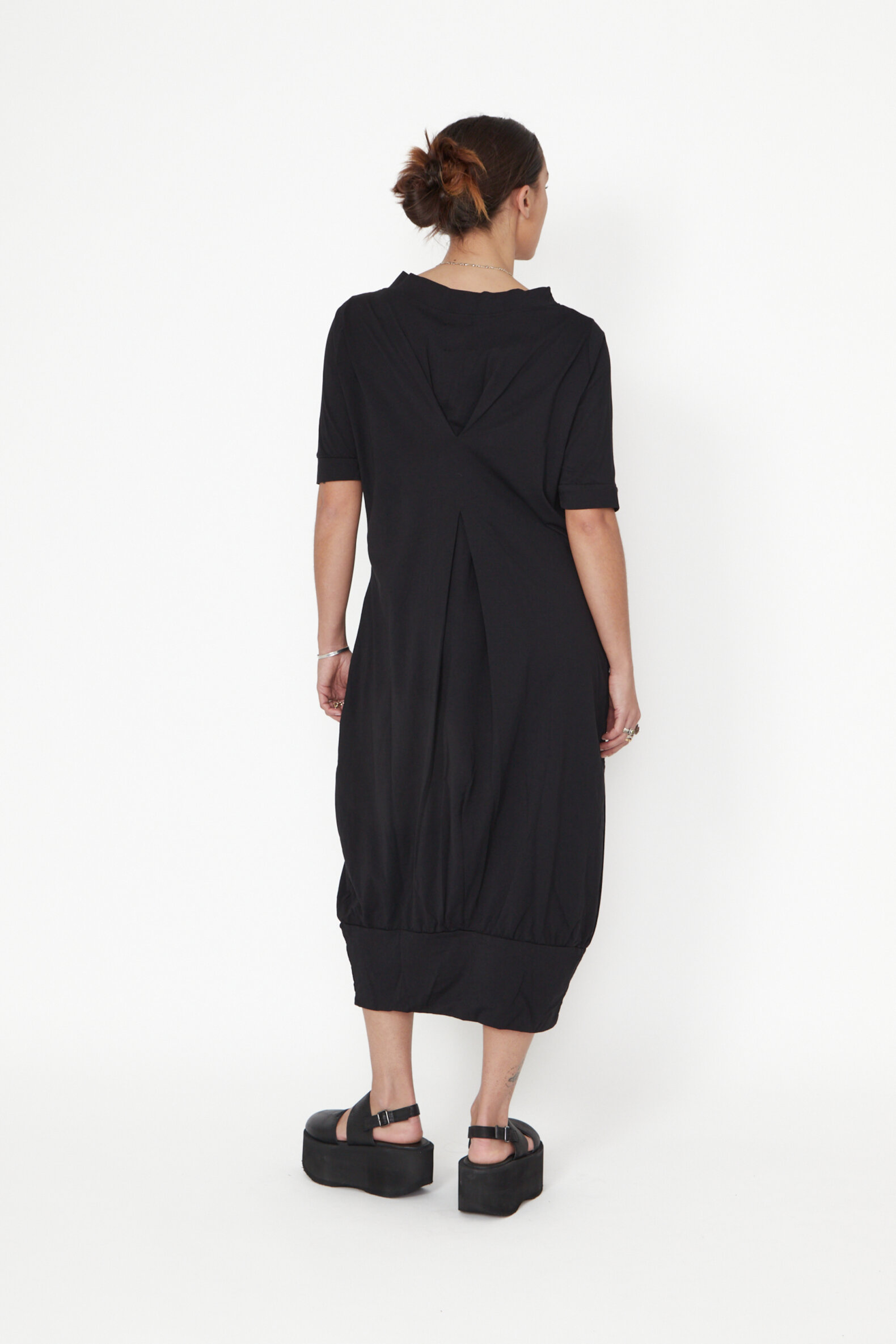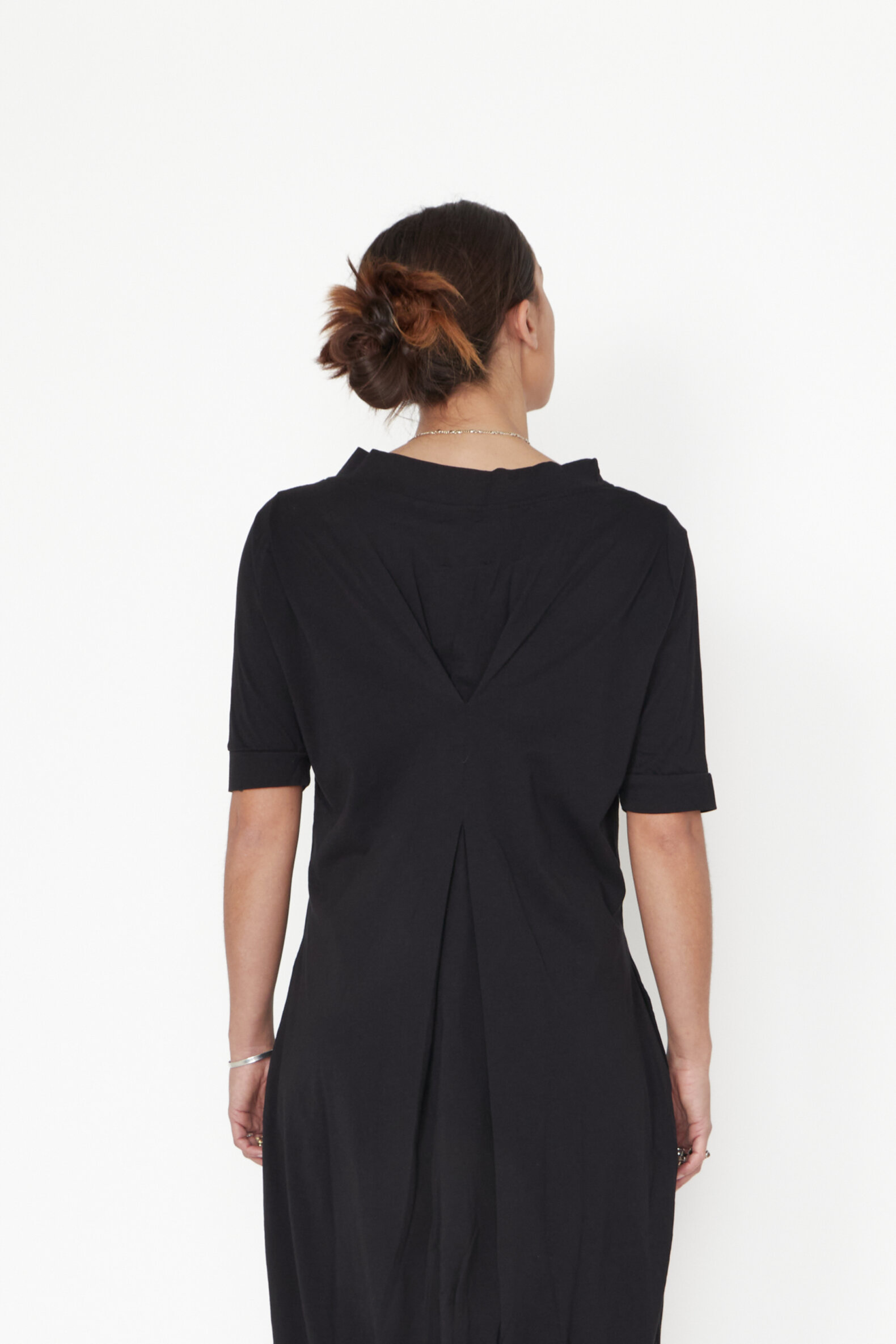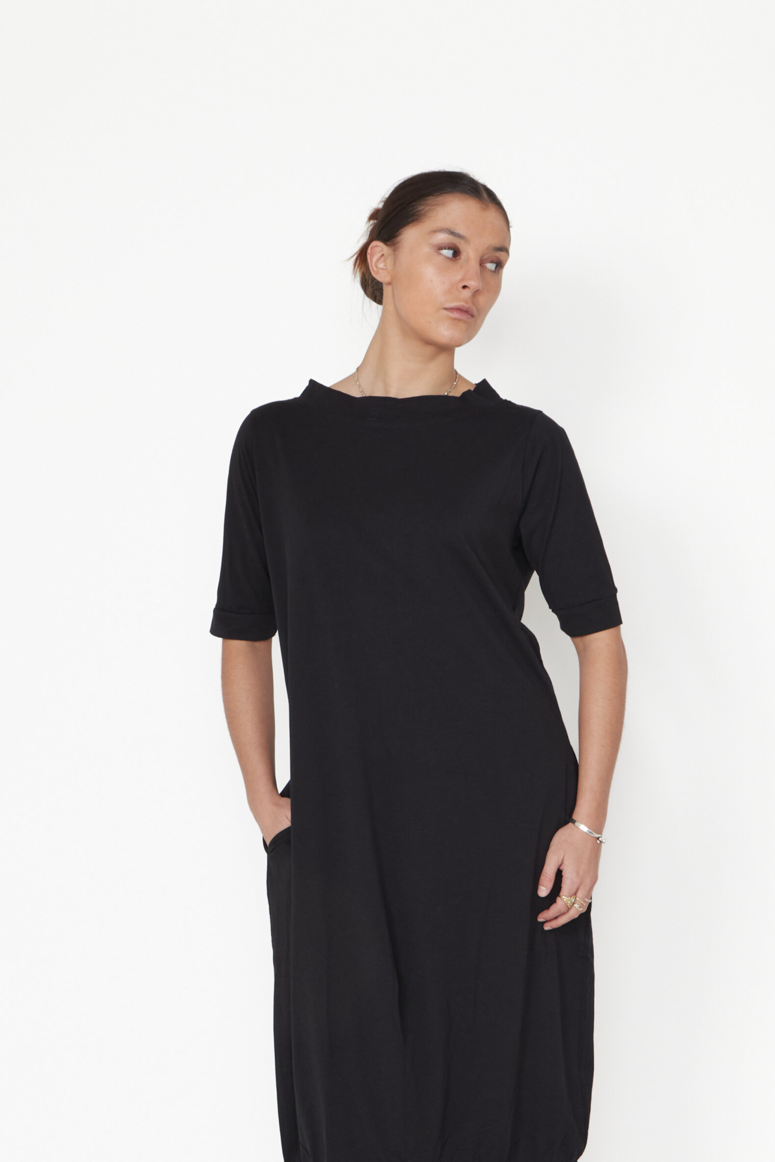 Kjole i økologisk bomuld med fin detalje bag på. Kjolen har bådudskæring og brede kanter ved ærmer og forneden.