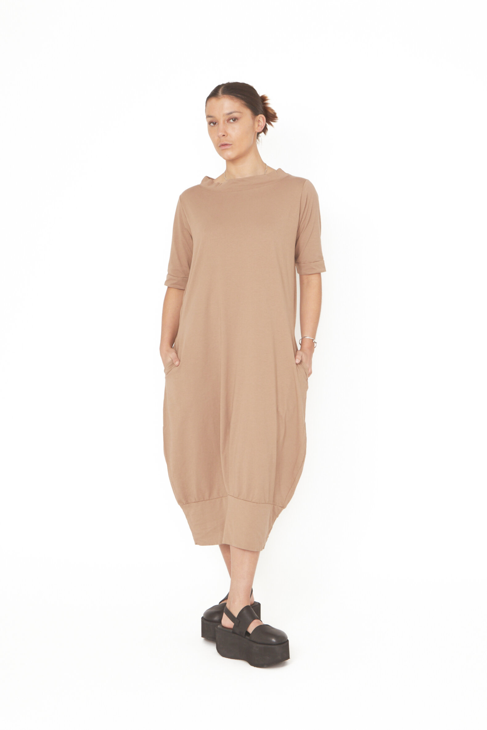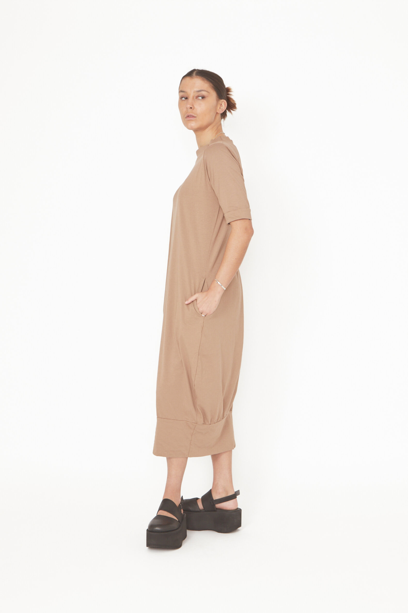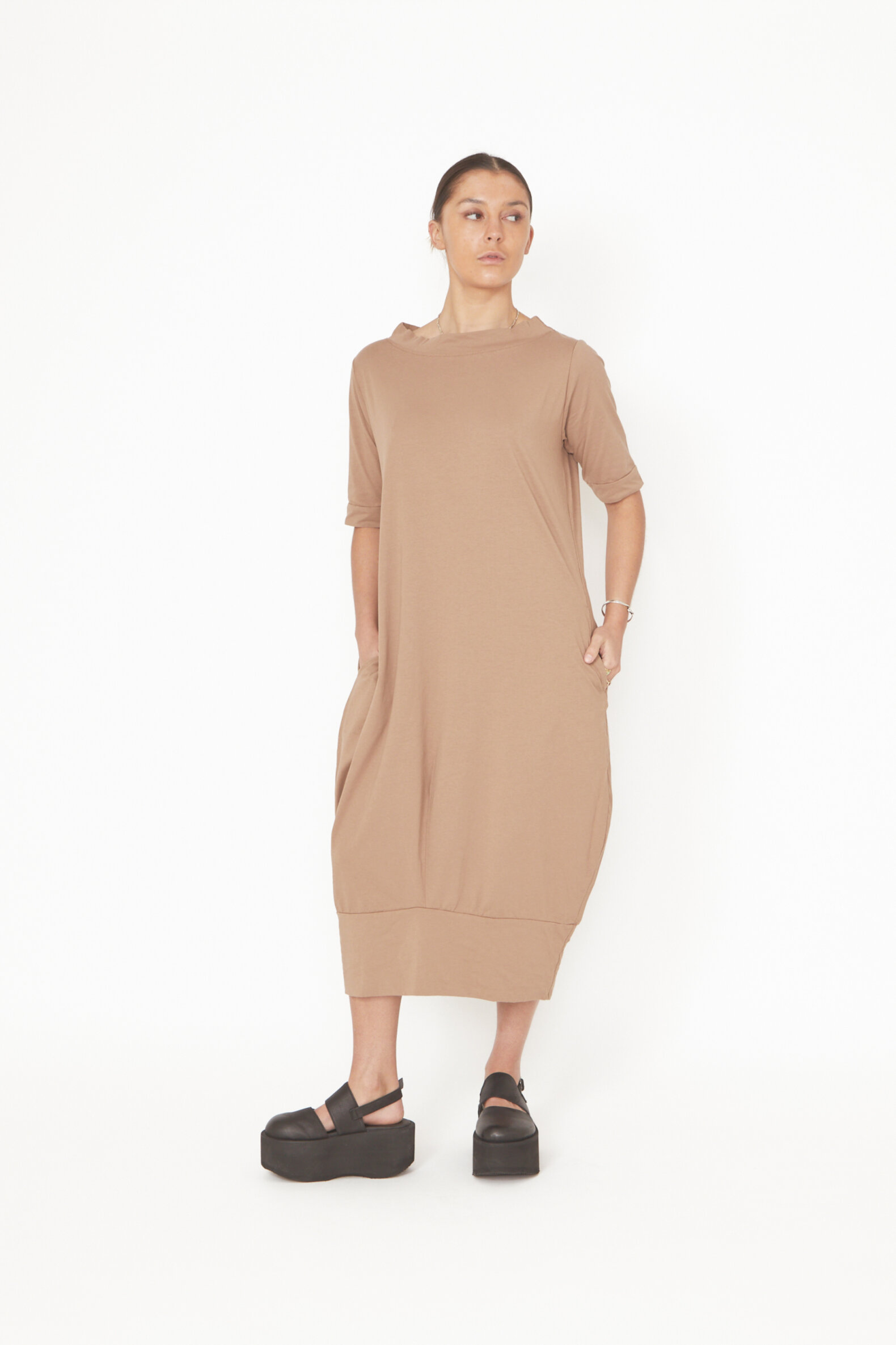 Dress in organic cotton with a boatneck and a nice detail on the back. The dress comes with wide edges on the sleeves and the button.