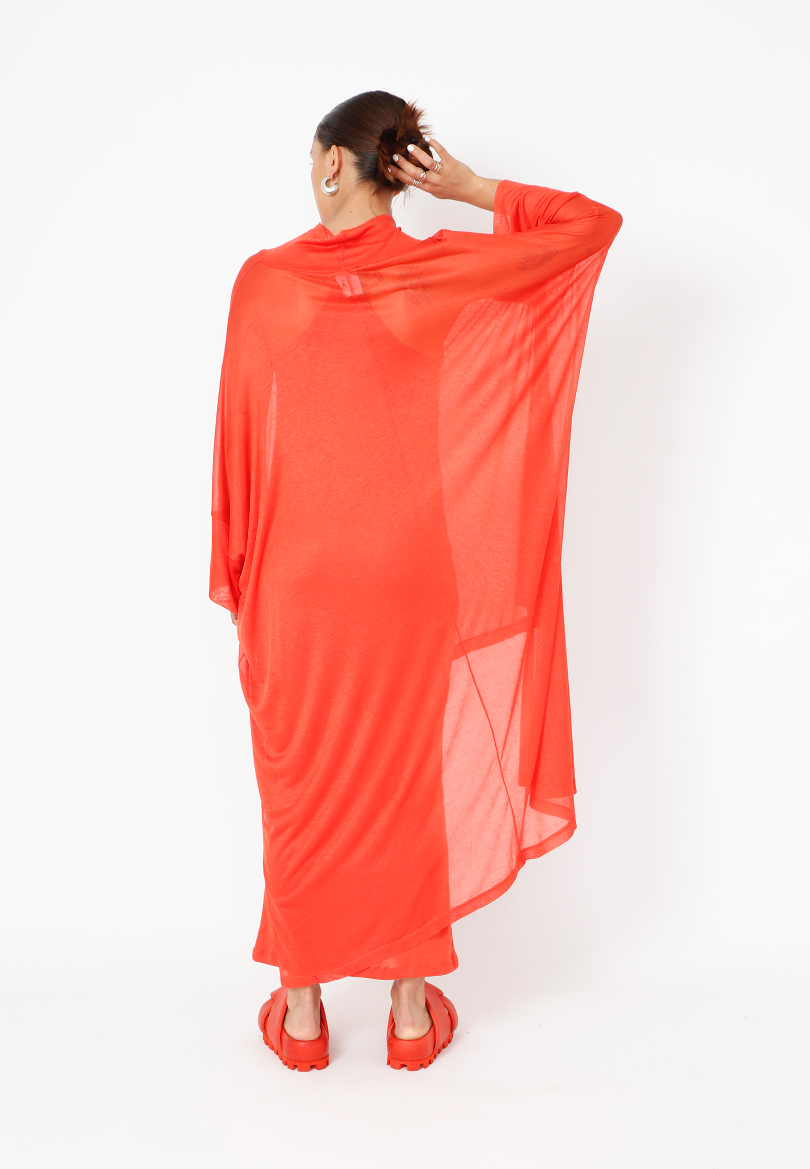 Transparent kjole med asymmetrisk silhuet som er længere bagpå og kortere foran. Kjolen har løse 3/4-ærmer og en klassisk krave. Oplagt til lag-på-lag styling med enten en boxer kjole eller en langærmet basic bluse under.