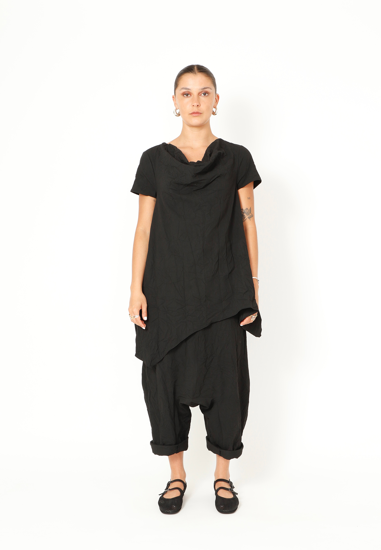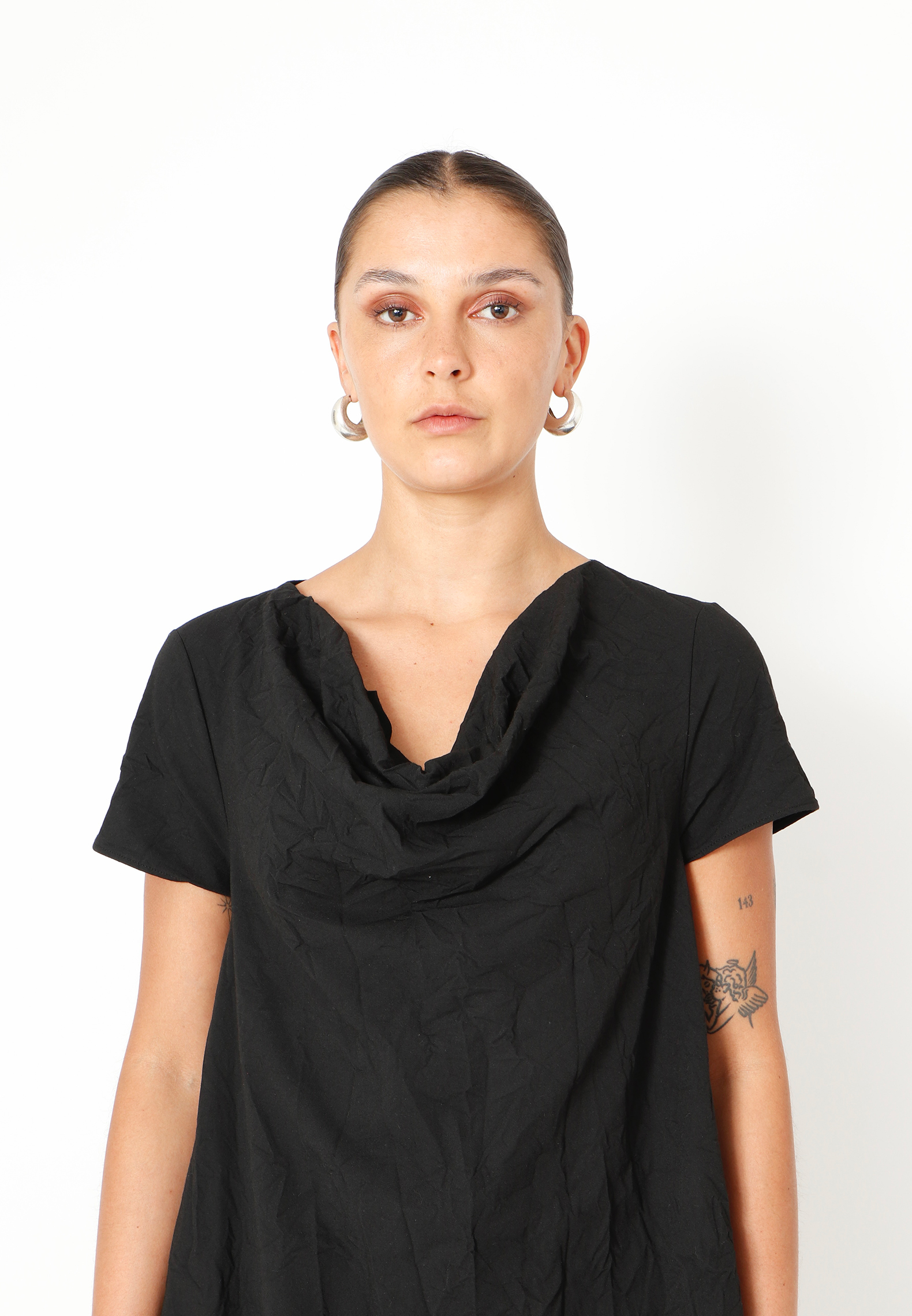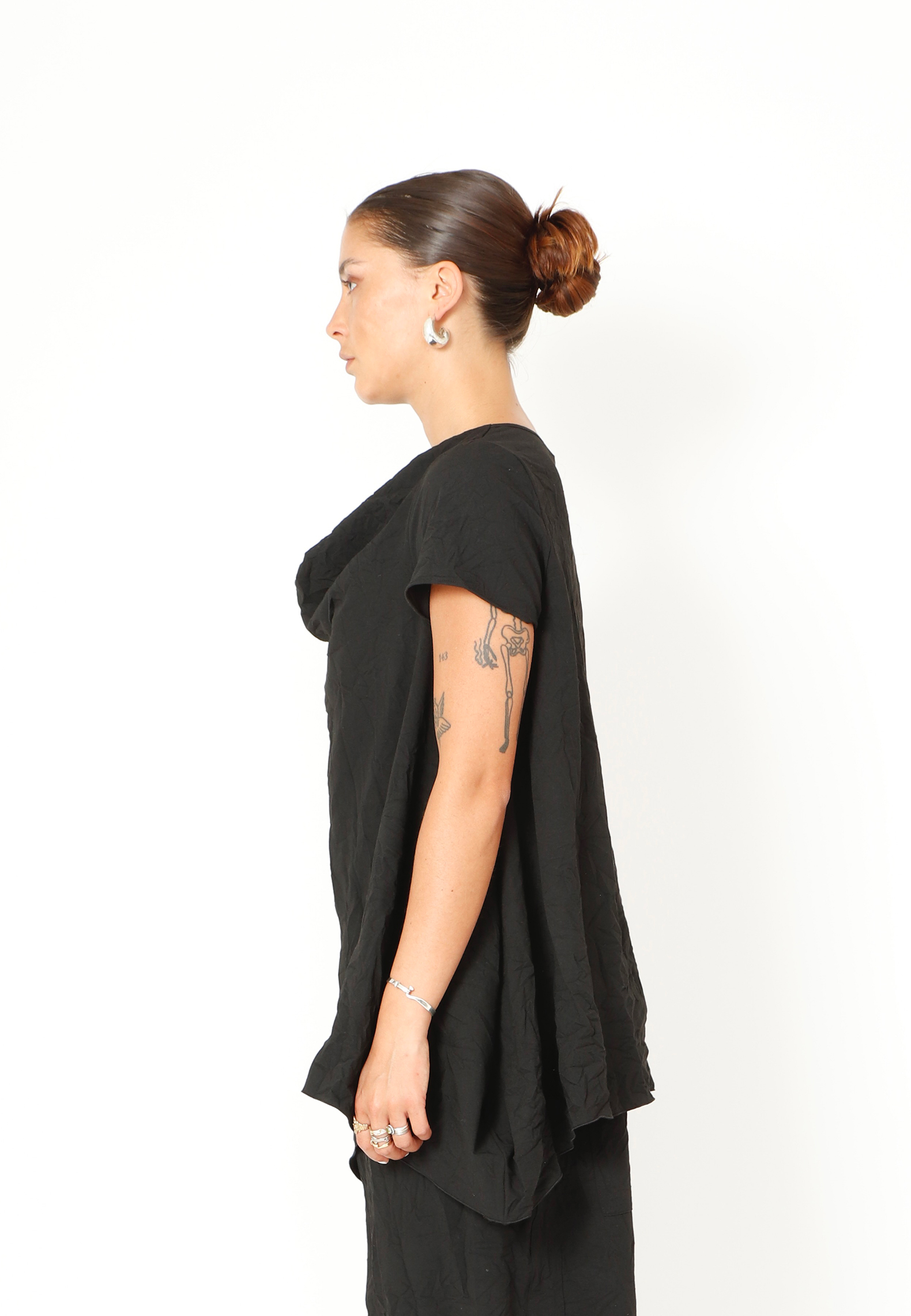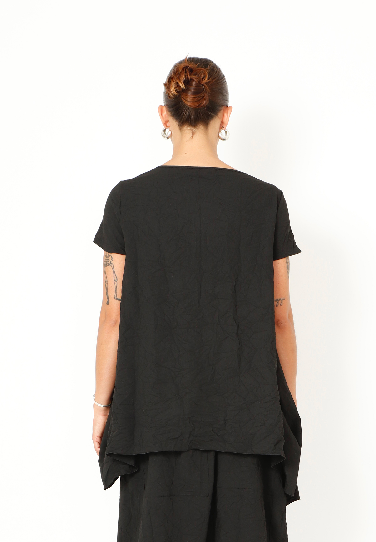 Top med asymmetrisk snit og løs halsudskæring lavet i et let materiale. Toppen findes i flere farver og kvaliteter.