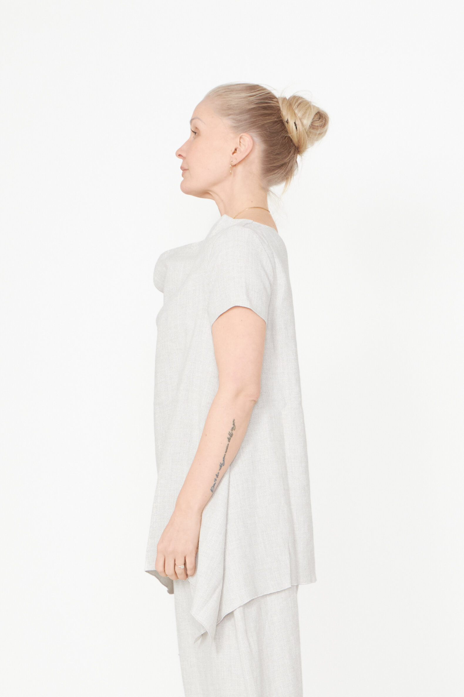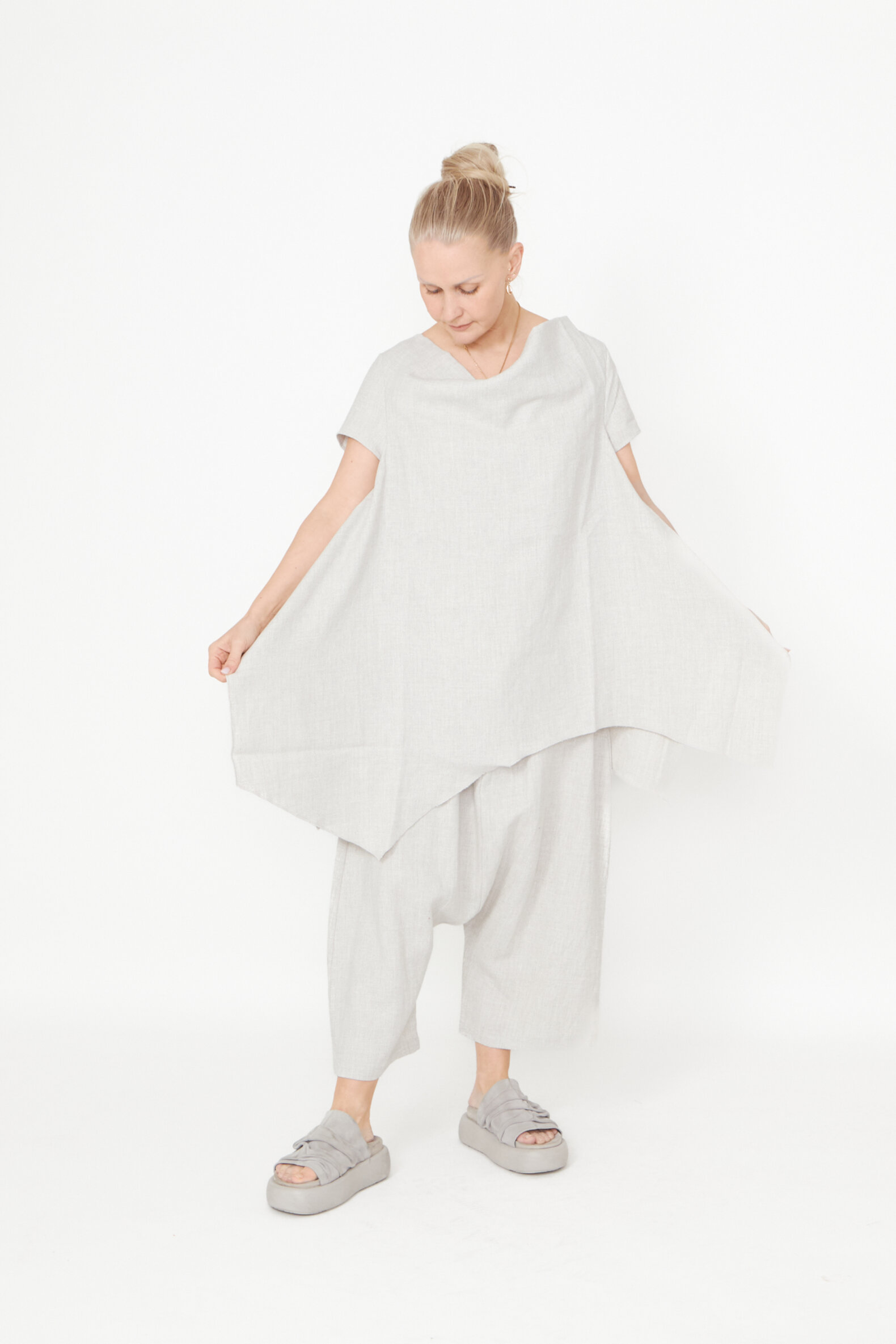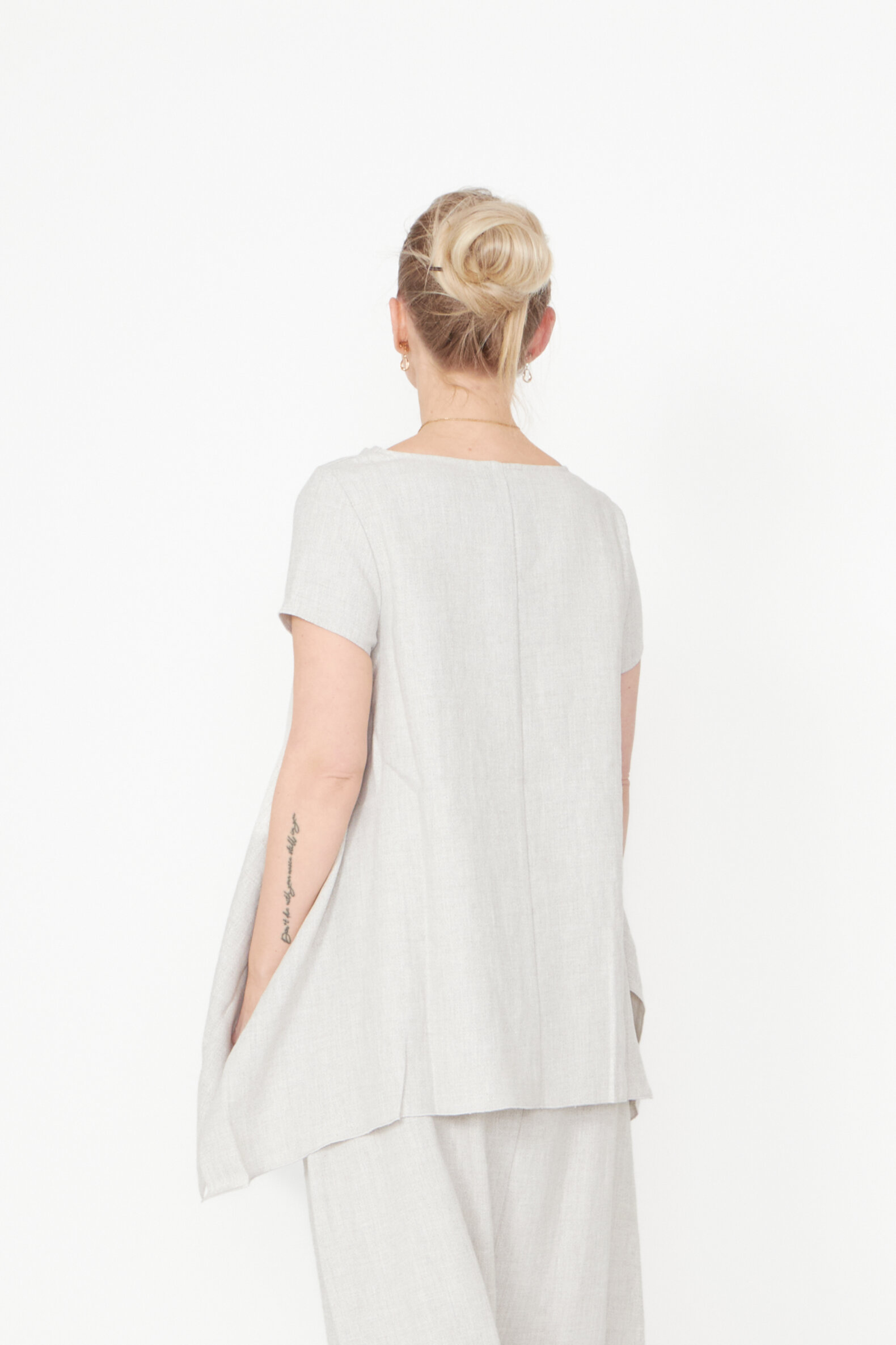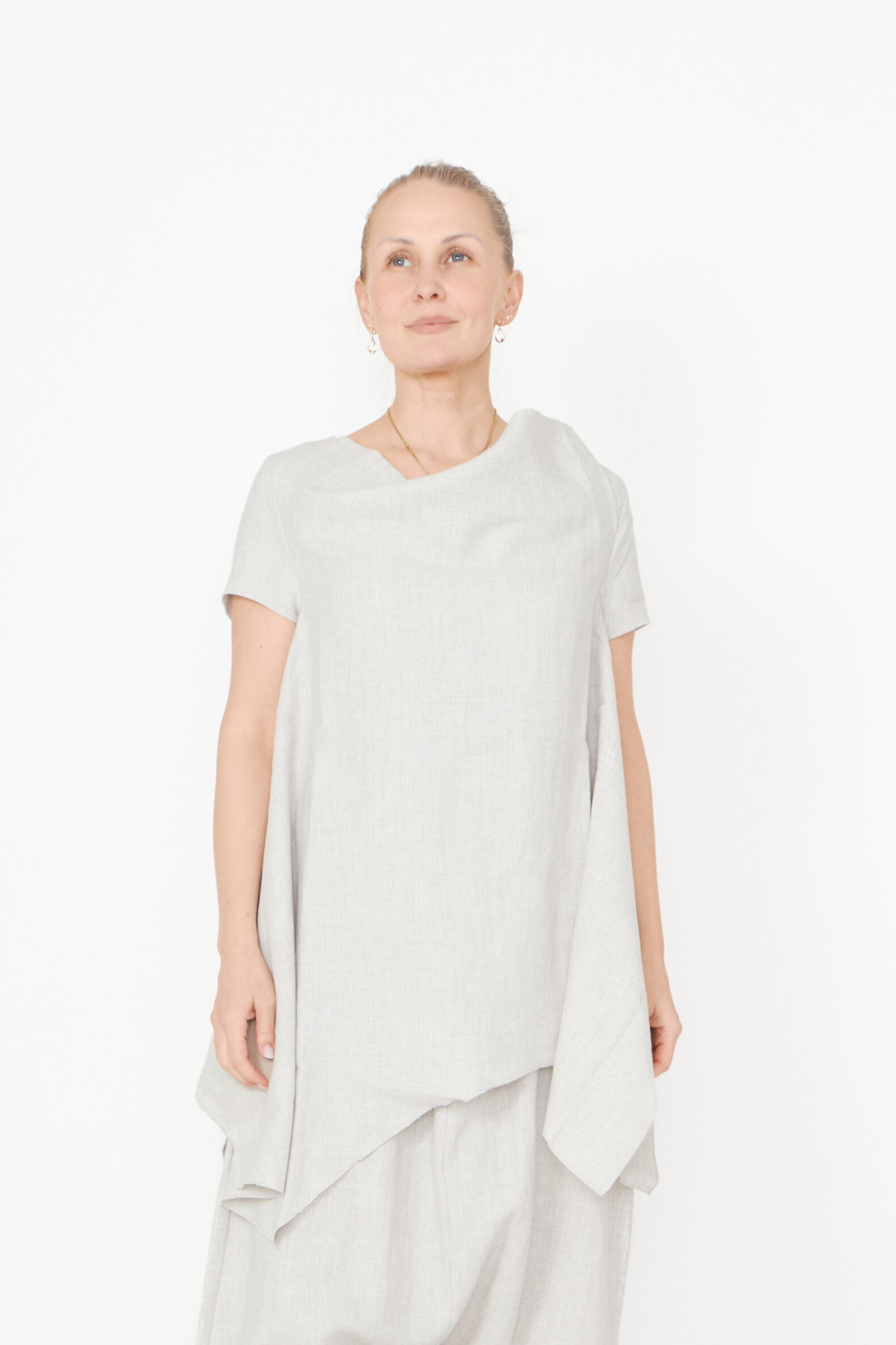 Top med asymmetrisk snit og løs halsudskæring lavet i en let hørblanding. Toppen findes i flere farver og kvaliteter.