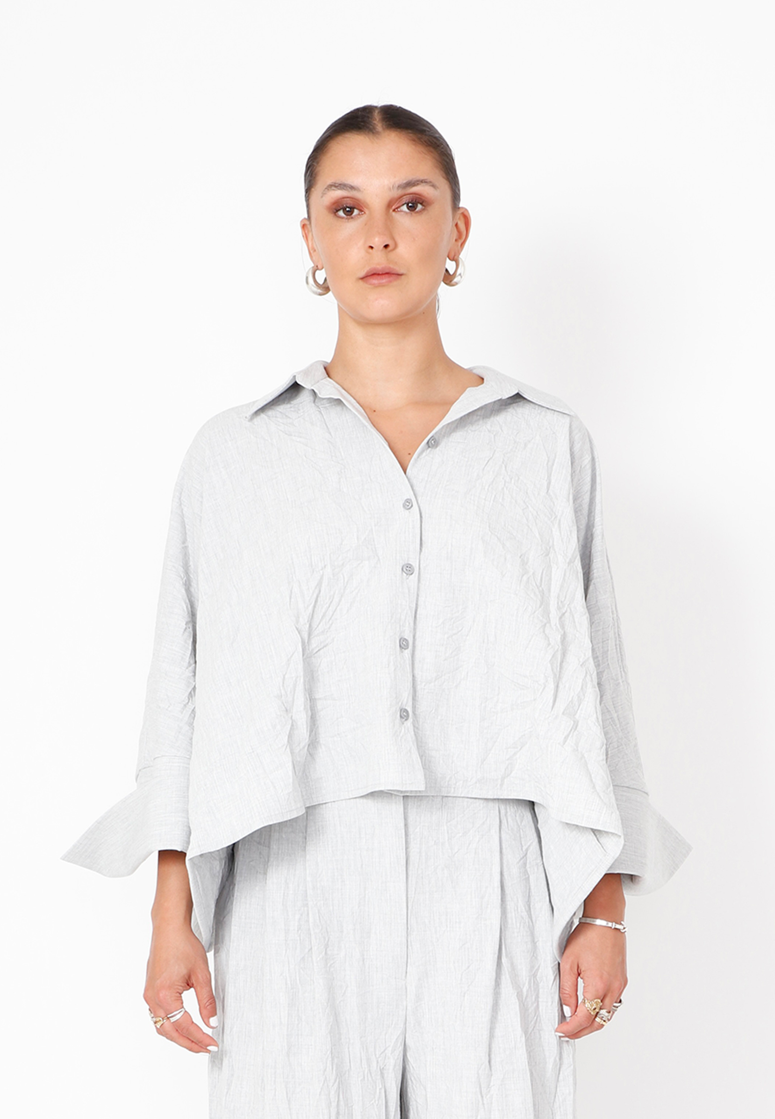 Boxy shirt with matching buttons and side pockets. The shirt features a collar and is shorter at the front and longer at the back. The wide sleeves with broad cuffs, along with a slit at the back, add a distinctive edge to the shirt. Available in more colors.