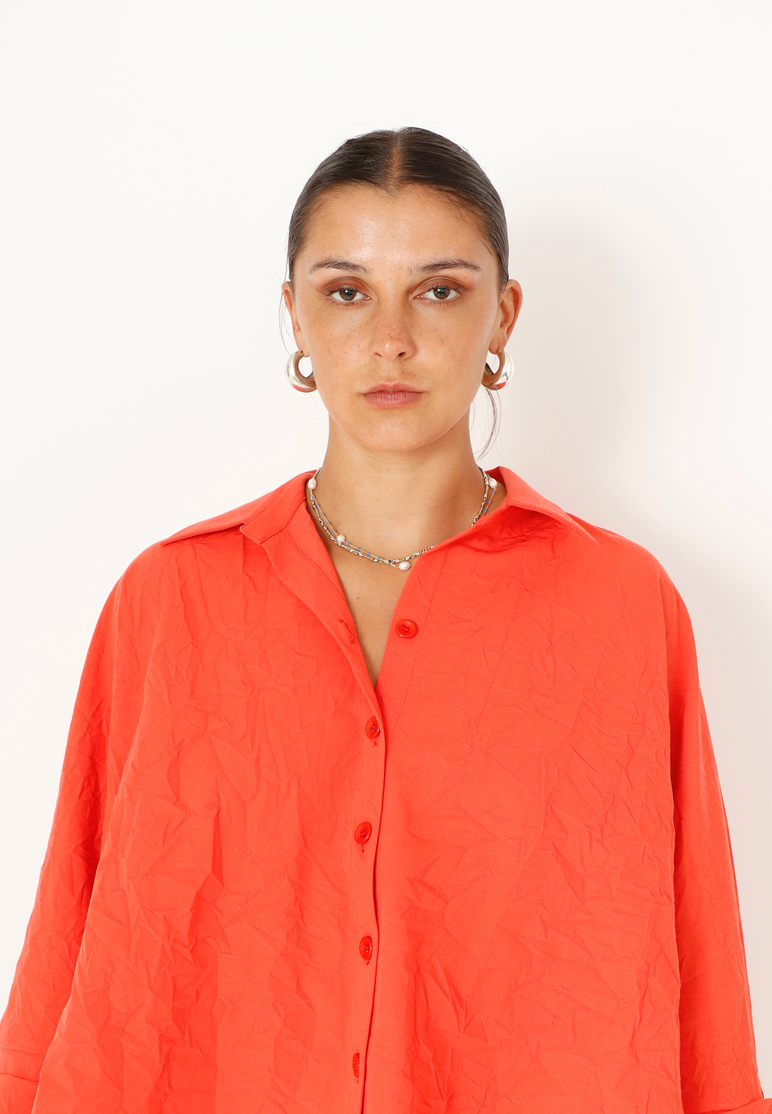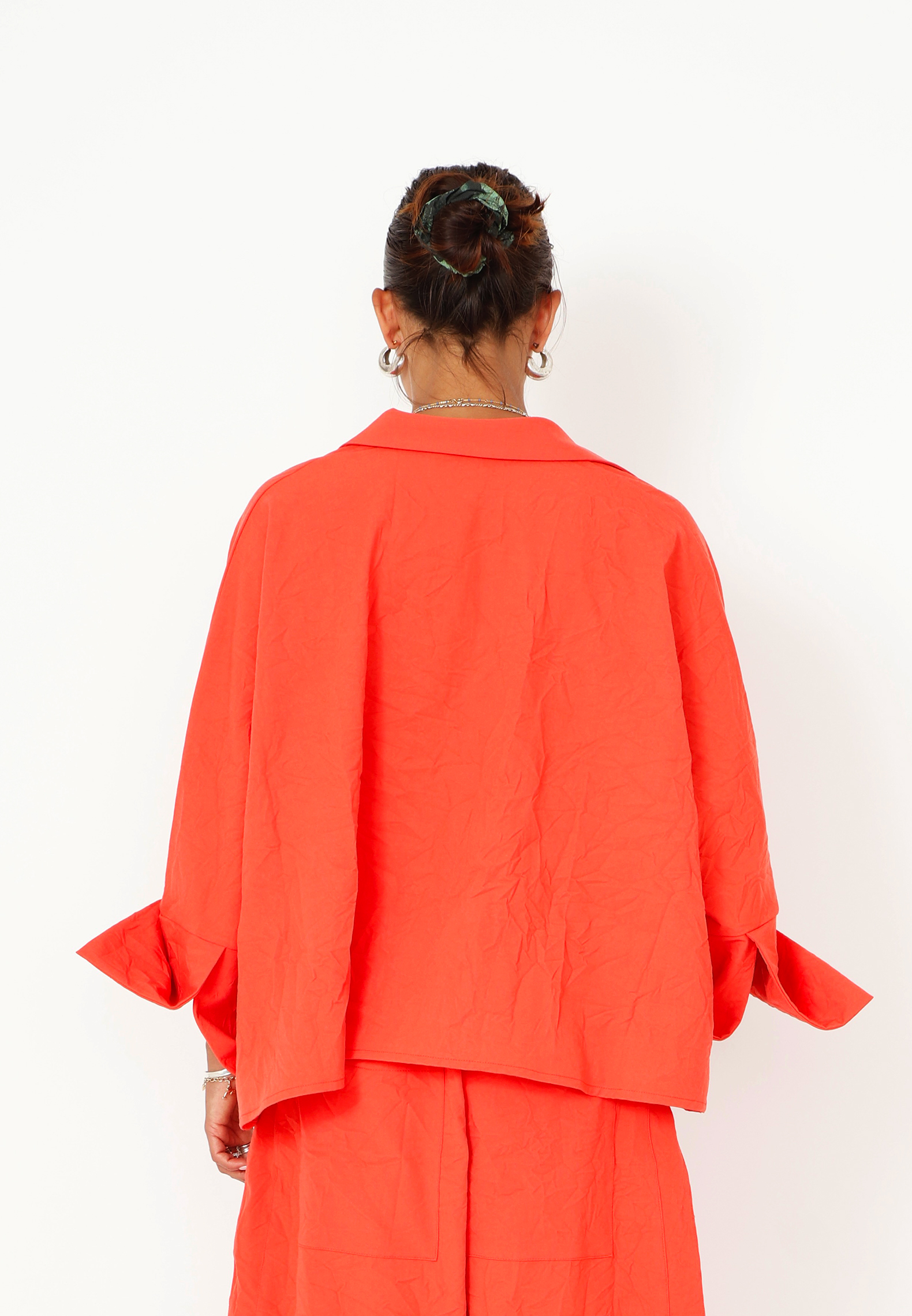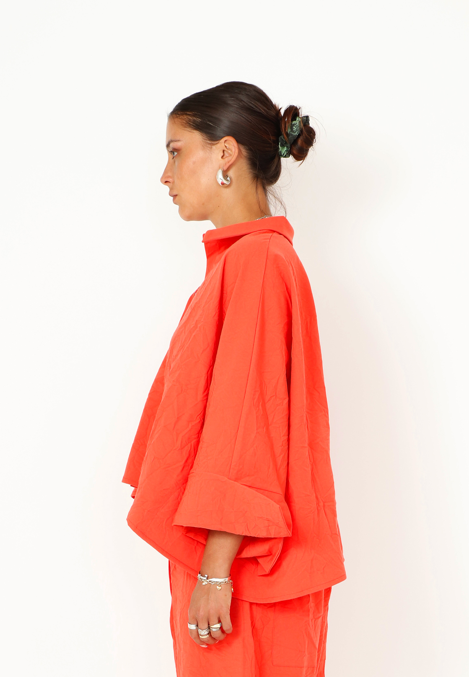 Oversize skjorte med matchende knapper samt lommer i siderne. Skjorten har krave, og er kort foran og længere bagpå. De brede ærmer med brede kanter og en slids på bagsiden er med til at give skjorten kant. Findes i flere farver.