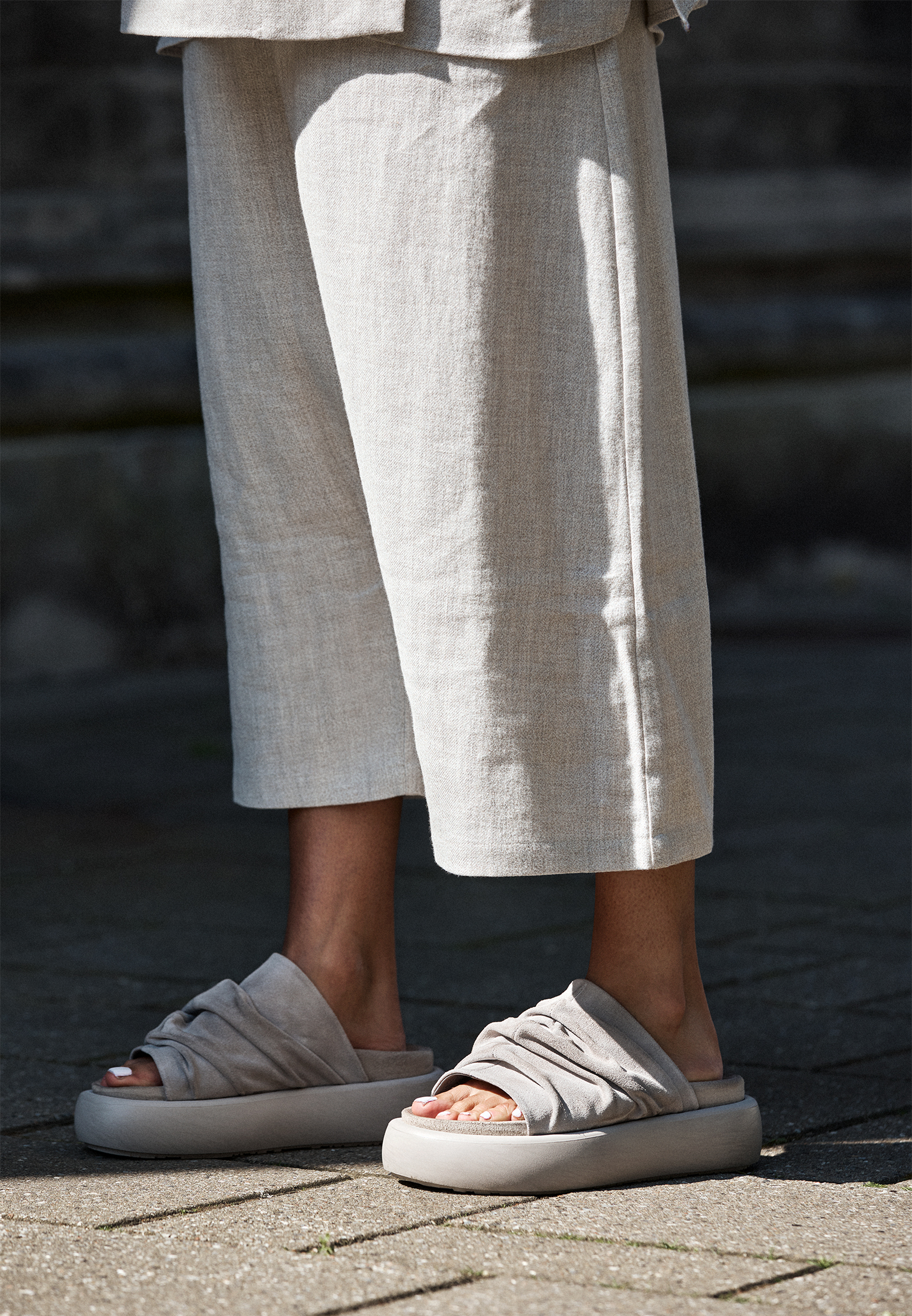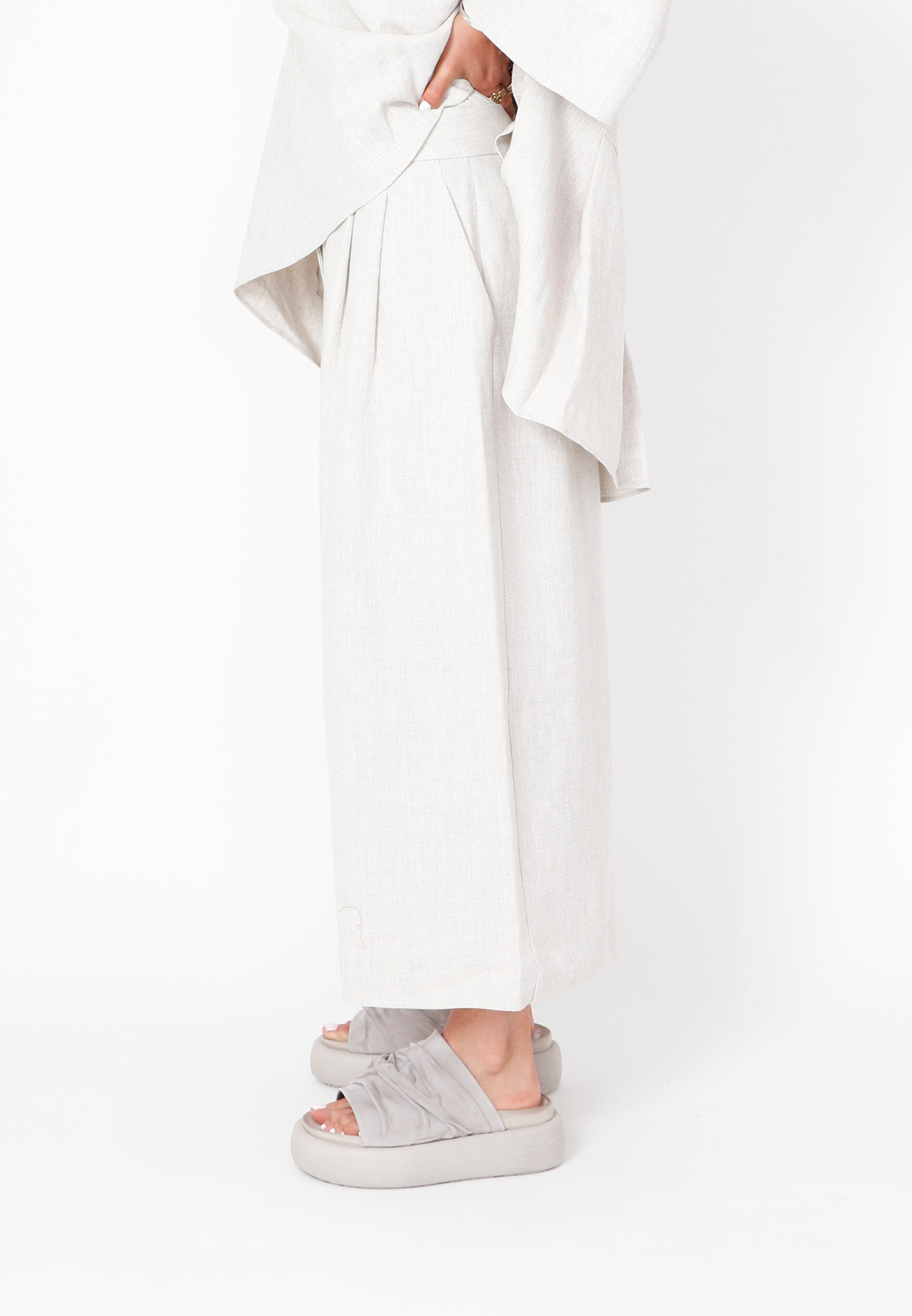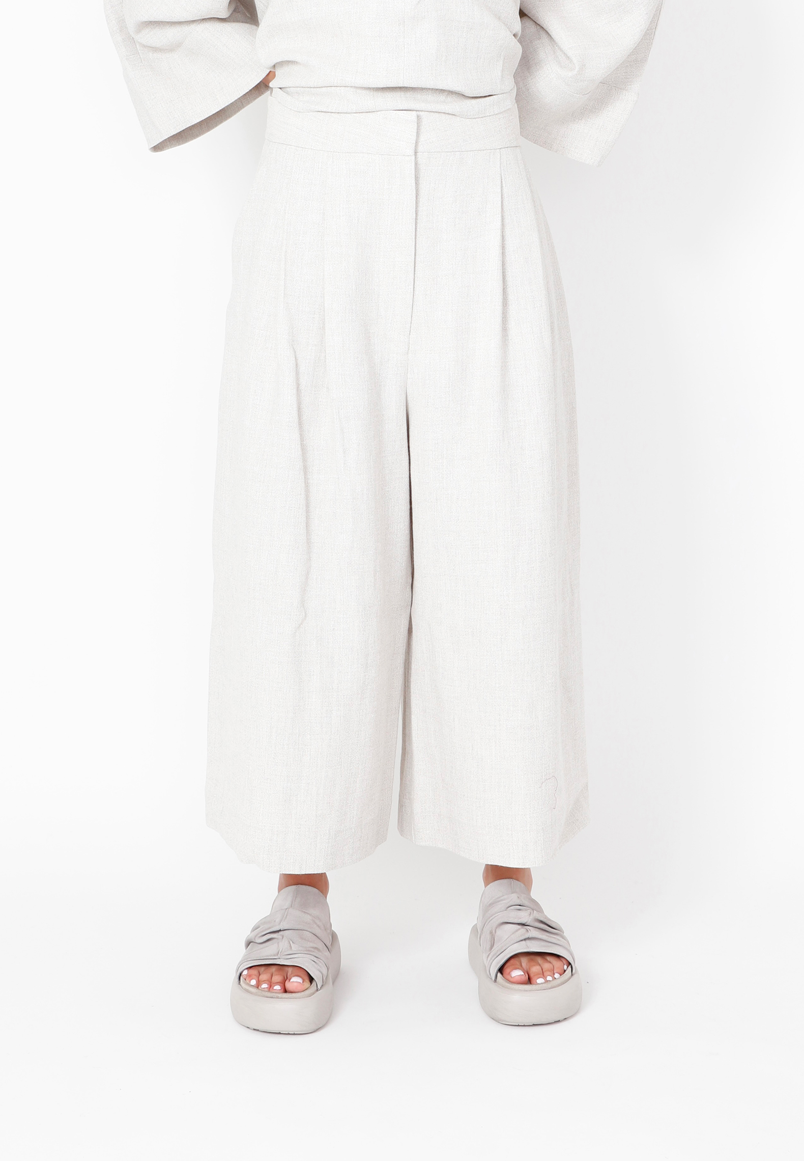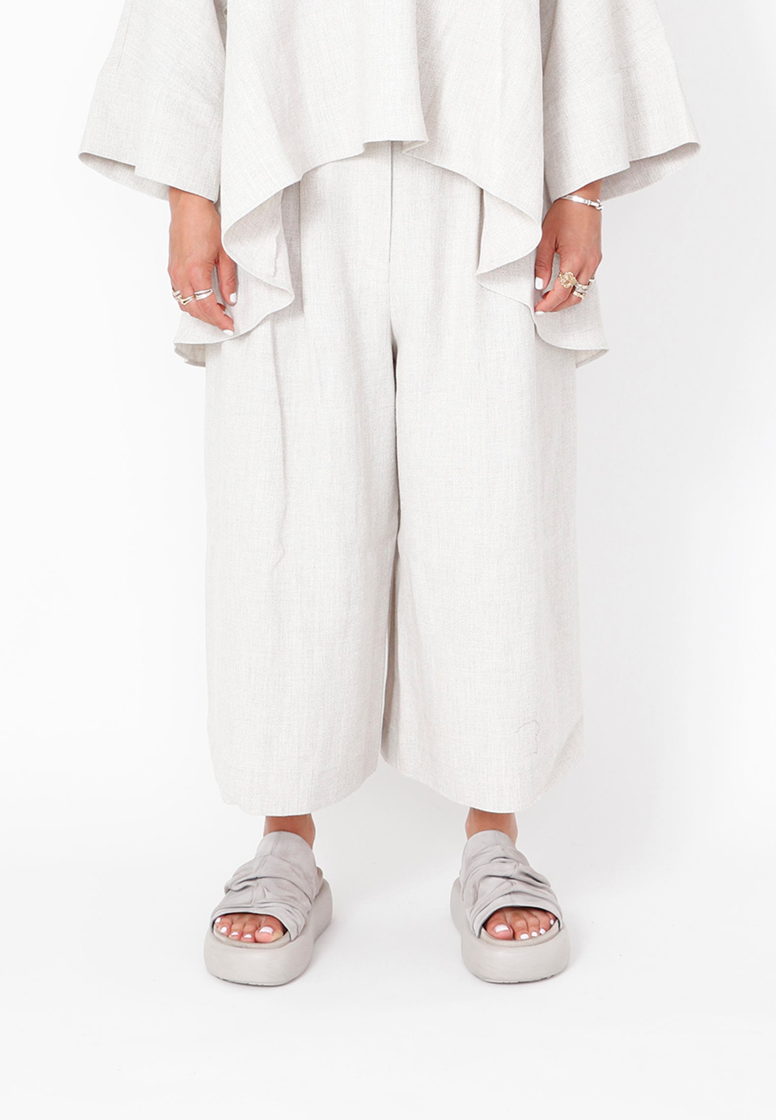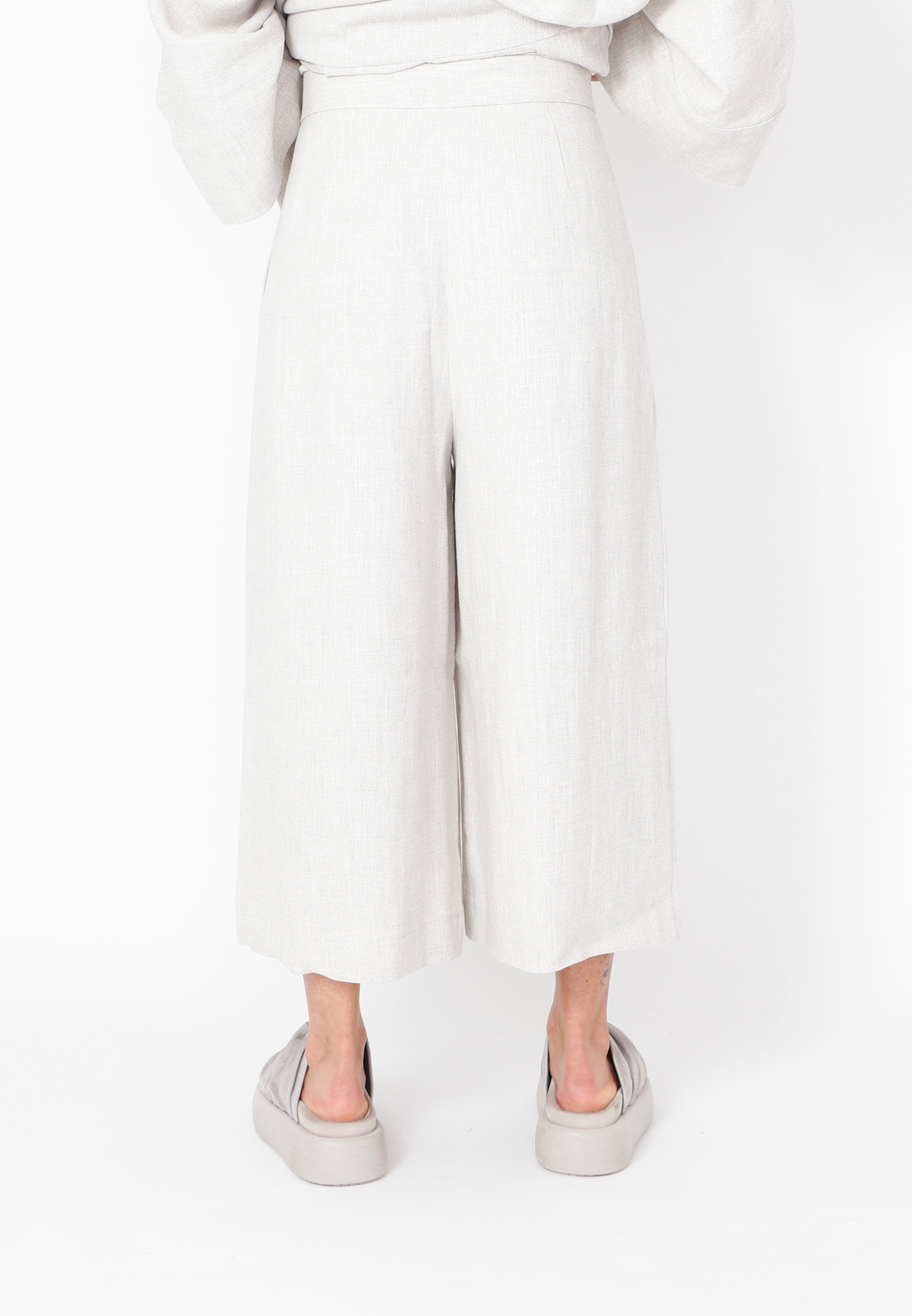 High waist pants with wide legs in 3/4 length with zipper, button closure and pockets. The pants come in more colours and qualities. This one in a soft, nice linen mix. All Sort Aarhus clothing is made in Portugal of handpicked local materials and qualities with focus on design and a comfortable fit.