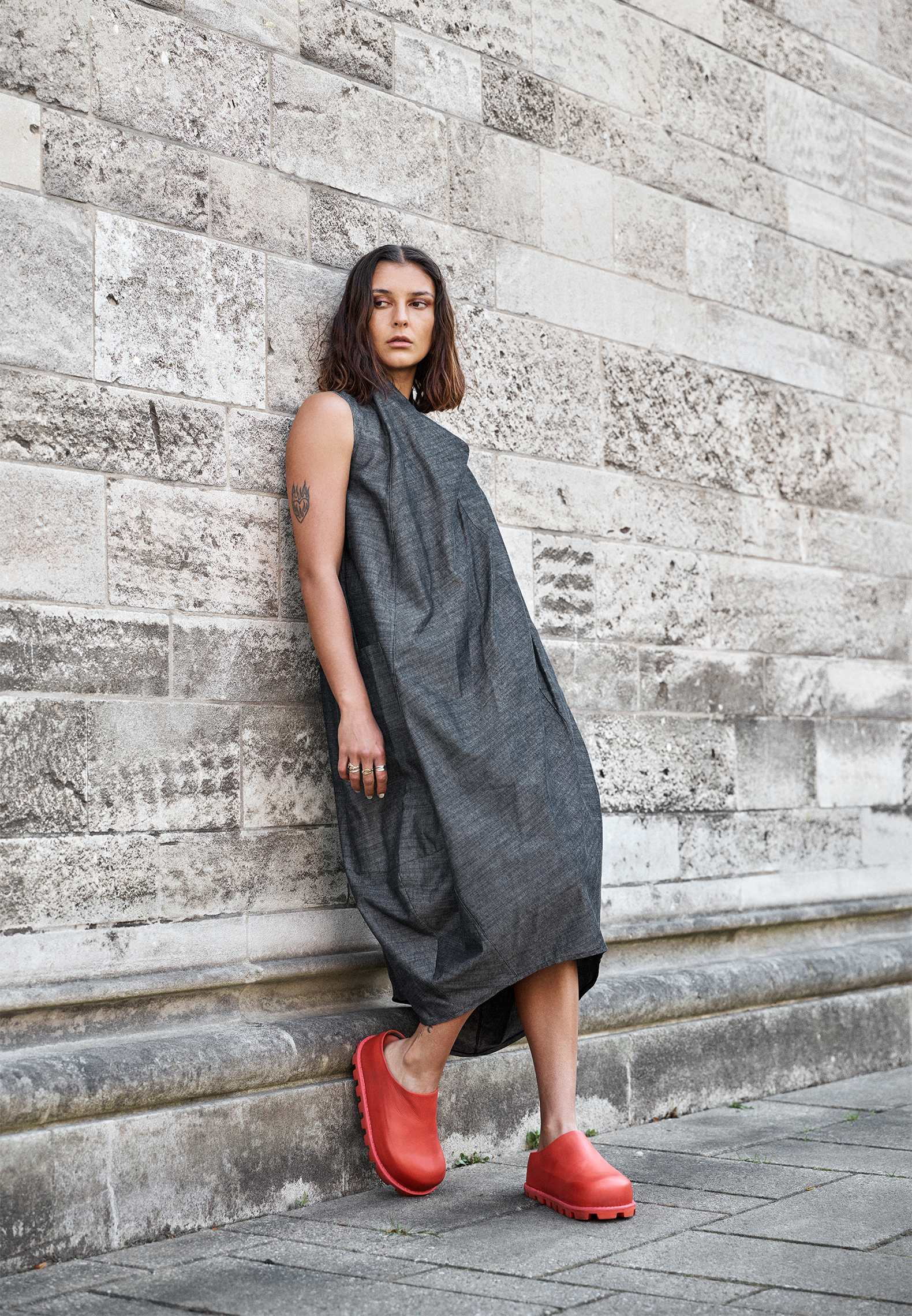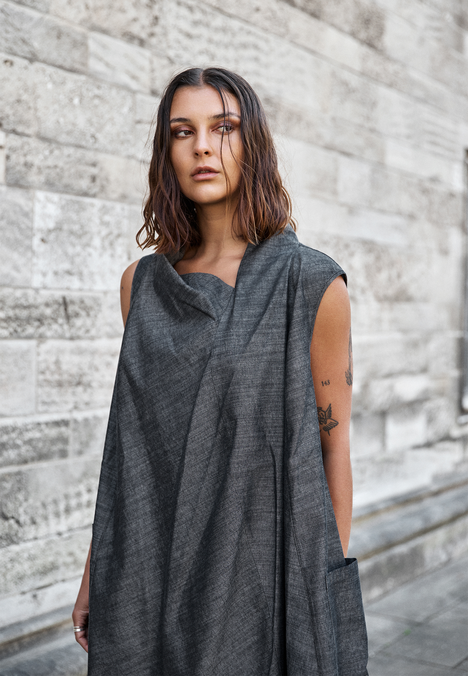 Kjole med lommer og et asymmetrisk snit. Kjolen er ærmeløs og har løs pasform. Lavet i bomuld og viscose. Alt Sort Aarhus tøj er produceret i Portugal af nøje udvalgte lokale materialer og kvaliteter med fokus på design og pasform.