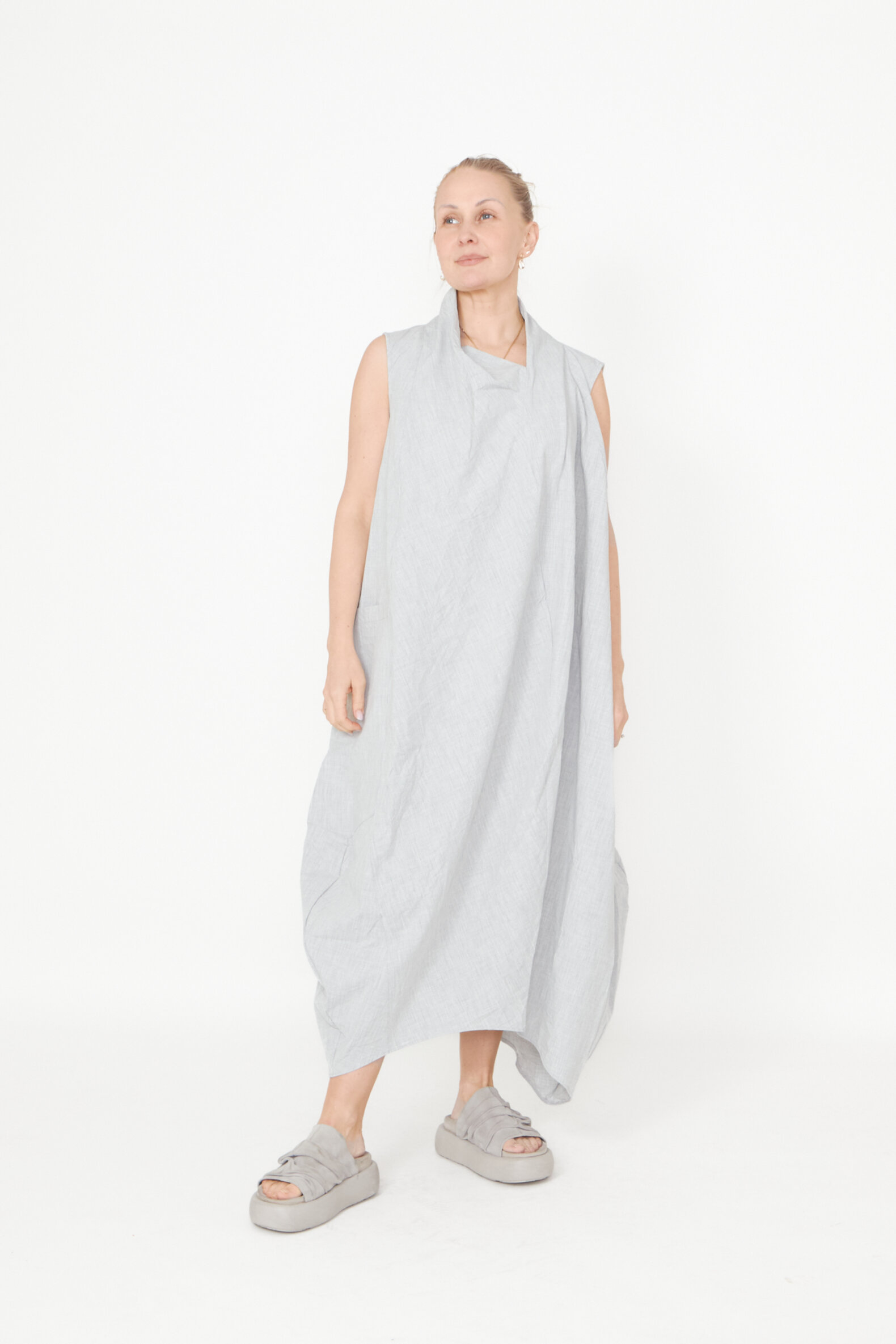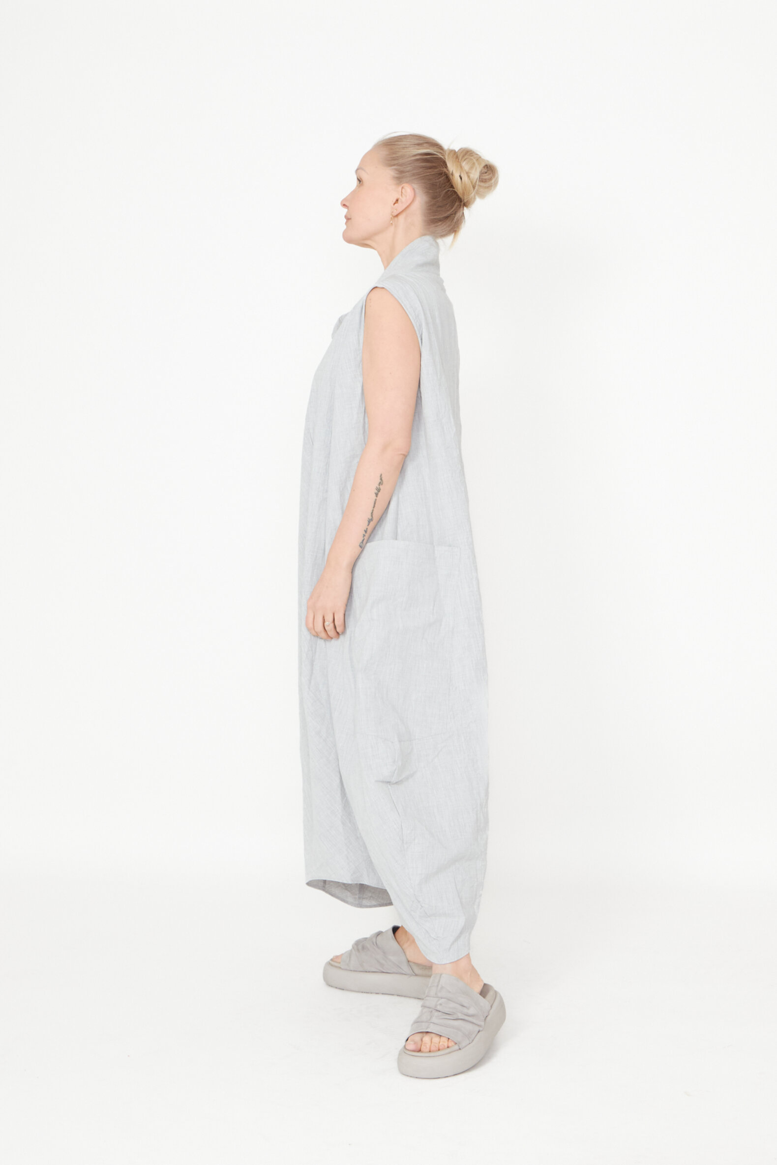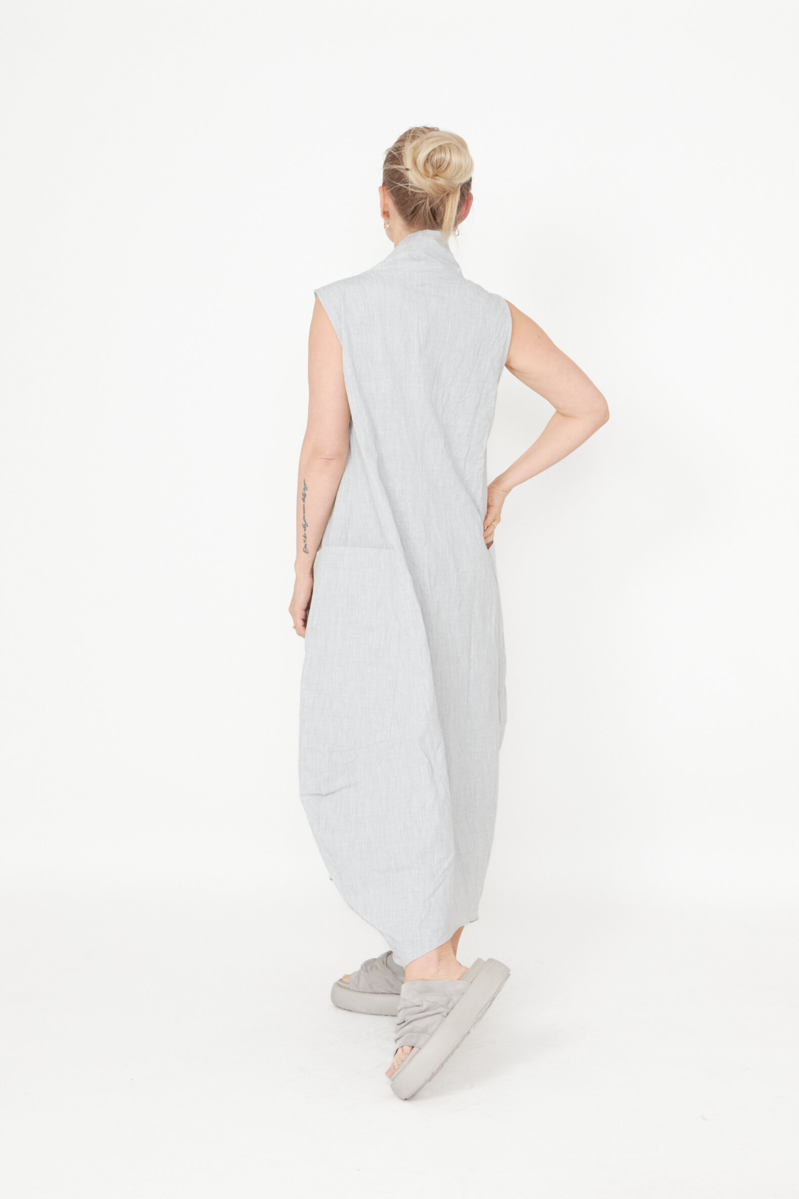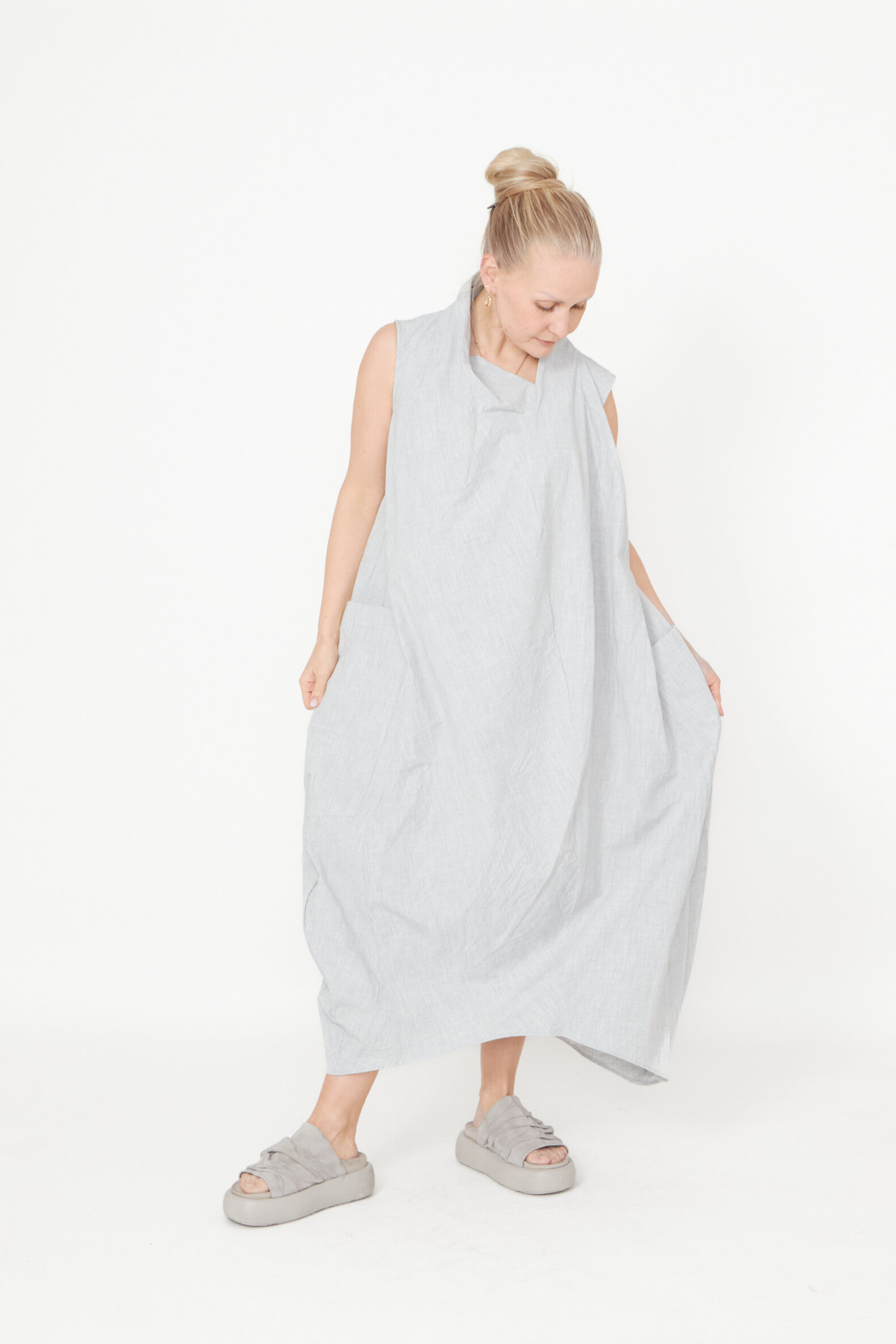 Dress with pockets and an asymmetrical cut. The dress is sleeveless and has a loose fit. Made in a nice mix of polyester and viscose. All Sort Aarhus clothing is made in Portugal of handpicked local materials and qualities with focus on design and a comfortable fit.