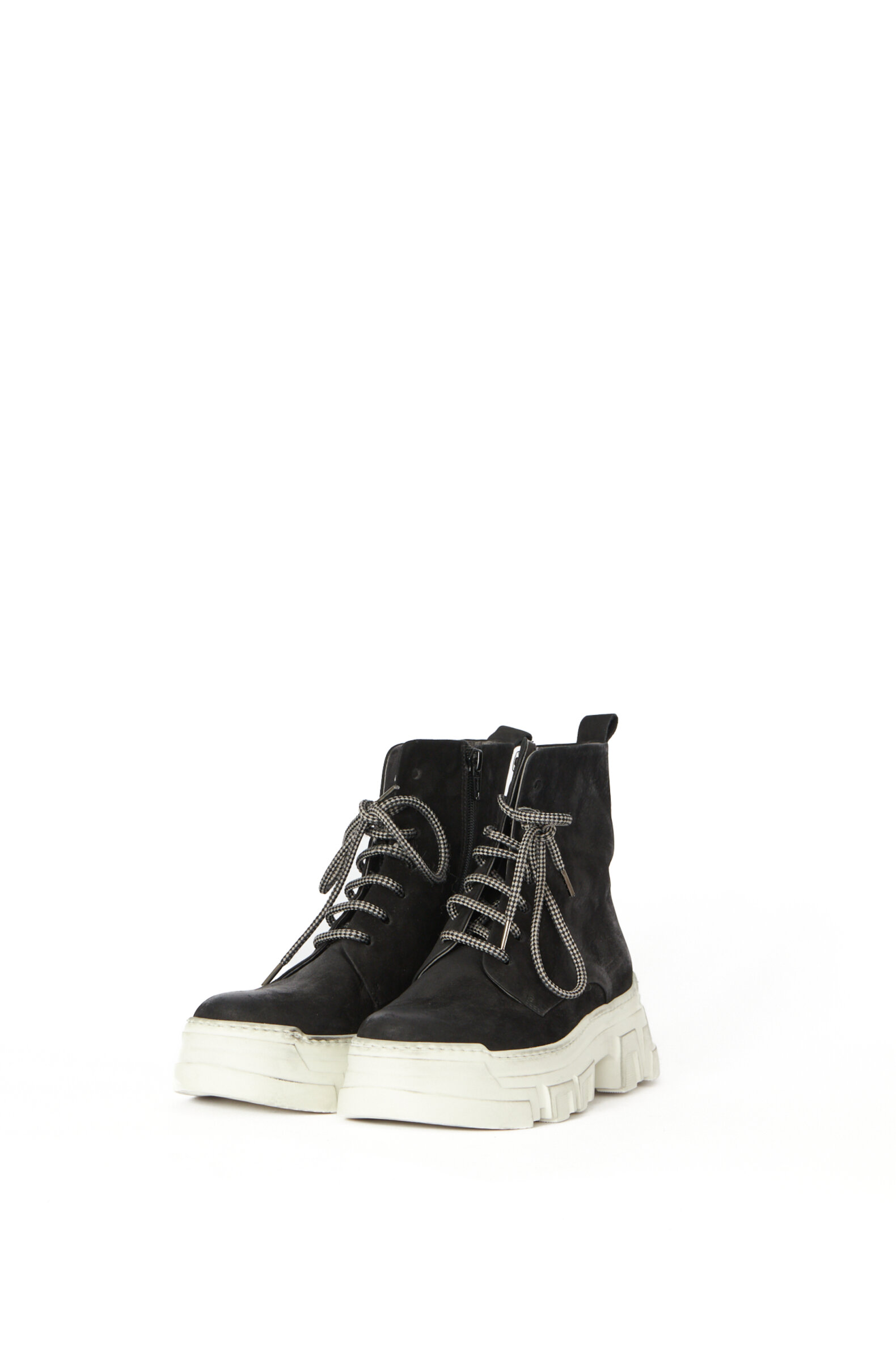 Dette er en kollektionsprøve. Støvle i sort kalveskind foret med svineskind, og med både lynlås og snøre.