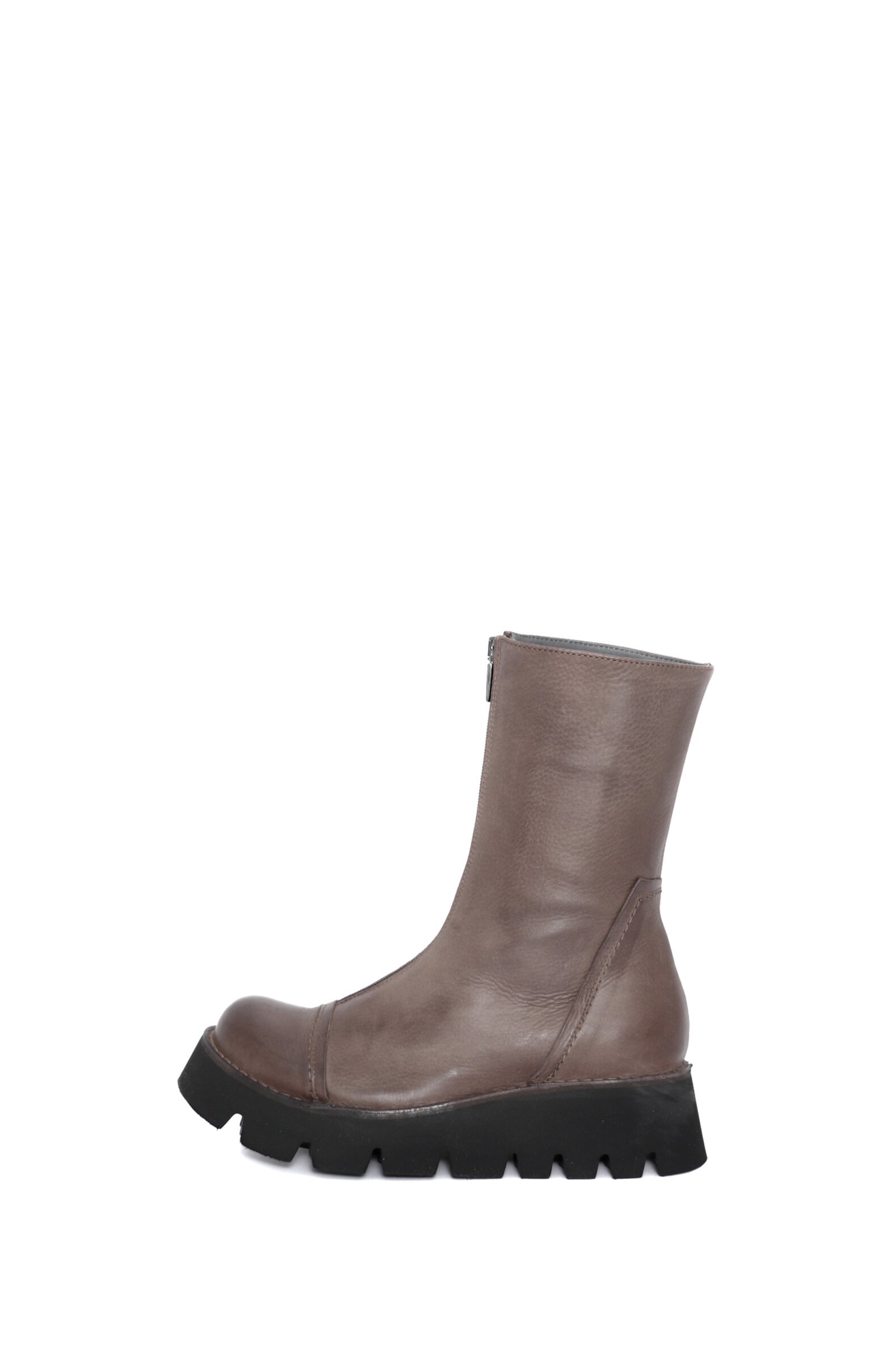 Dette er en kollektionsprøve i størrelse 37. Støvlen er lavet i grå/brunt glat kalveskind foret med svineskind og har lynlås foran.