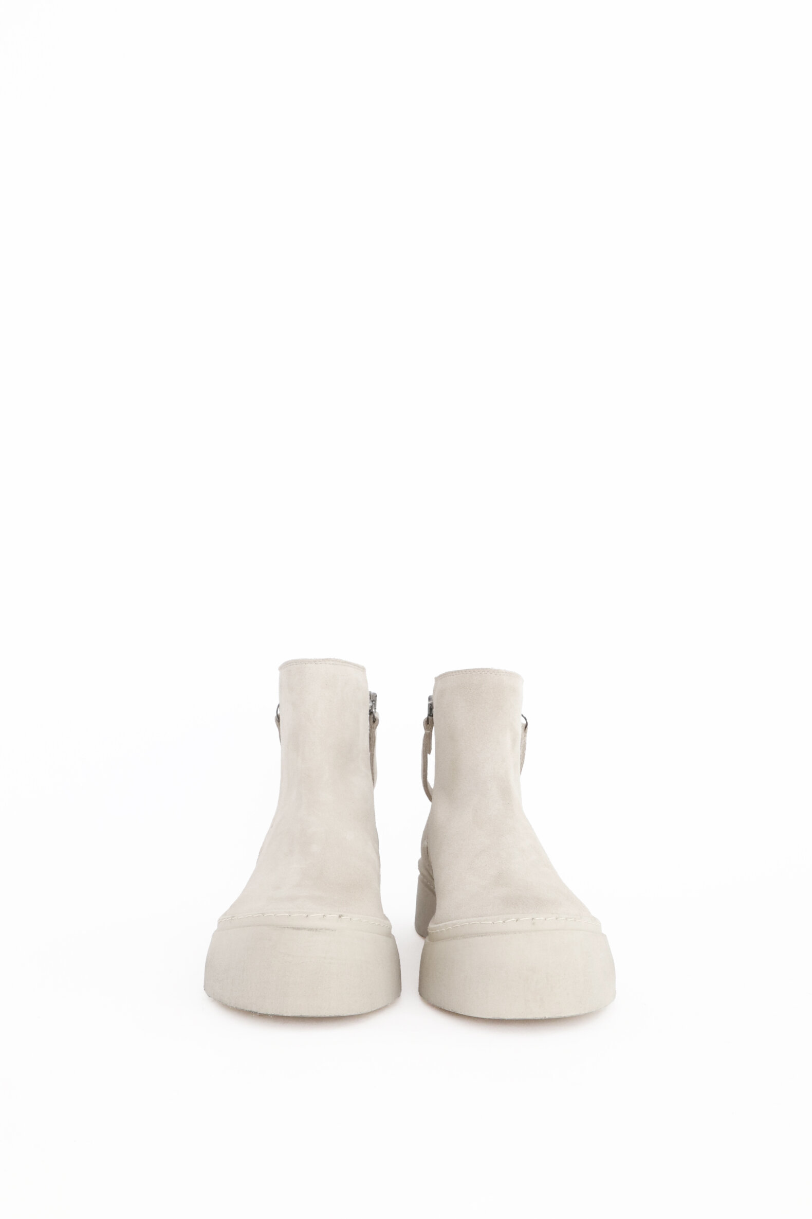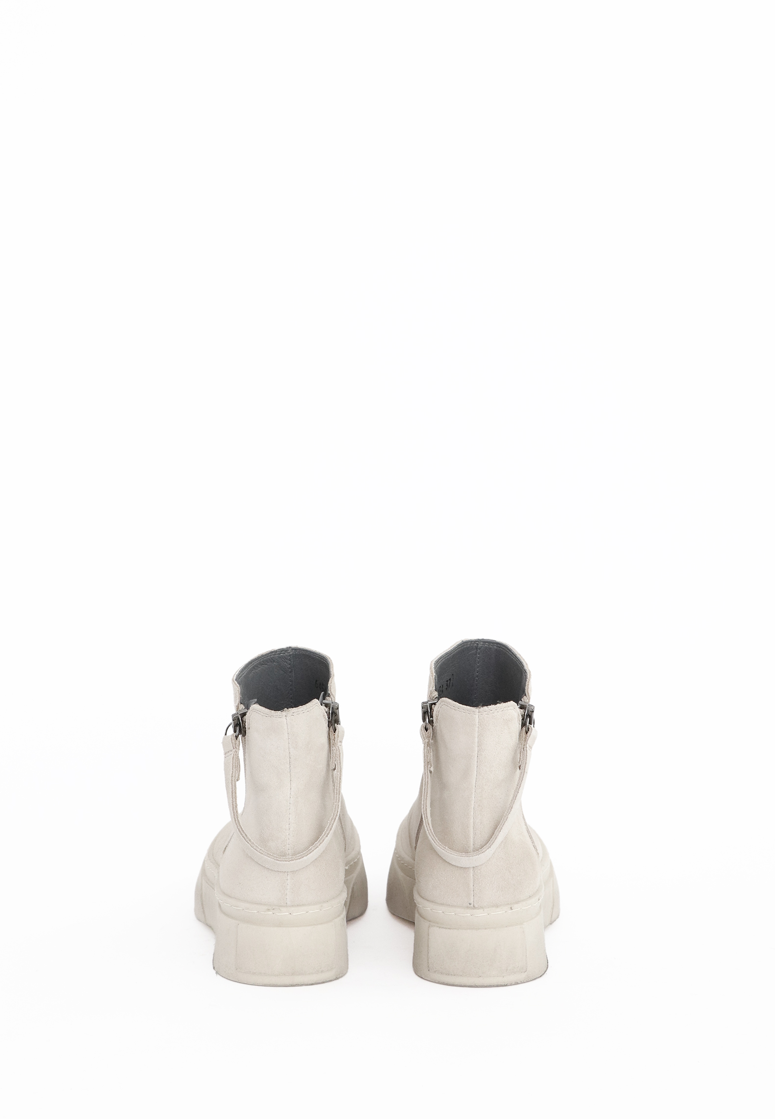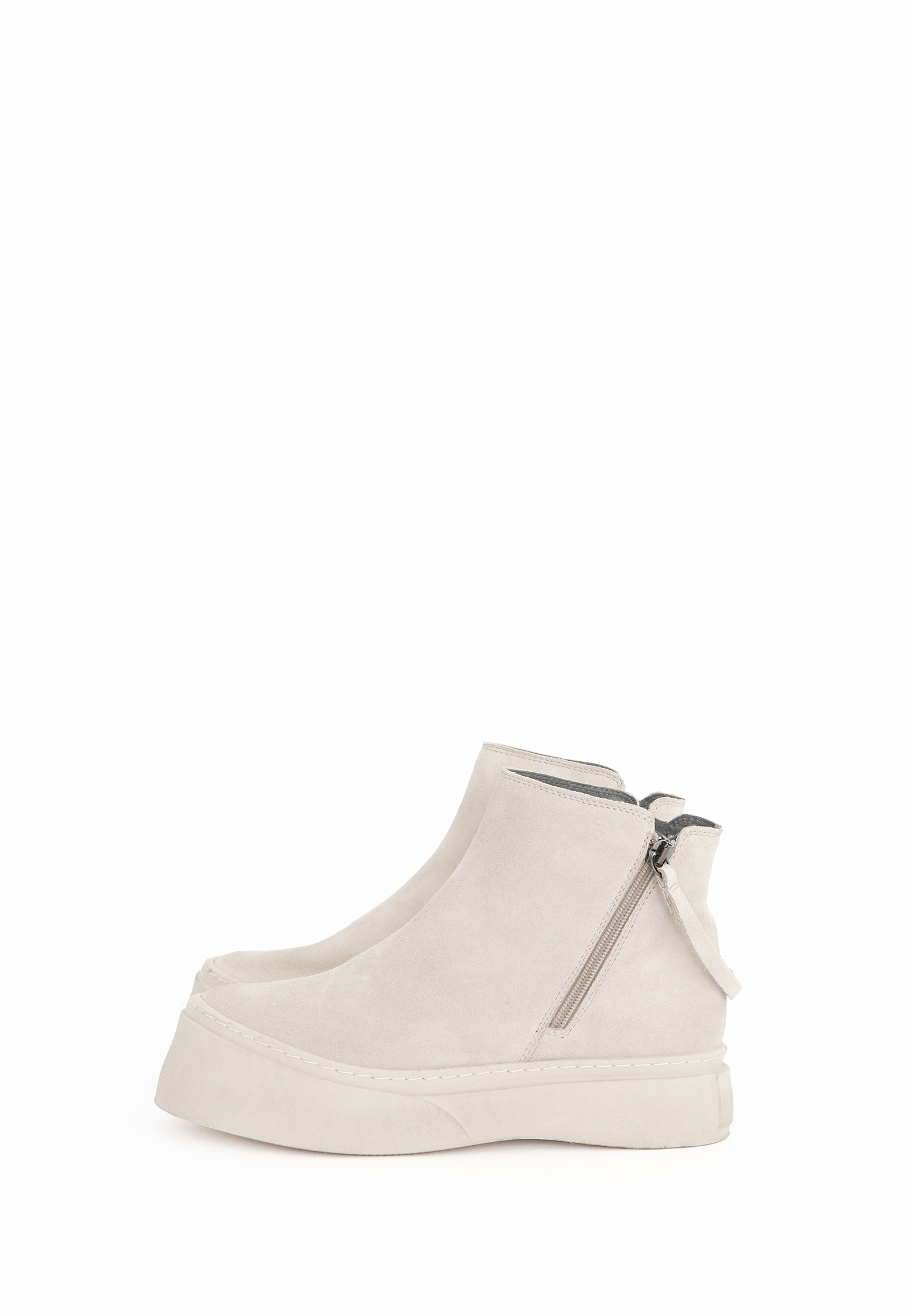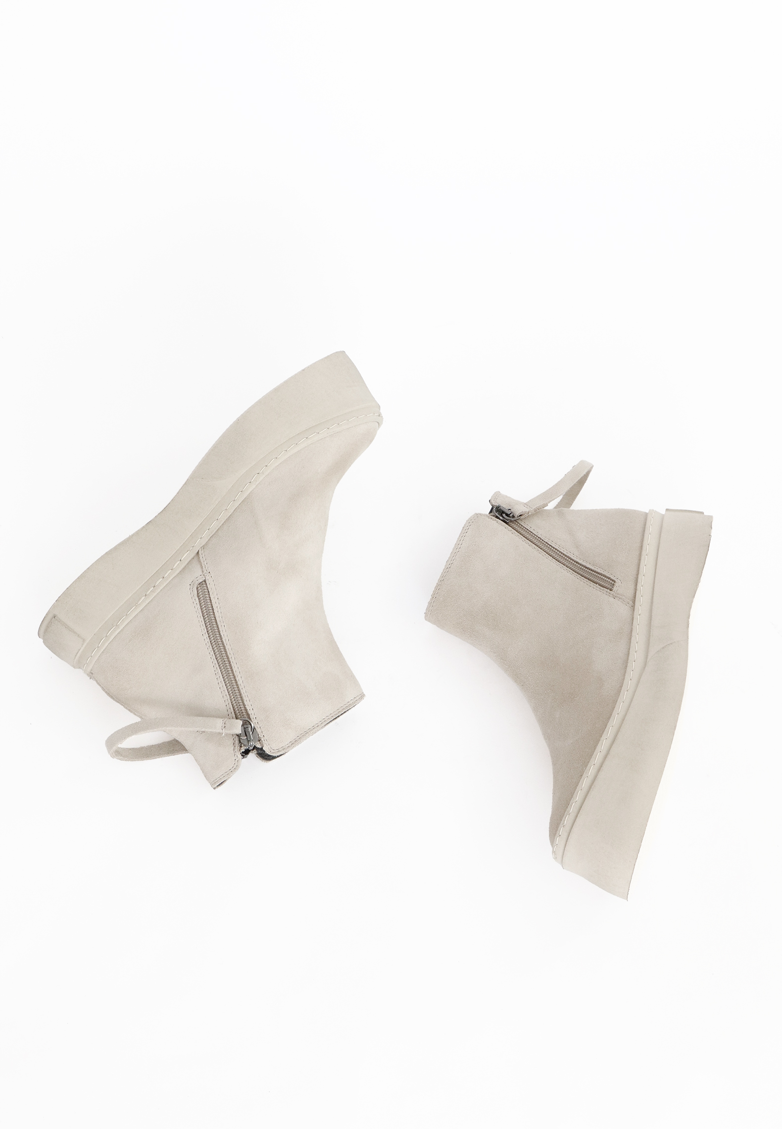 Dette er en kollektionsprøve i størrelse 37. Kort støvle i lyst ruskind med lynlås i siden samt en behagelig sål i samme nuance.