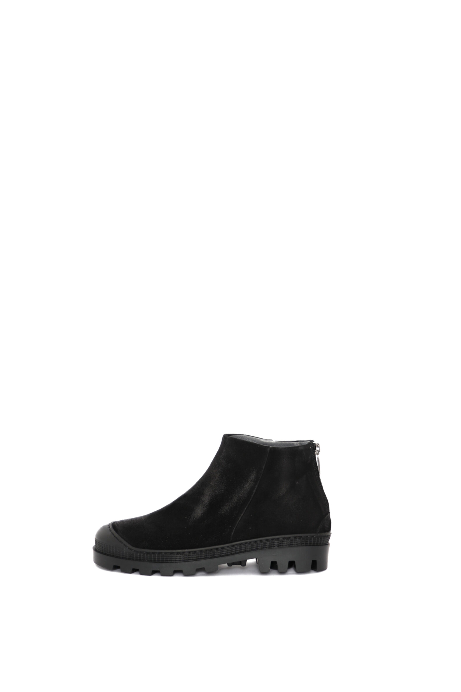 Dette er en kollektionsprøve i størrelse 37. Kort støvle i sort ruskind af kalveskind, foret med svineskind. Støvlen har lynlås bagtil, og en slidstærkt gummisål.