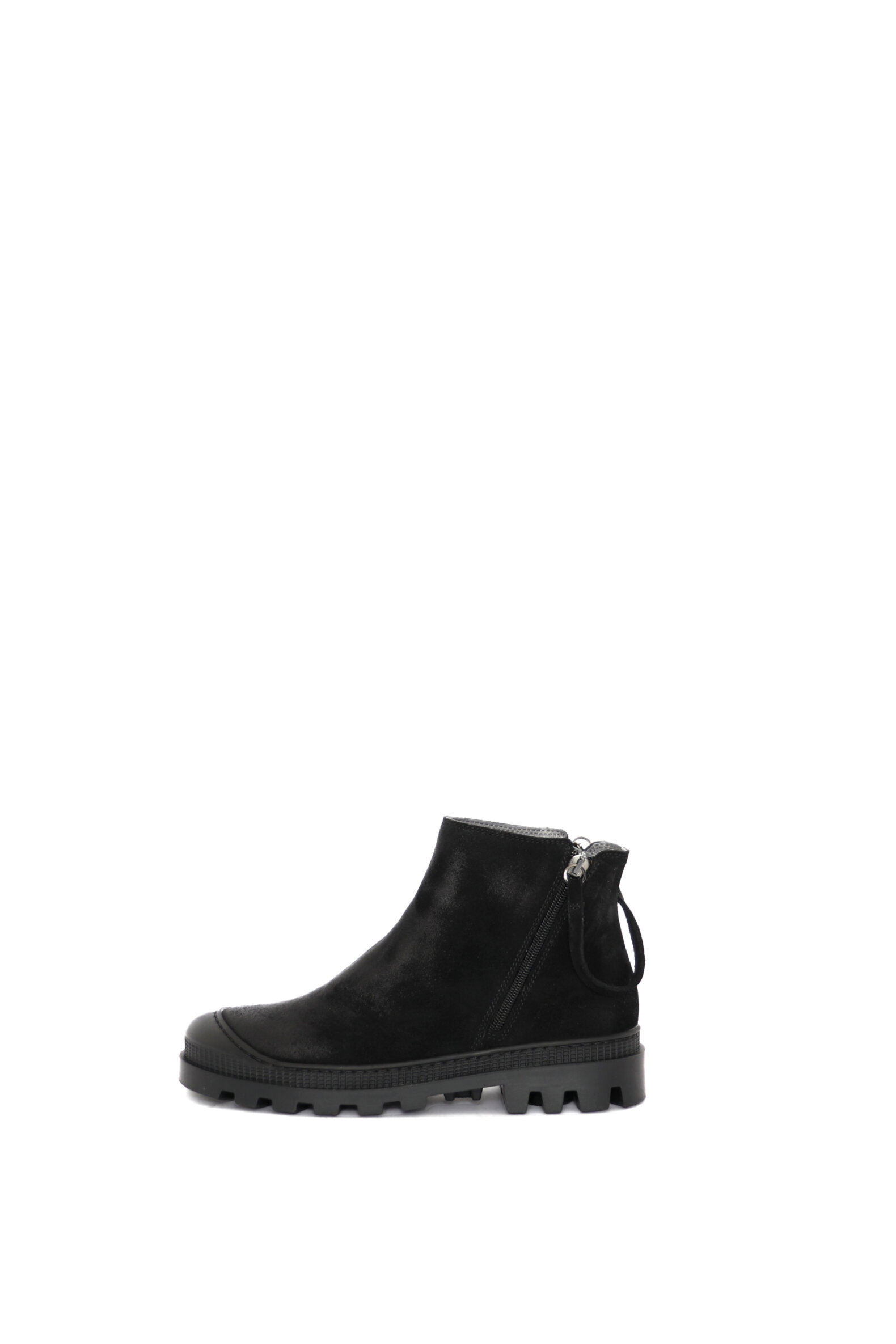 Dette er en kollektionsprøve i størrelse 37. Kort støvle i sort blødt ruskind af kalveskind med lynlås i begge sider og en slidstærkt gummisål.