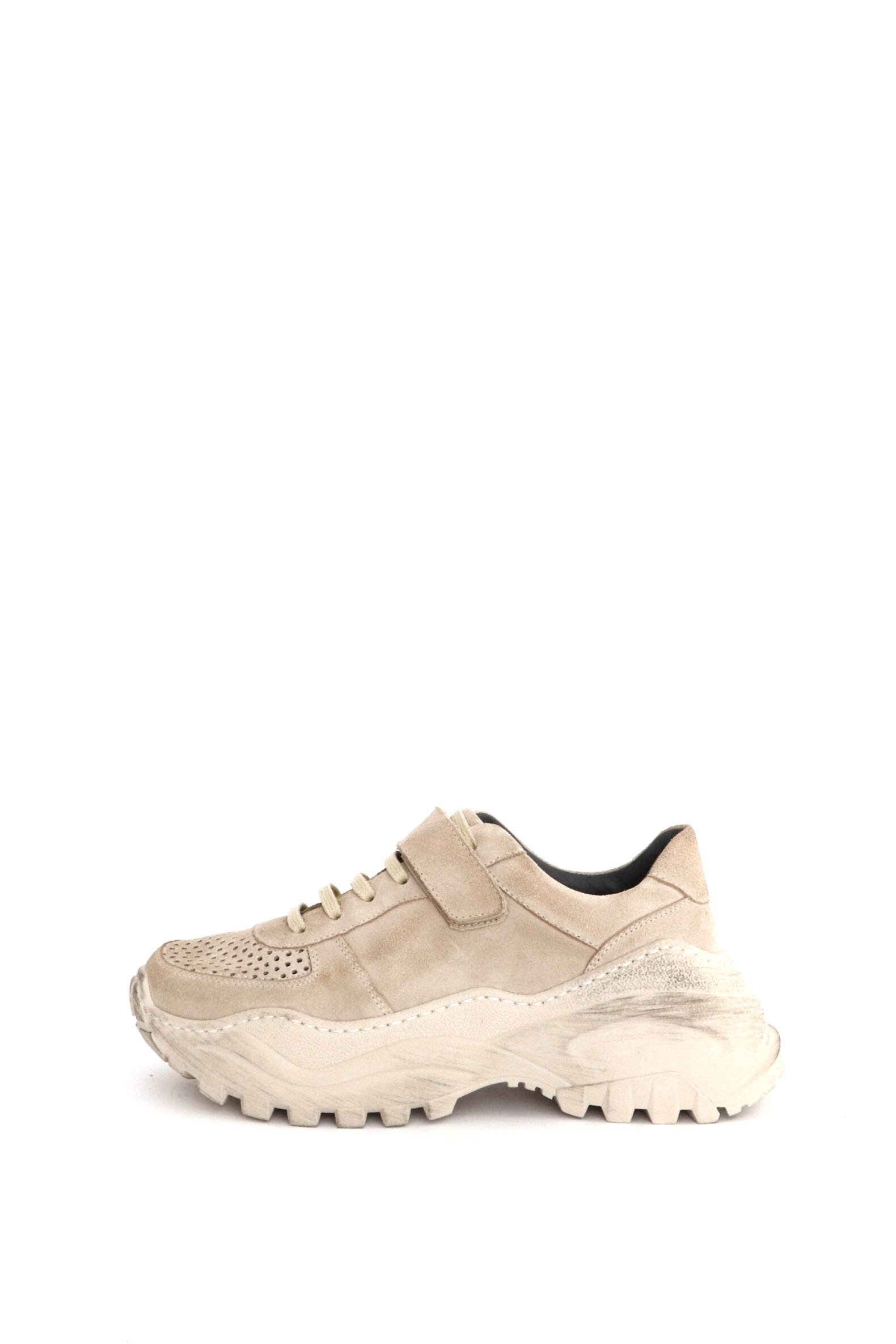 Dette er en kollektionsprøve i størrelse 37. Skoen er lavet i lysebrunt ruskind med velcrolukning og snøre i samme farve som skoen. Sålen er lavet i et sporty look af gummi-mix.