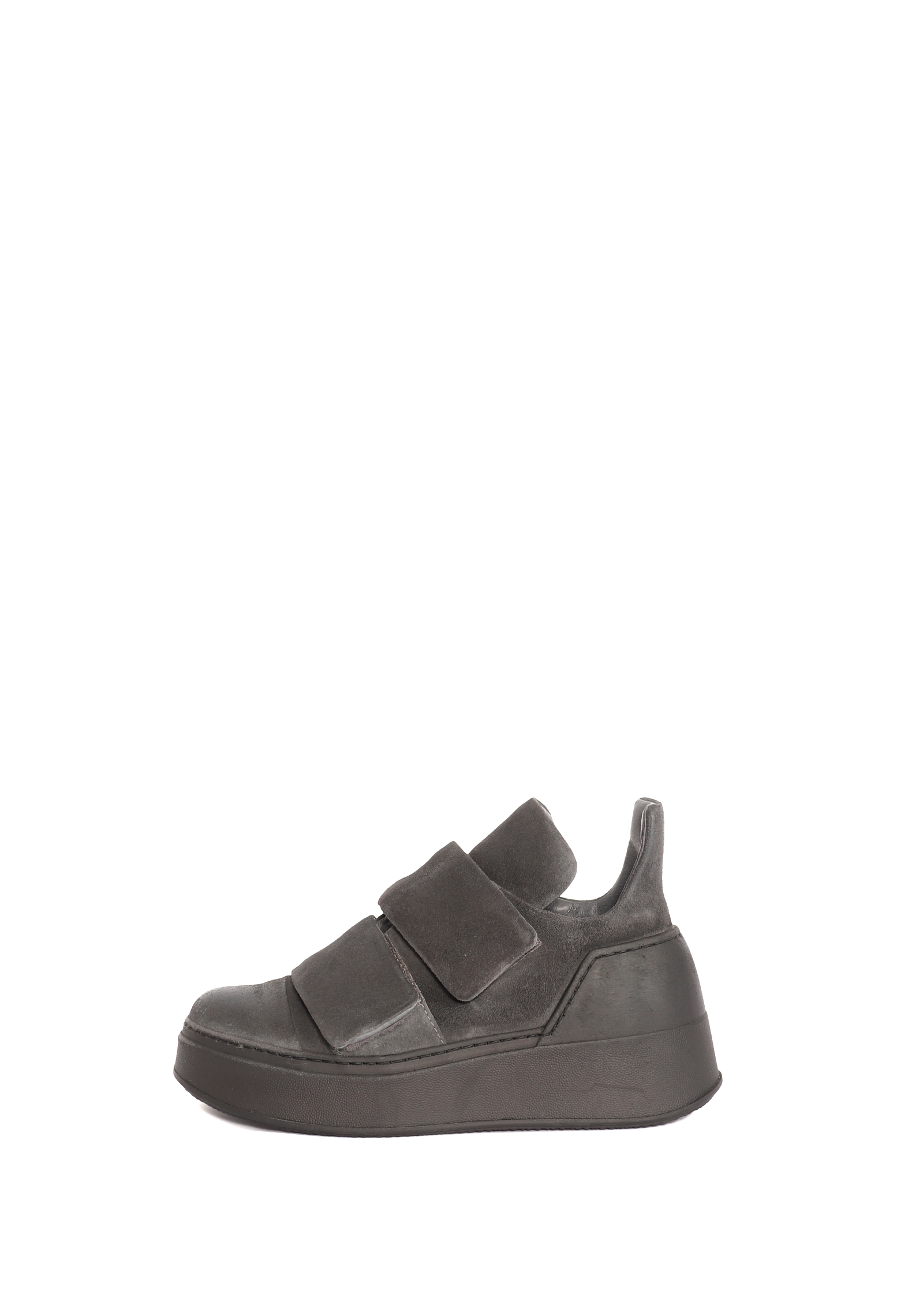 Sko i gråt ruskind foret med svineskind. Skoen har dobbelt velcrolukning og en fast sål.