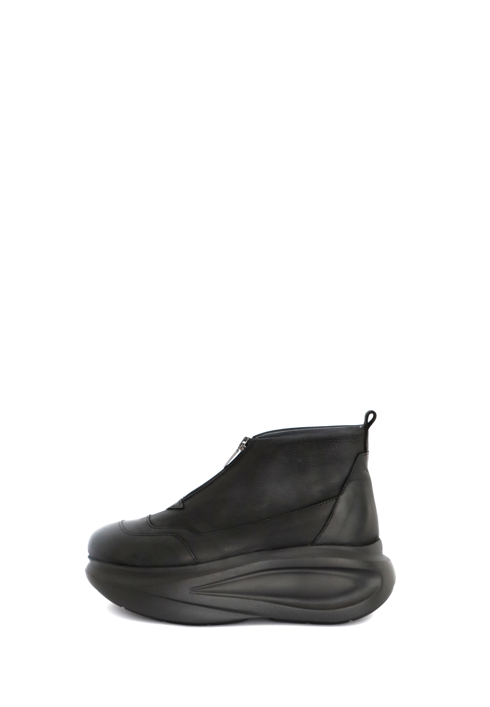 Sko i sort kalveskind foret med svineskind. Skoen har front-lynås og en sej let sål som nærmest syner svævende.
