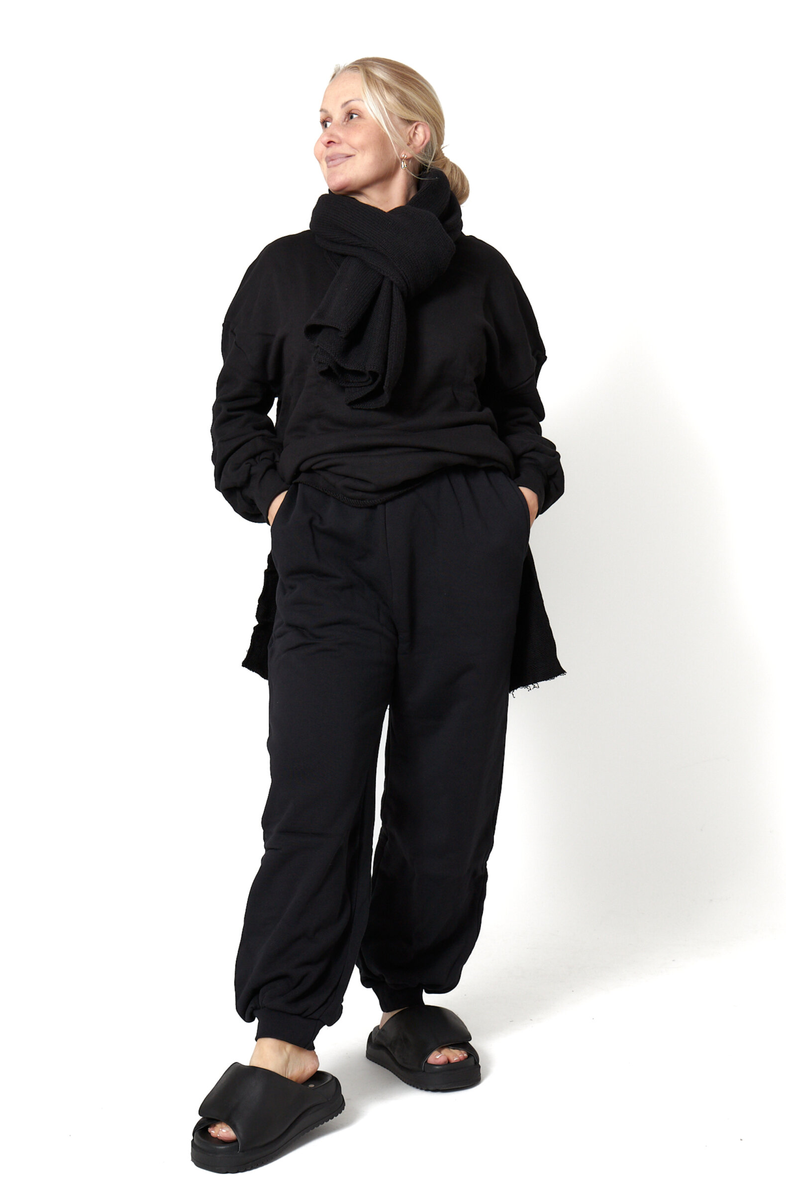 Style nr. SA5022-026 Sort Aarhus sweat bukser i blød kvalitet Bukserne er fra SS23 kollektionen Med elastik i taljen og forneden Bukserne har lommer både for og bag Cool at style til matchende cropped sweatshirt Bukserne er normal i størrelsen.