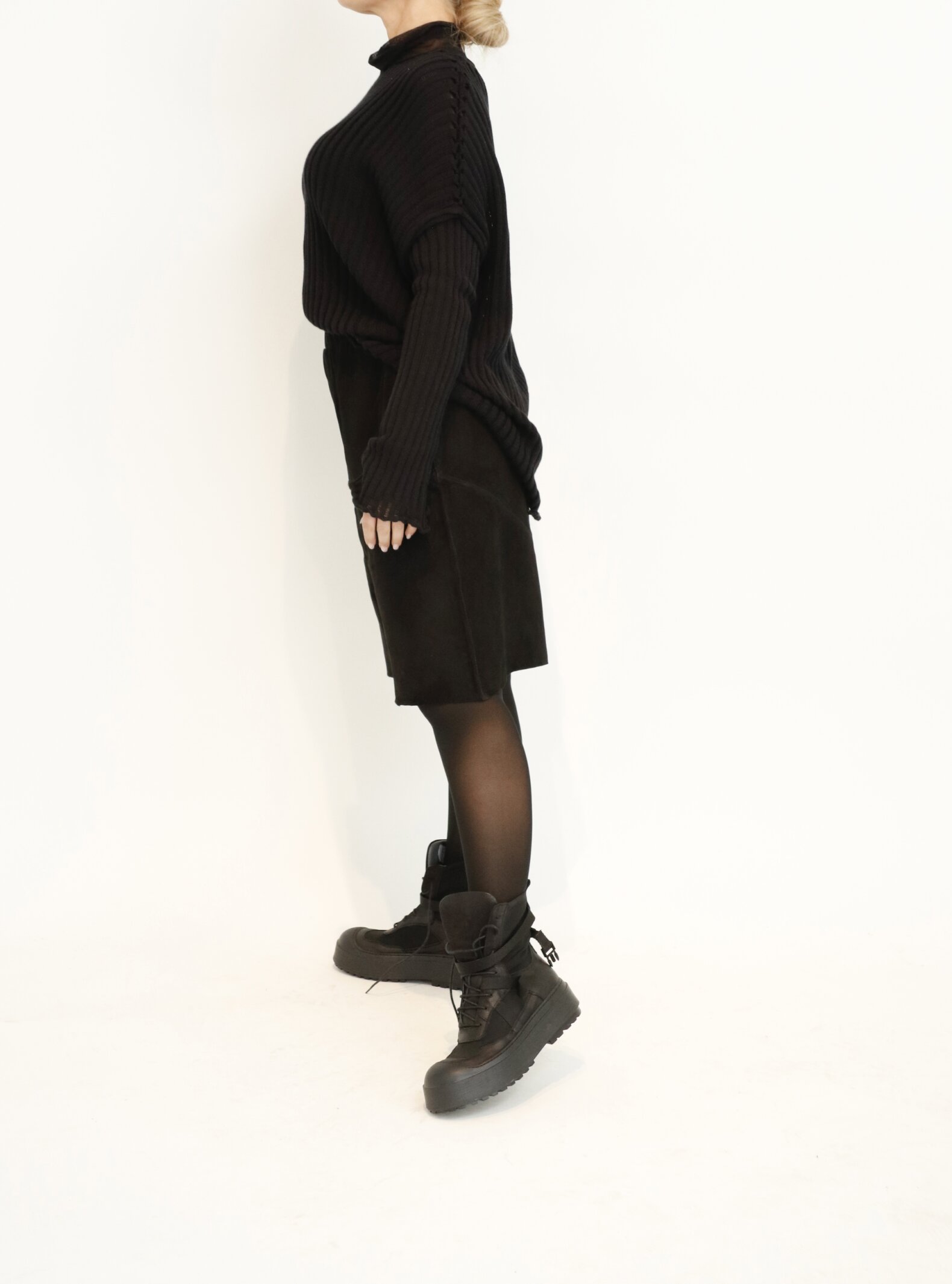 Sort Aarhus suede leather shorts in black. This style has wide legs and side pockets. With a back zipper. Style with matching blouse. The shorts is normal in size