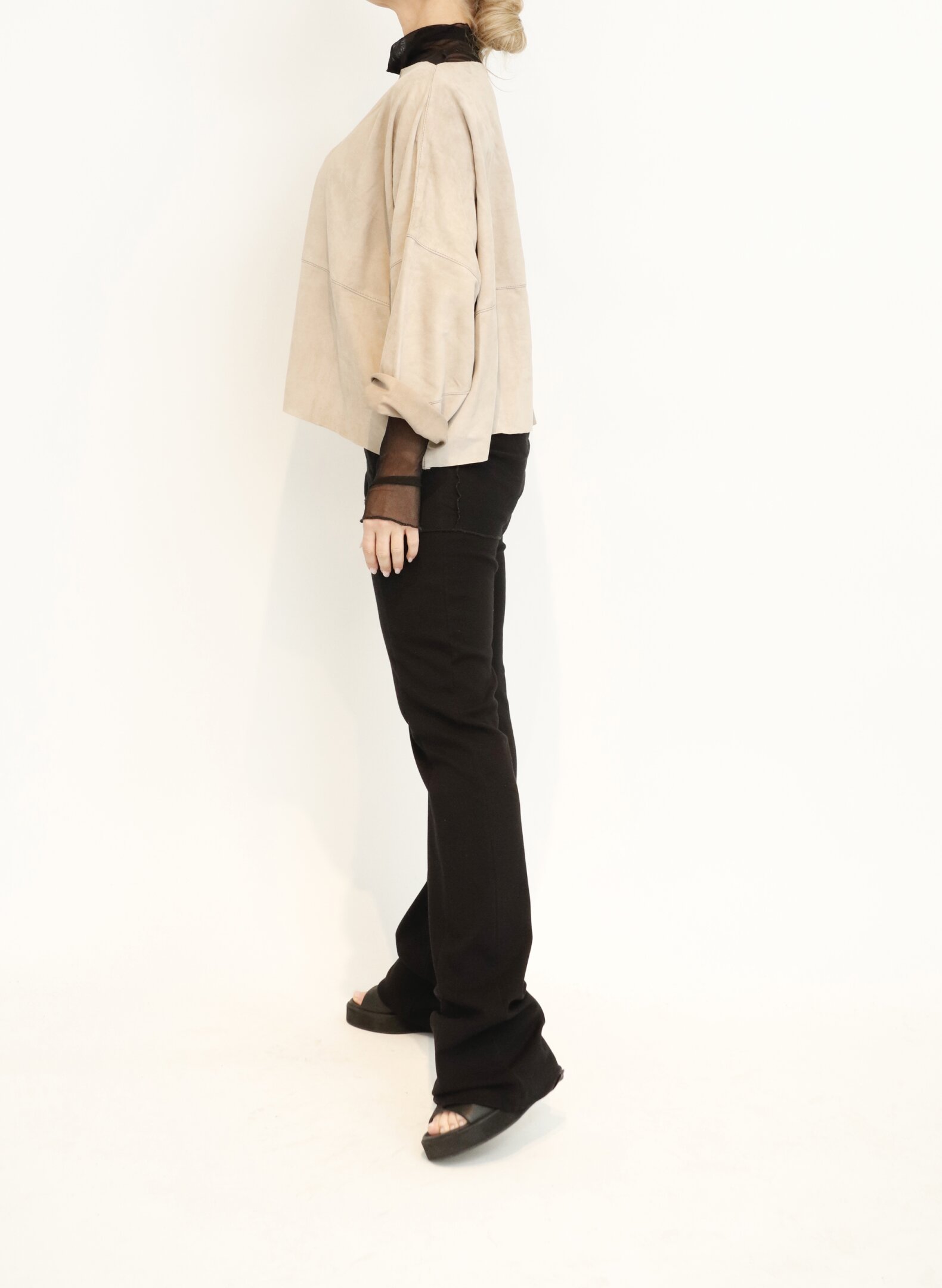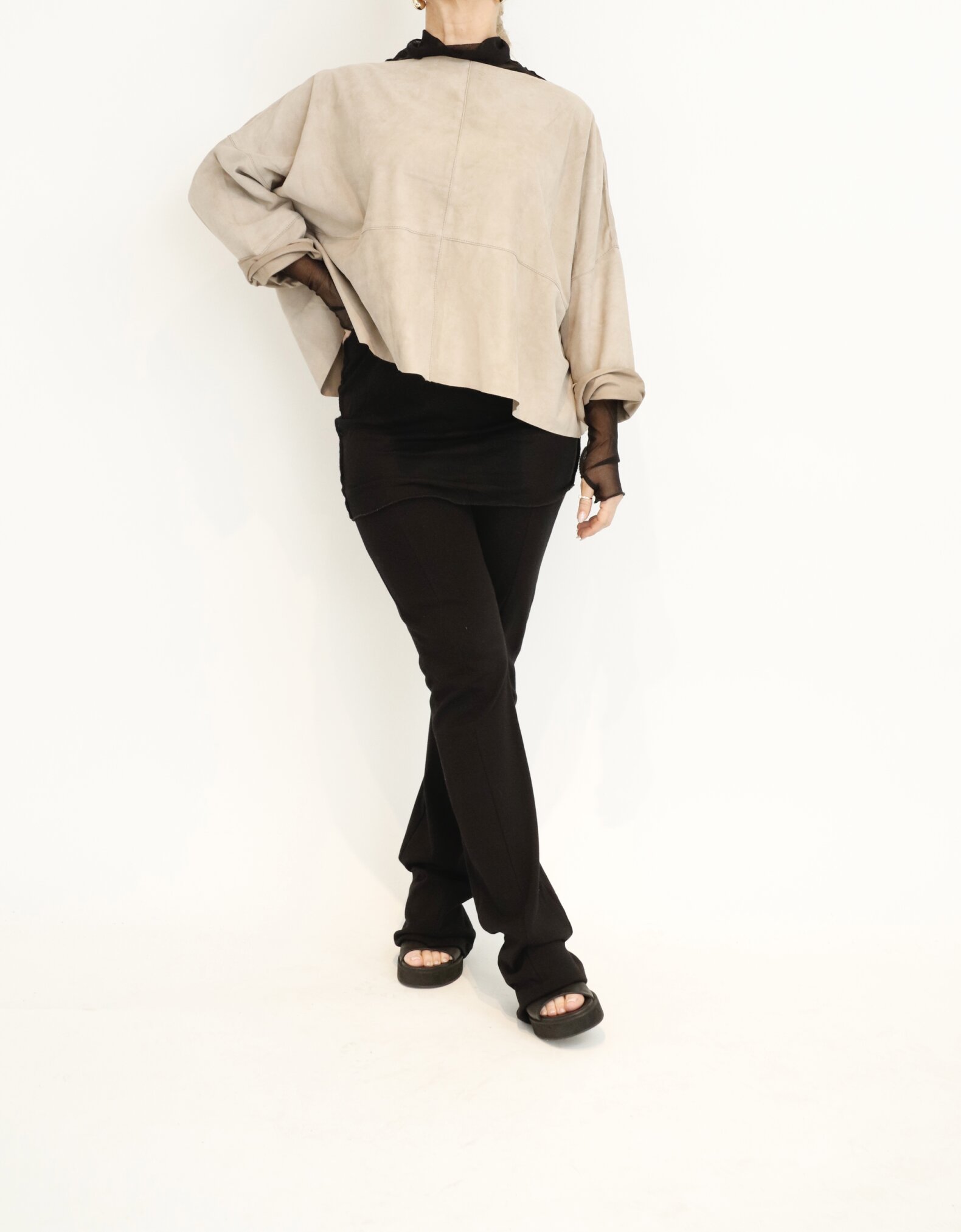 Sort Aarhus suede leather blouse in light grey. This style has wide sleeves and neckline. Style with matching shorts. The blouse is normal in size