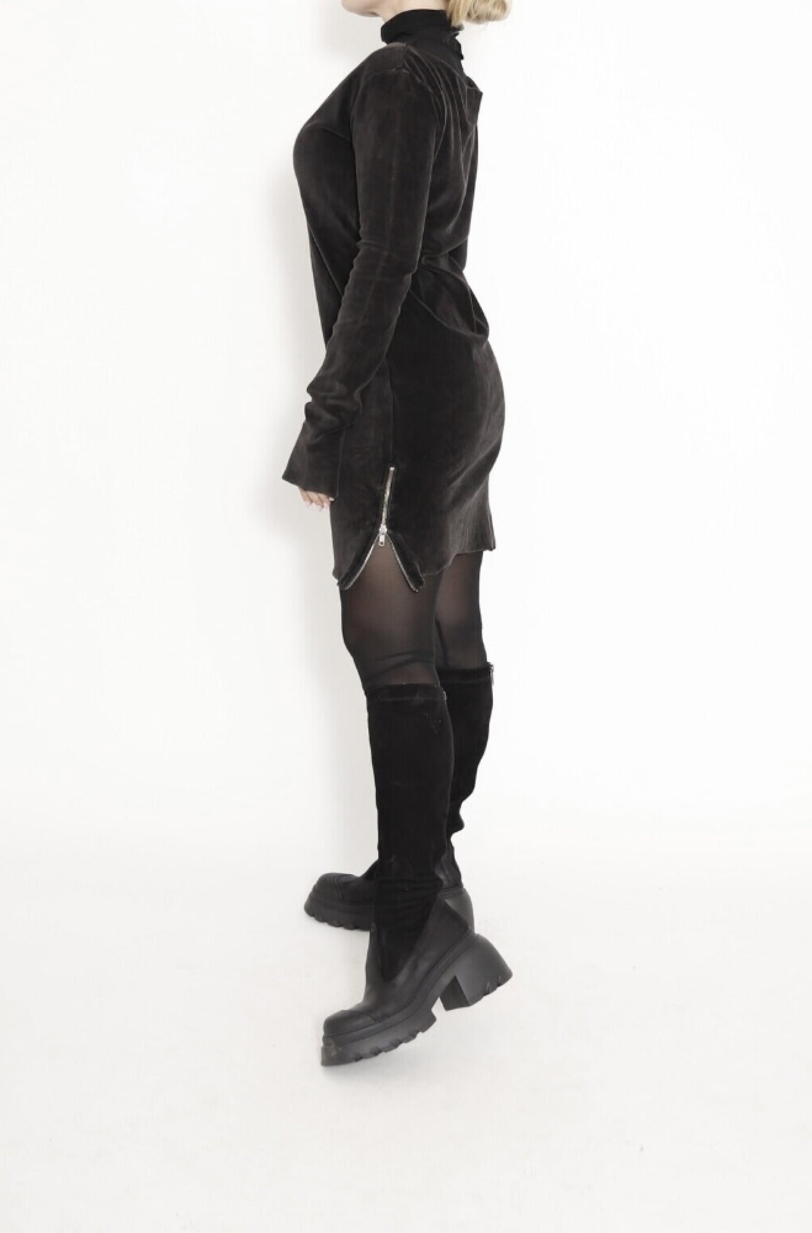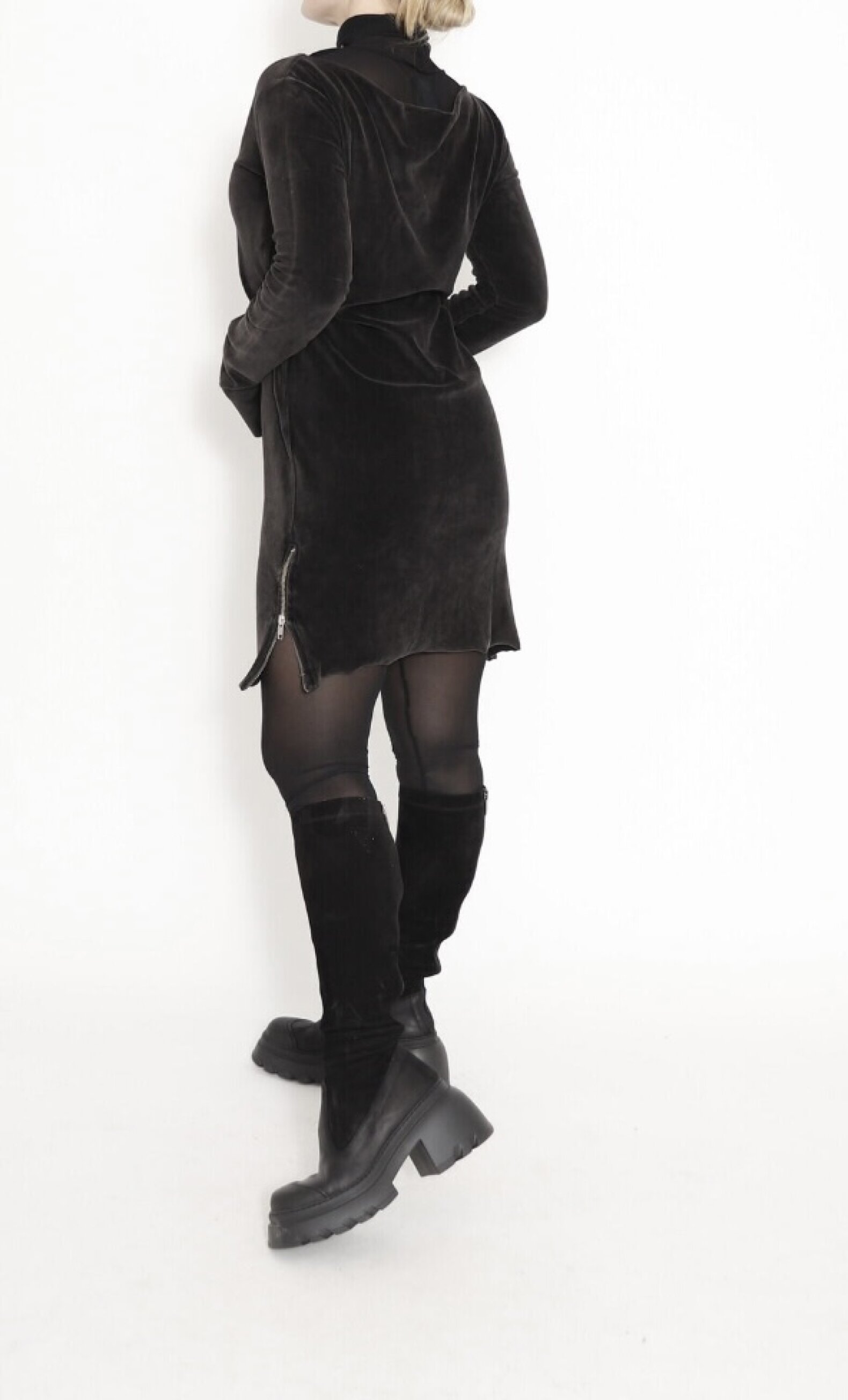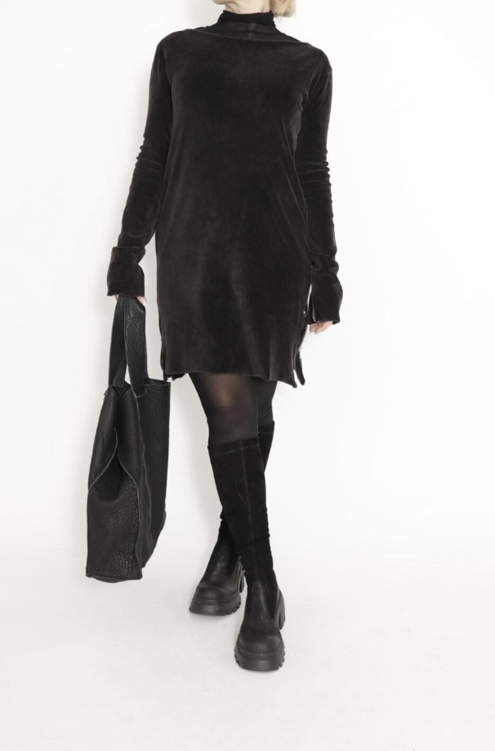 Off shoulder kjole i blødt vasket jersey. Detaljeret med rå lynlås og slids ved ærmer. Farven er mere antracit på grund af vasket effekt.Materiale