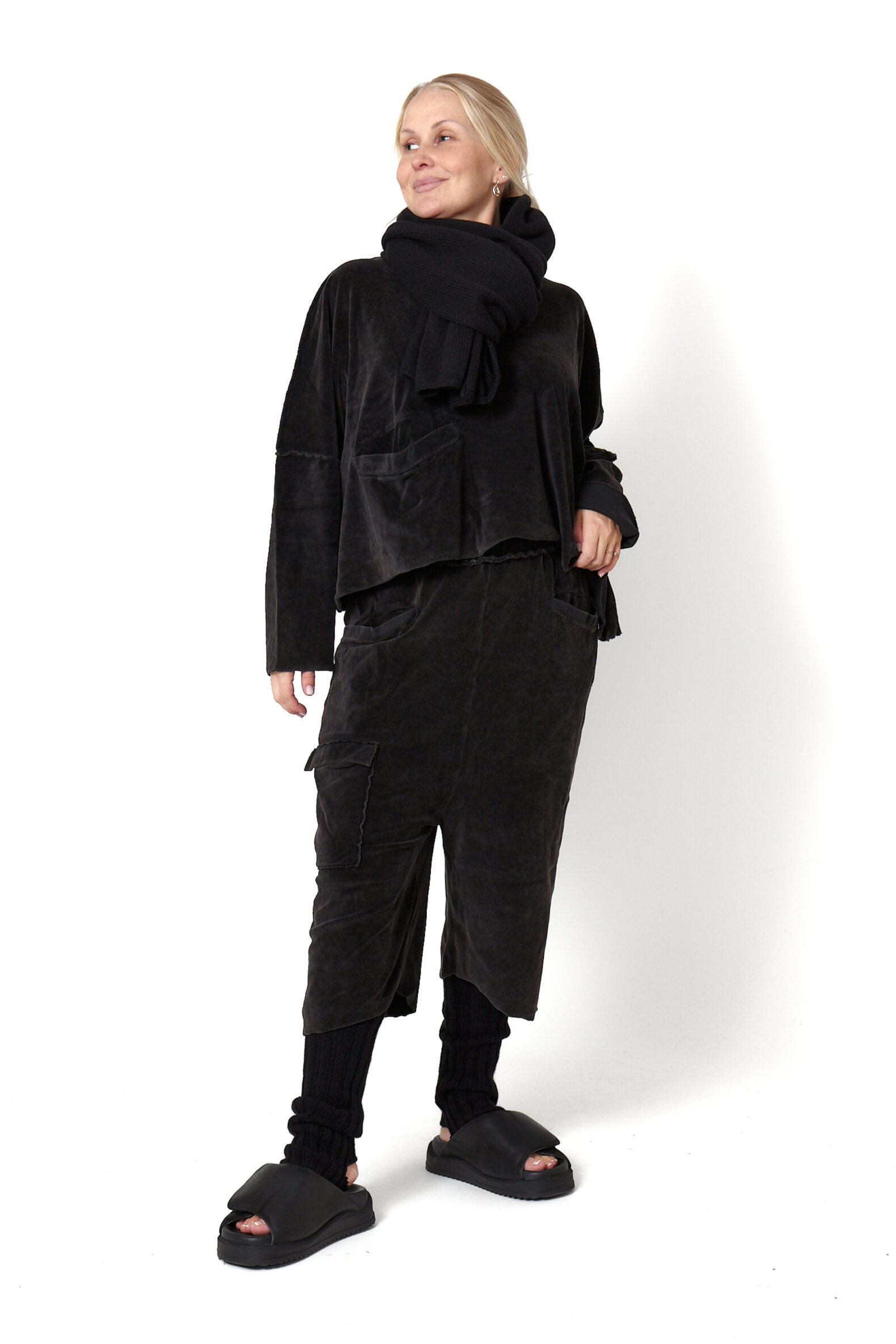 Baggy bukser med brede ben, 3/4 længde, bredt elastikbånd i taljen og lommer foran. I blød, lækker vasket fløjl. Farven er mere antracit på grund af vasket effekt.