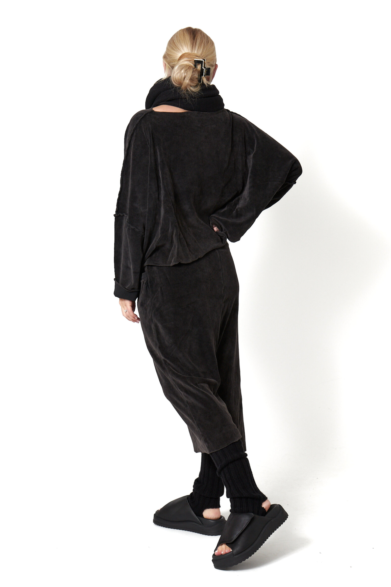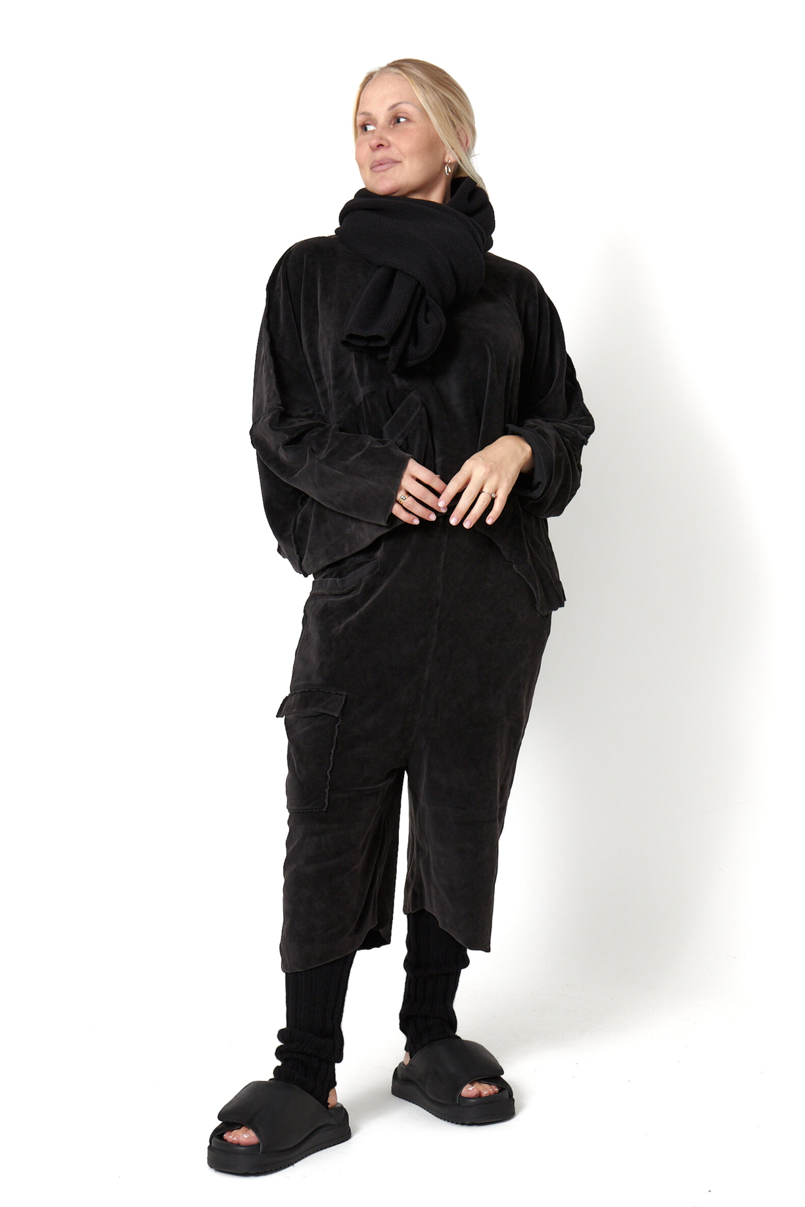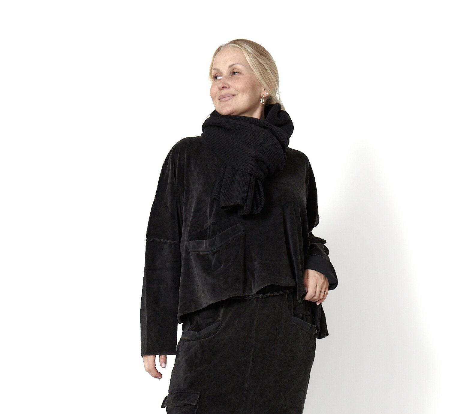 Cropped loose fit bluse med dekorativ synlig lomme foran. Lavet i blødt vasket fløjl. Farven er mere antracit på grund af vasket effekt.