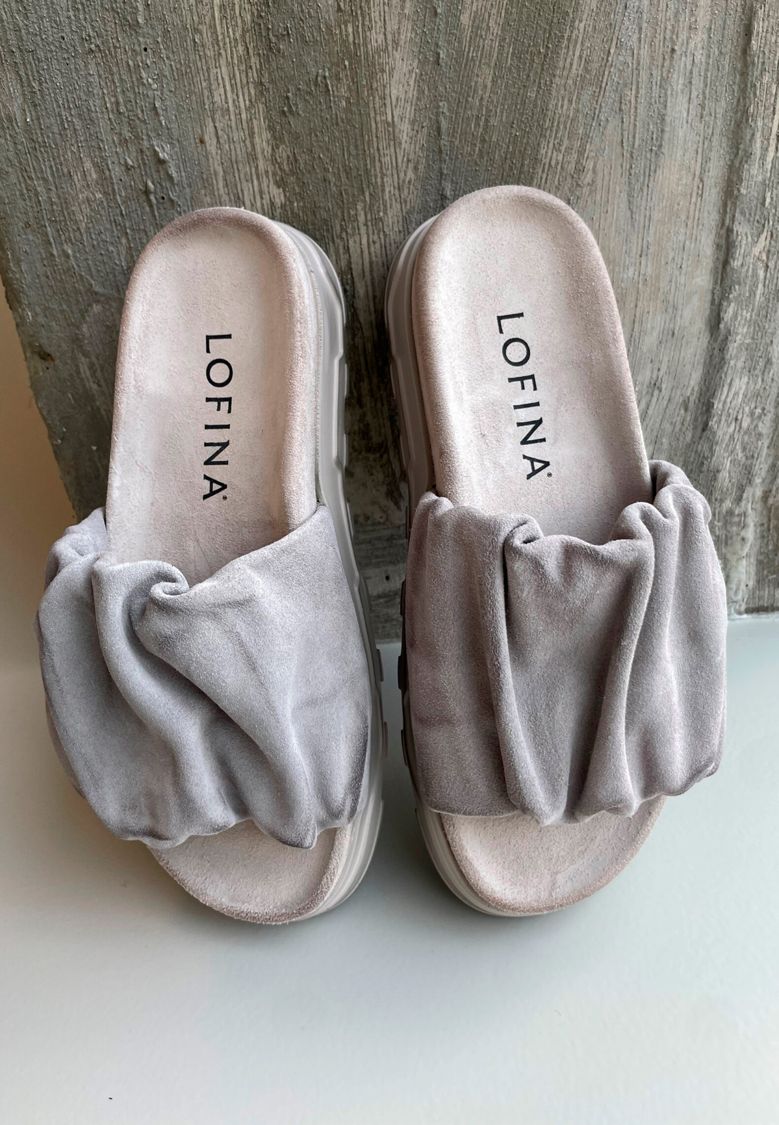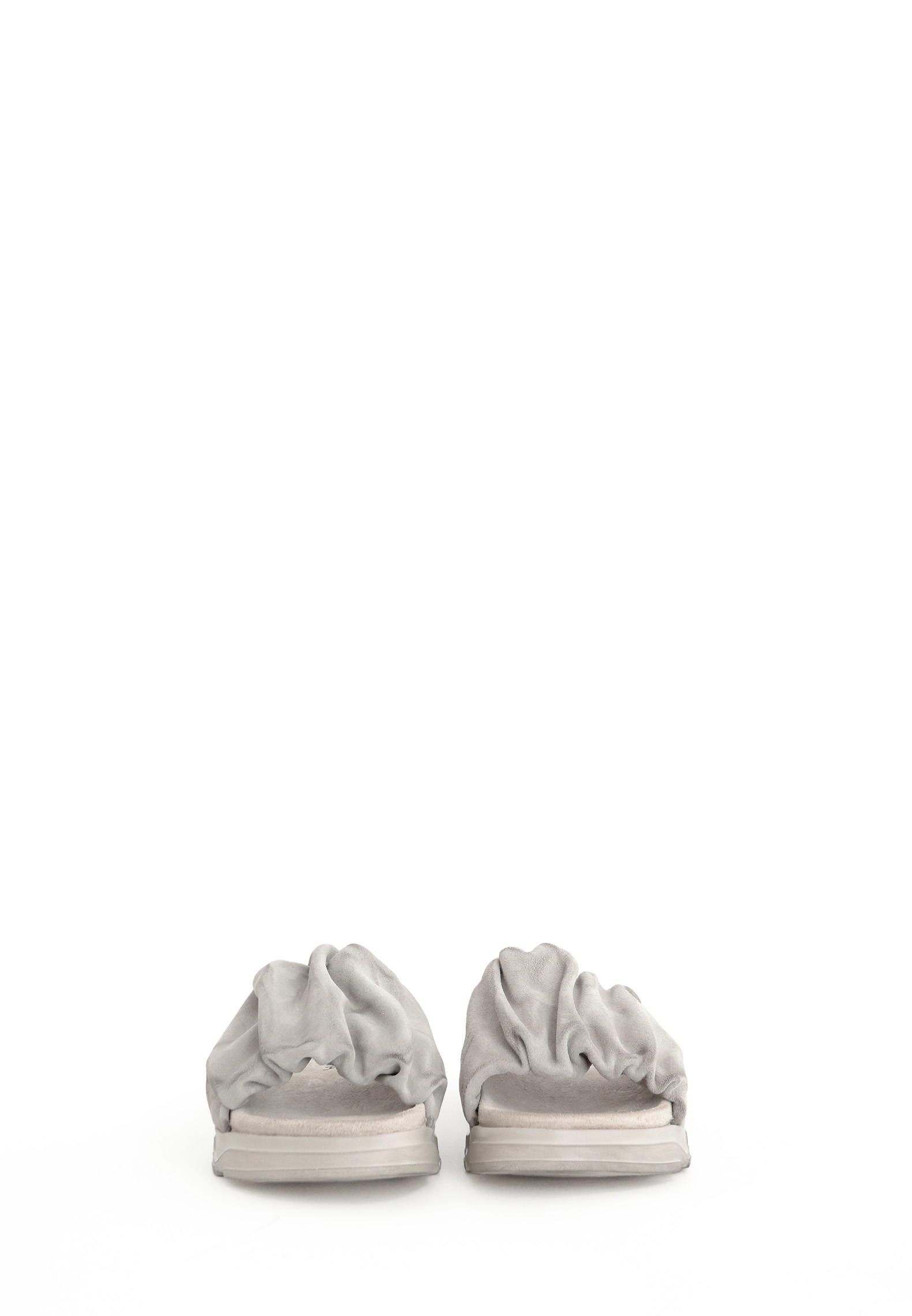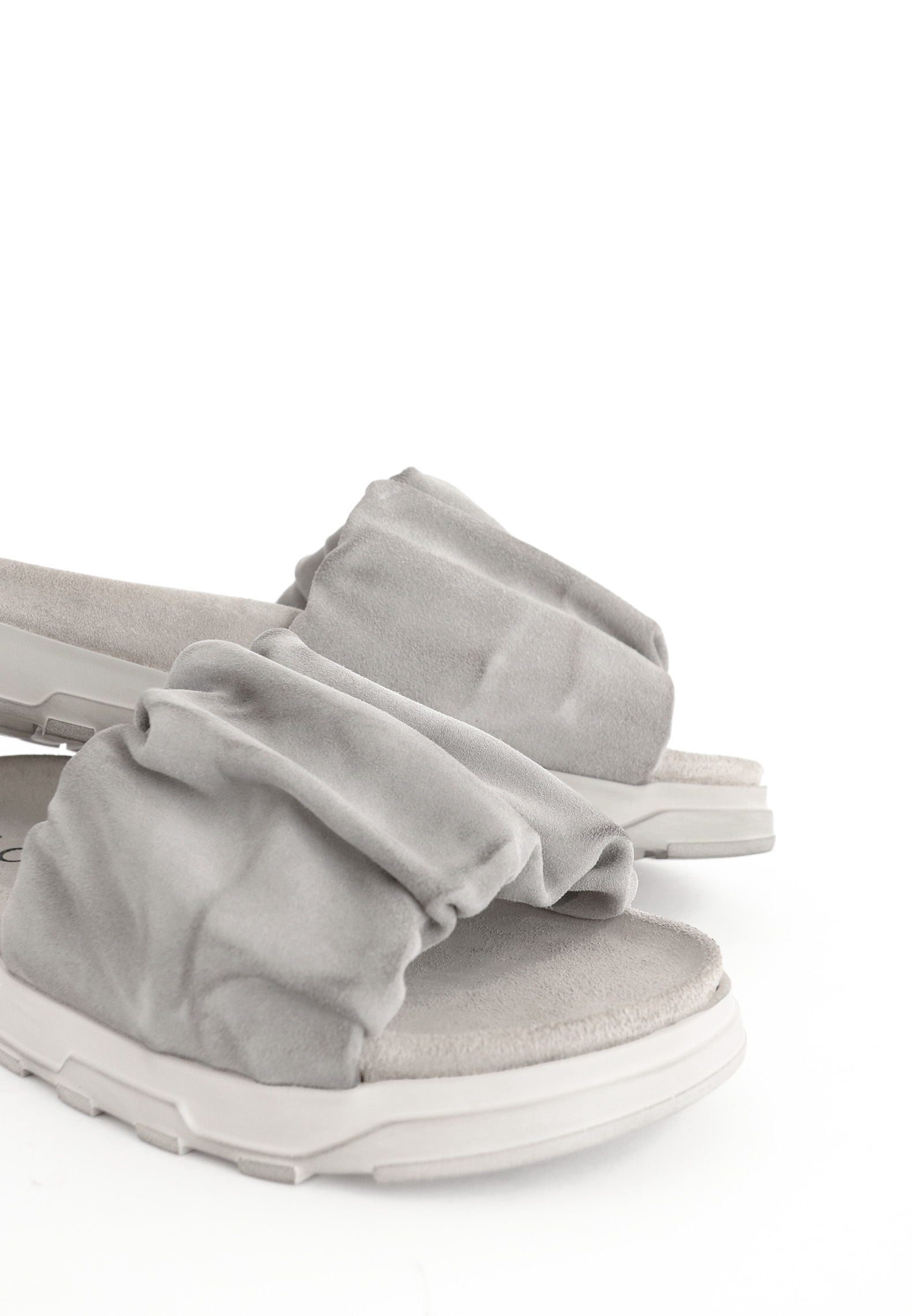 Sandal i lys grå ruskind med rynkeeffekt henover vristen. Sandalen har en behagelig fodsengssål i blødt ruskind, som giver en ekstra god komfort. Sålen er vores bestseller sål, lavet i høj og holdbar kvalitet.