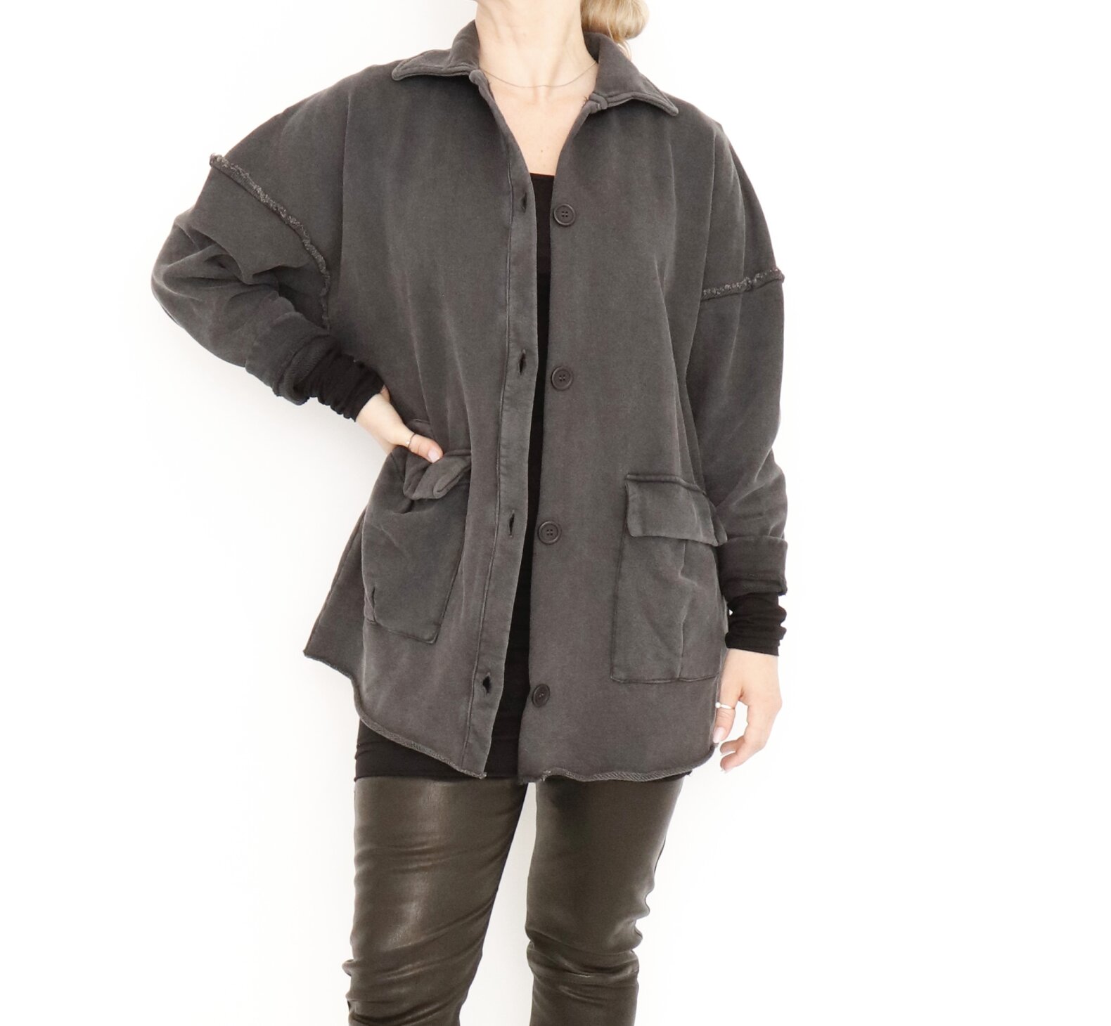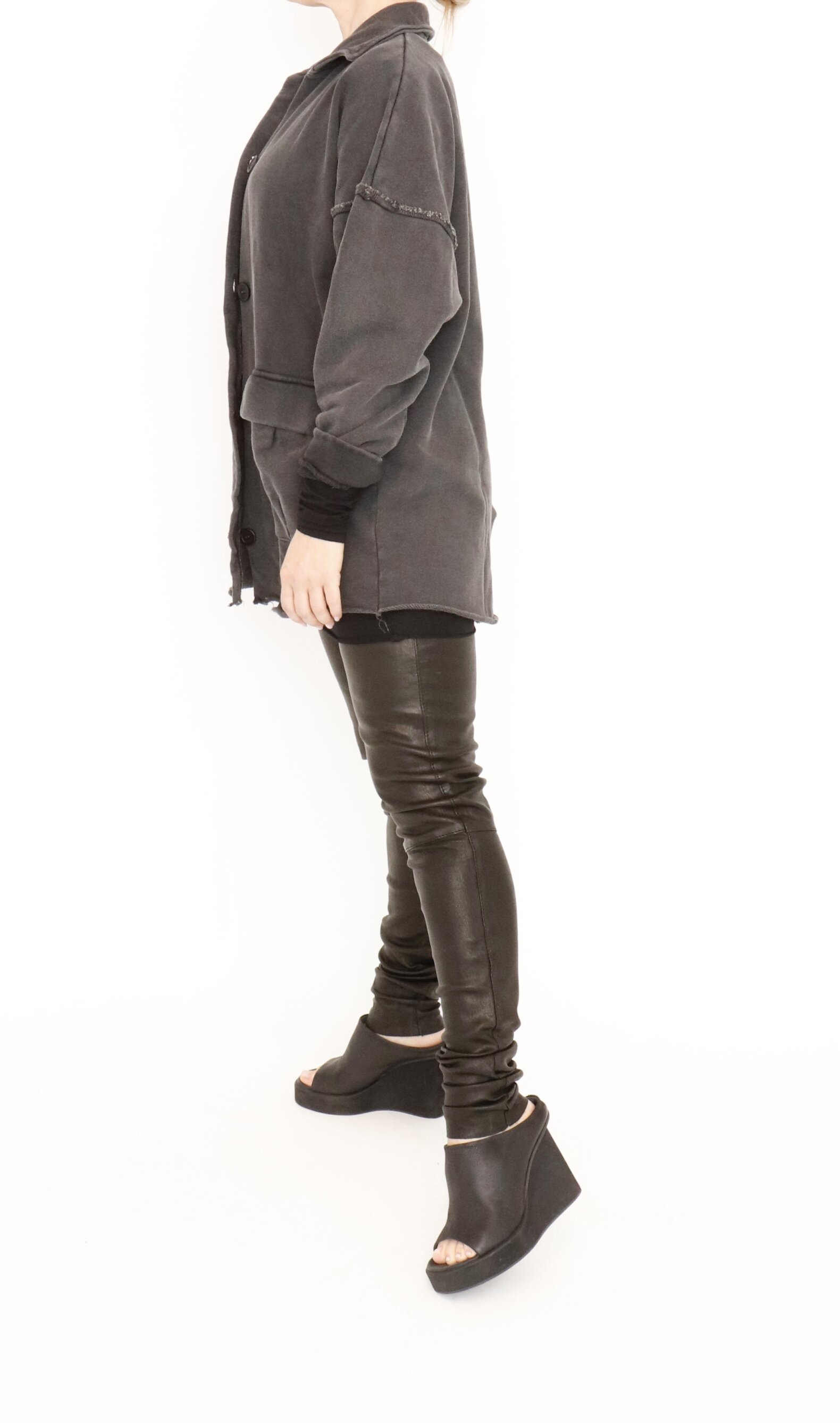 Cardigan with raw details, big pockets and button closure. The cardigan is made of 100% organic cotton. It comes with a collar and a slit on the back.