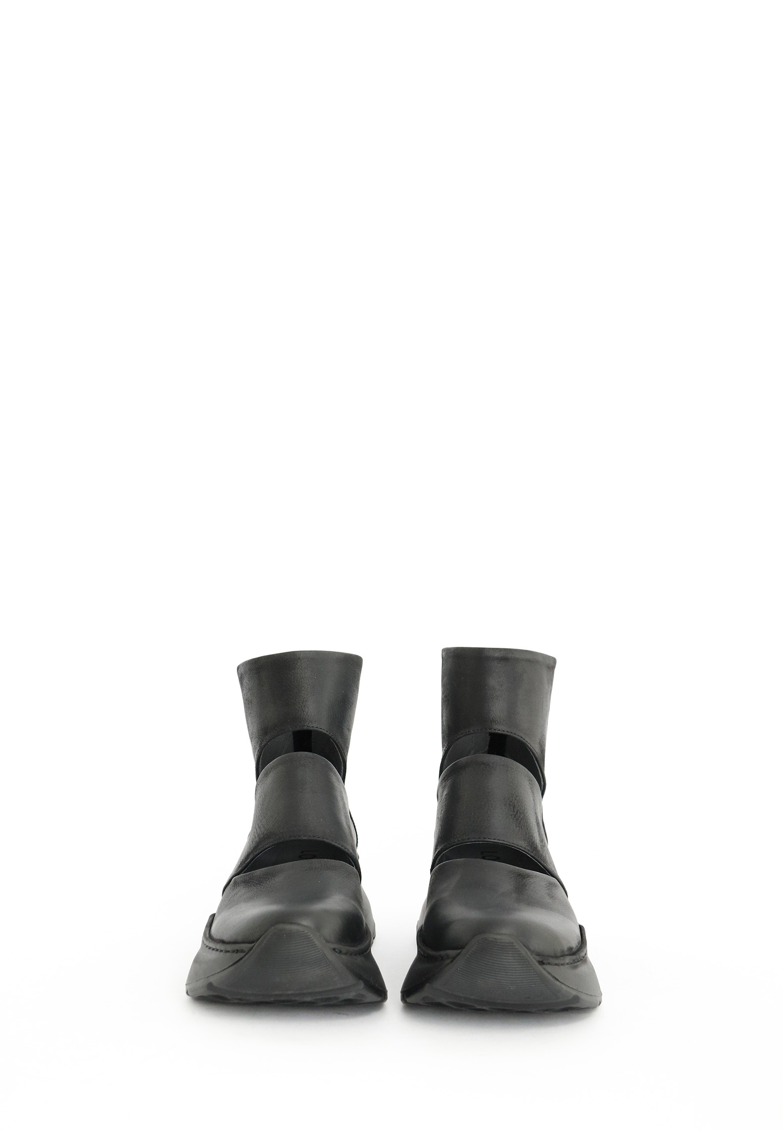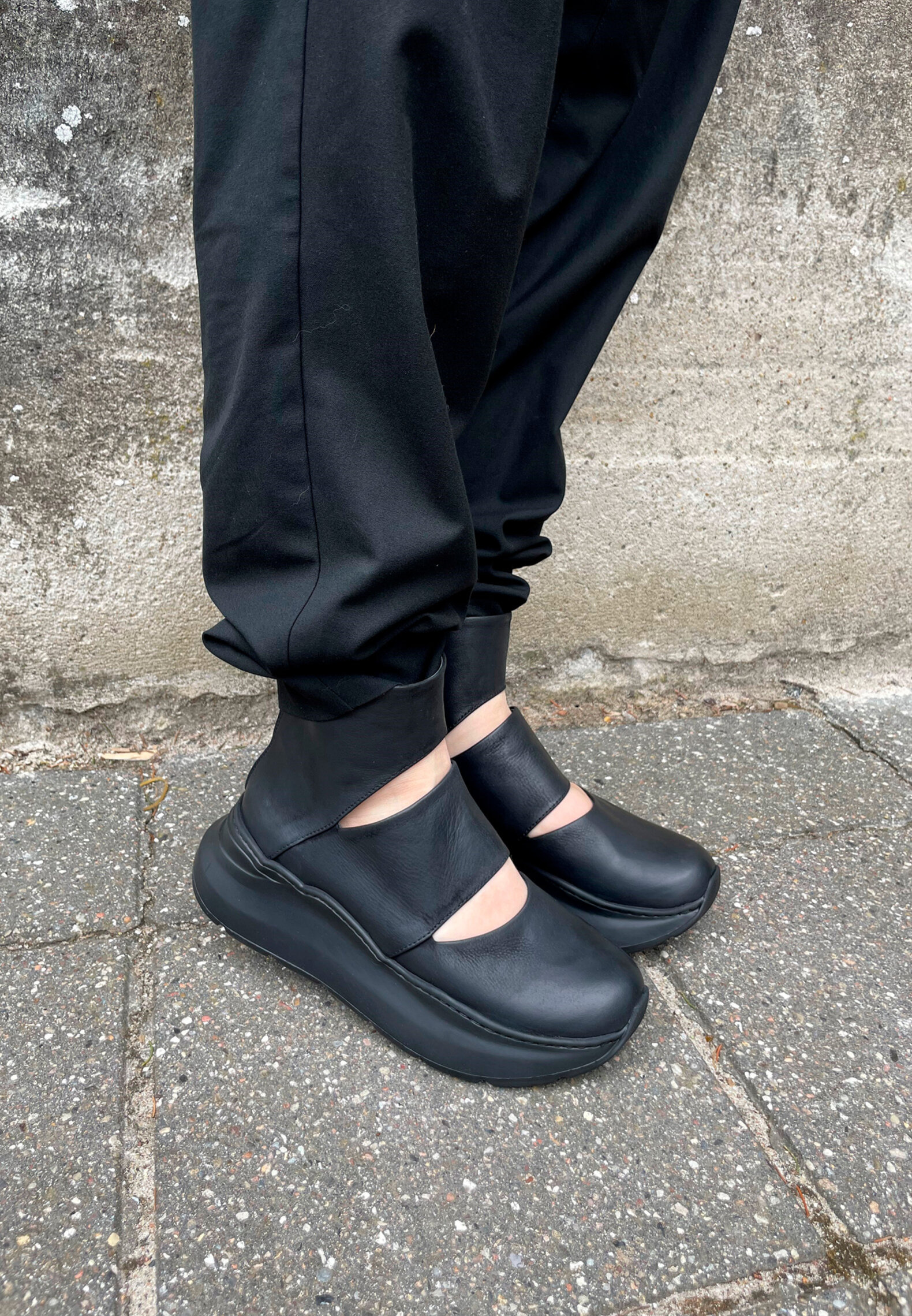 Skoen er kalveskind. Sålen er af blandingsmaterialer.