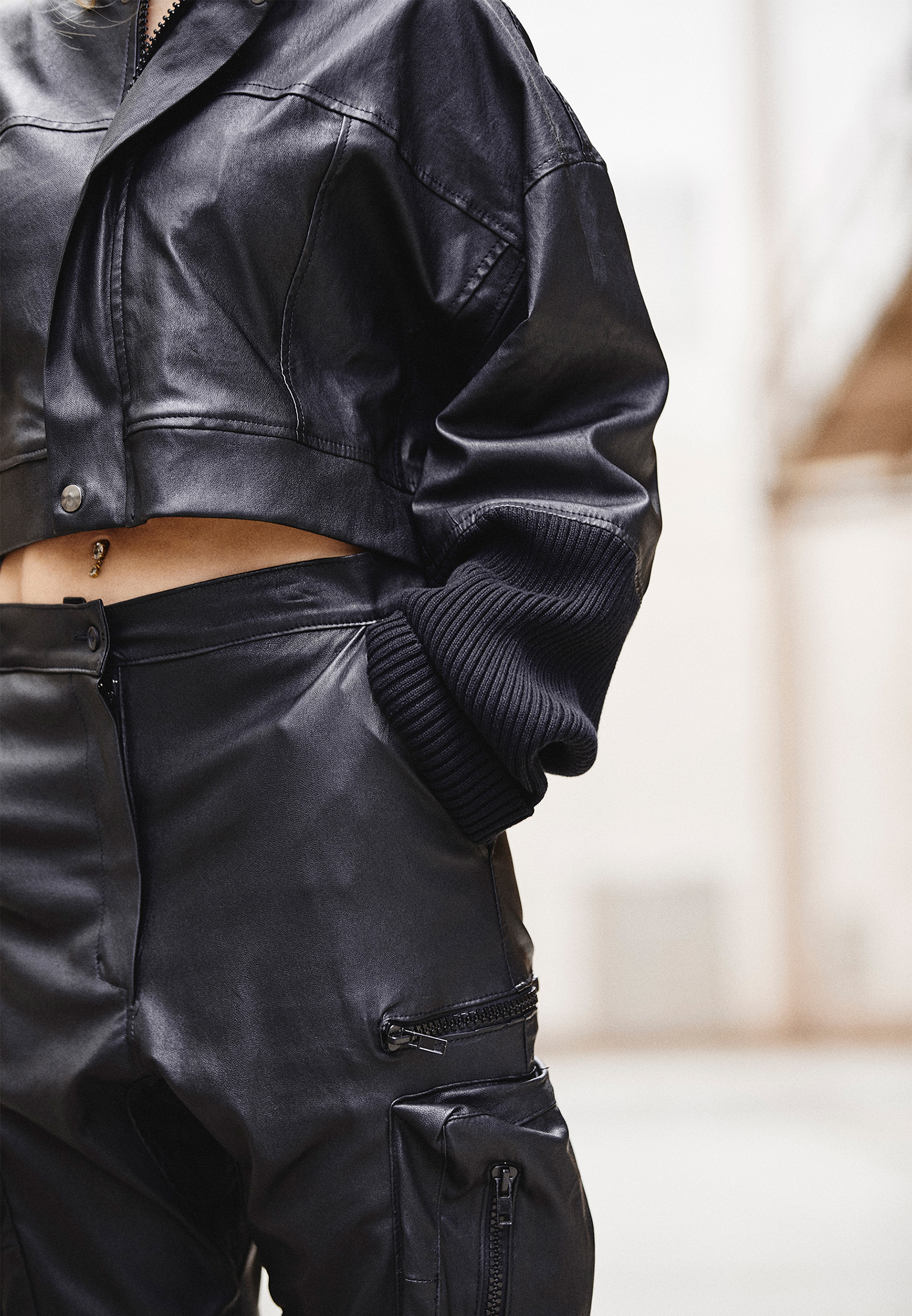 Cargo leather pants from Sort Aarhus in 100% lamb leather. The pants are closed with button and zipper. Several zippers and pockets for a raw and cool look.