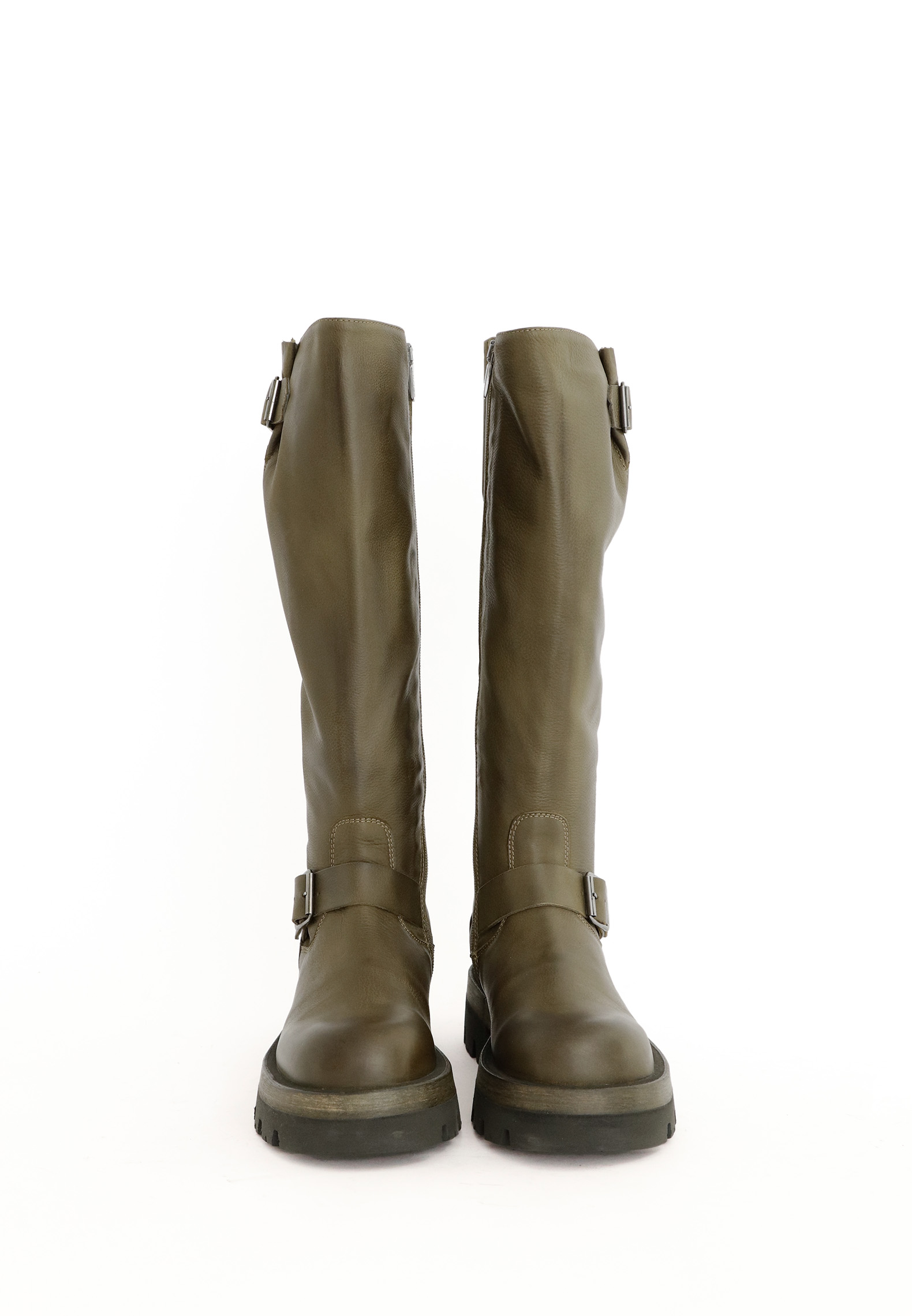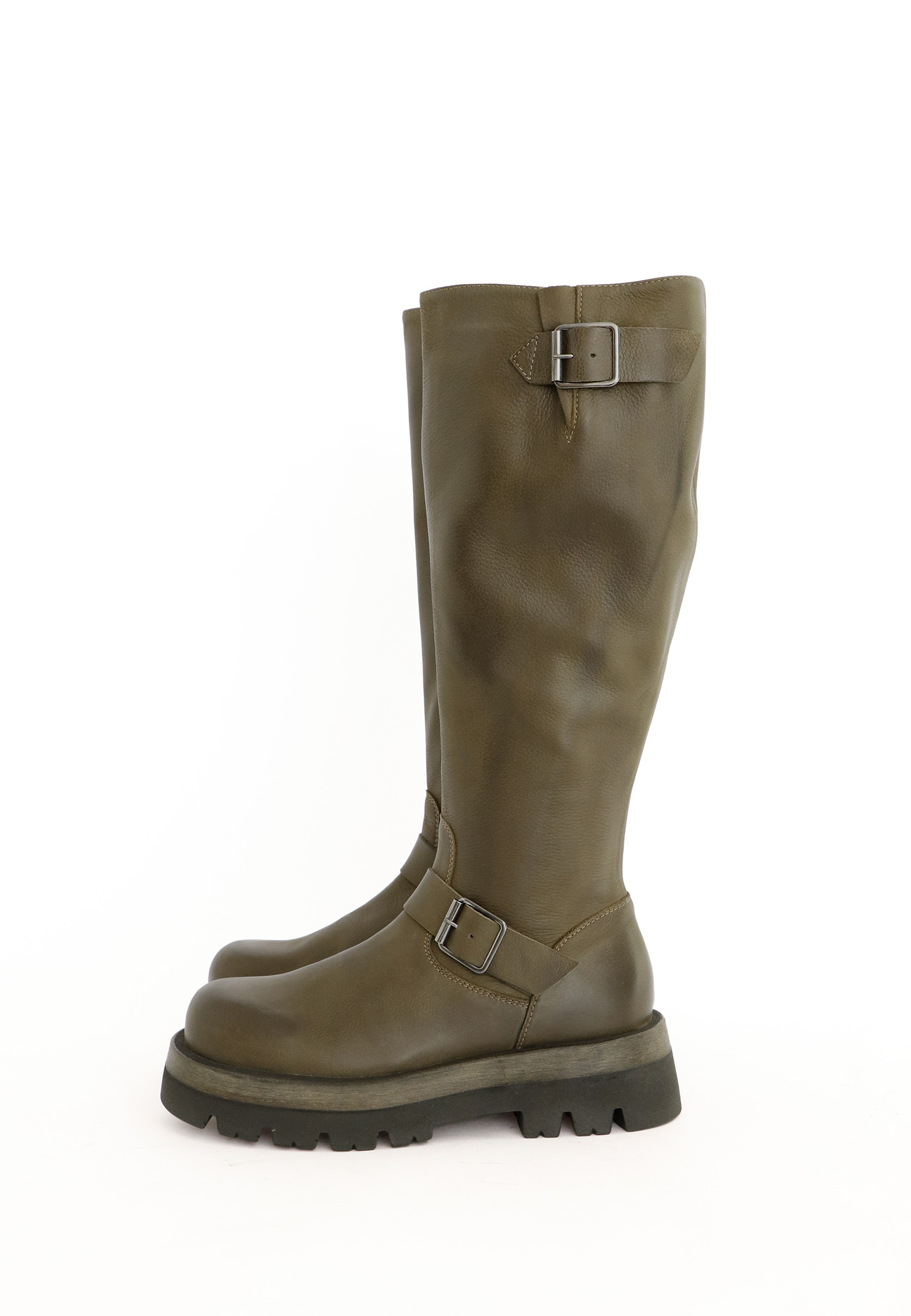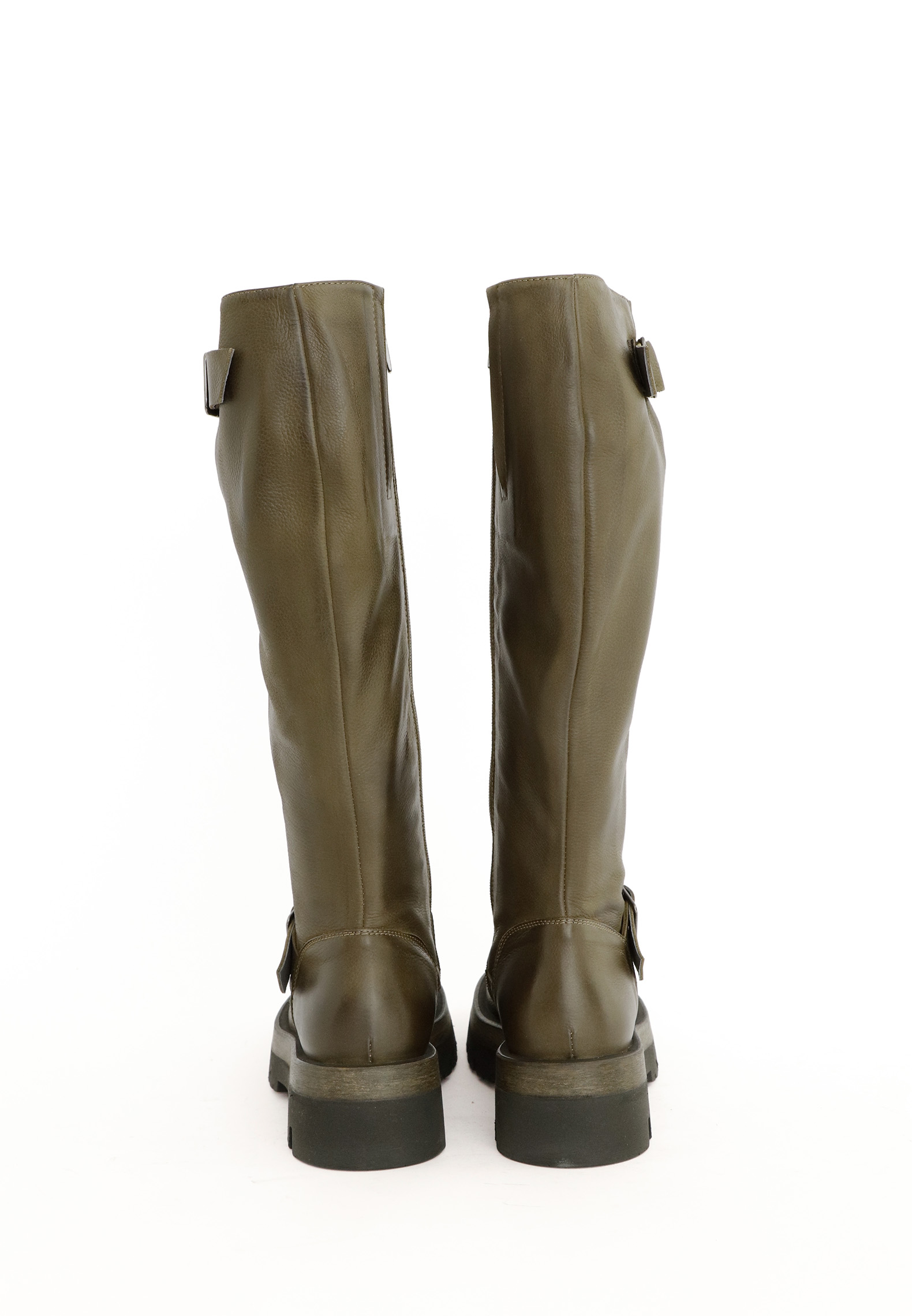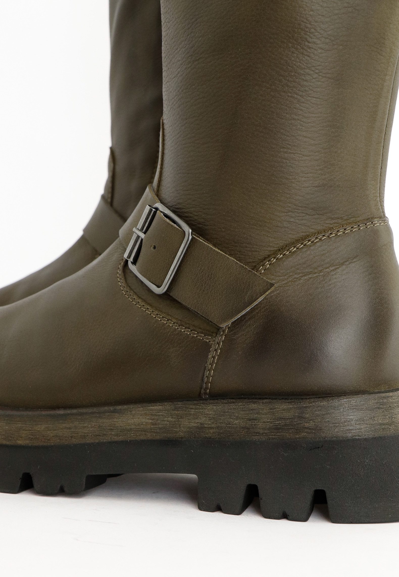 High shaft biker-boots in calfskin with zipper on the inside and buckles on the outside. The sole is a light weight sole with a piece of rubber in the middle. All Lofina shoes are carefully crafted by hand at a small family-owned factory in central Italy. Every style is uniquely manufactured from exclusive core leather materials sourced nearby.Material