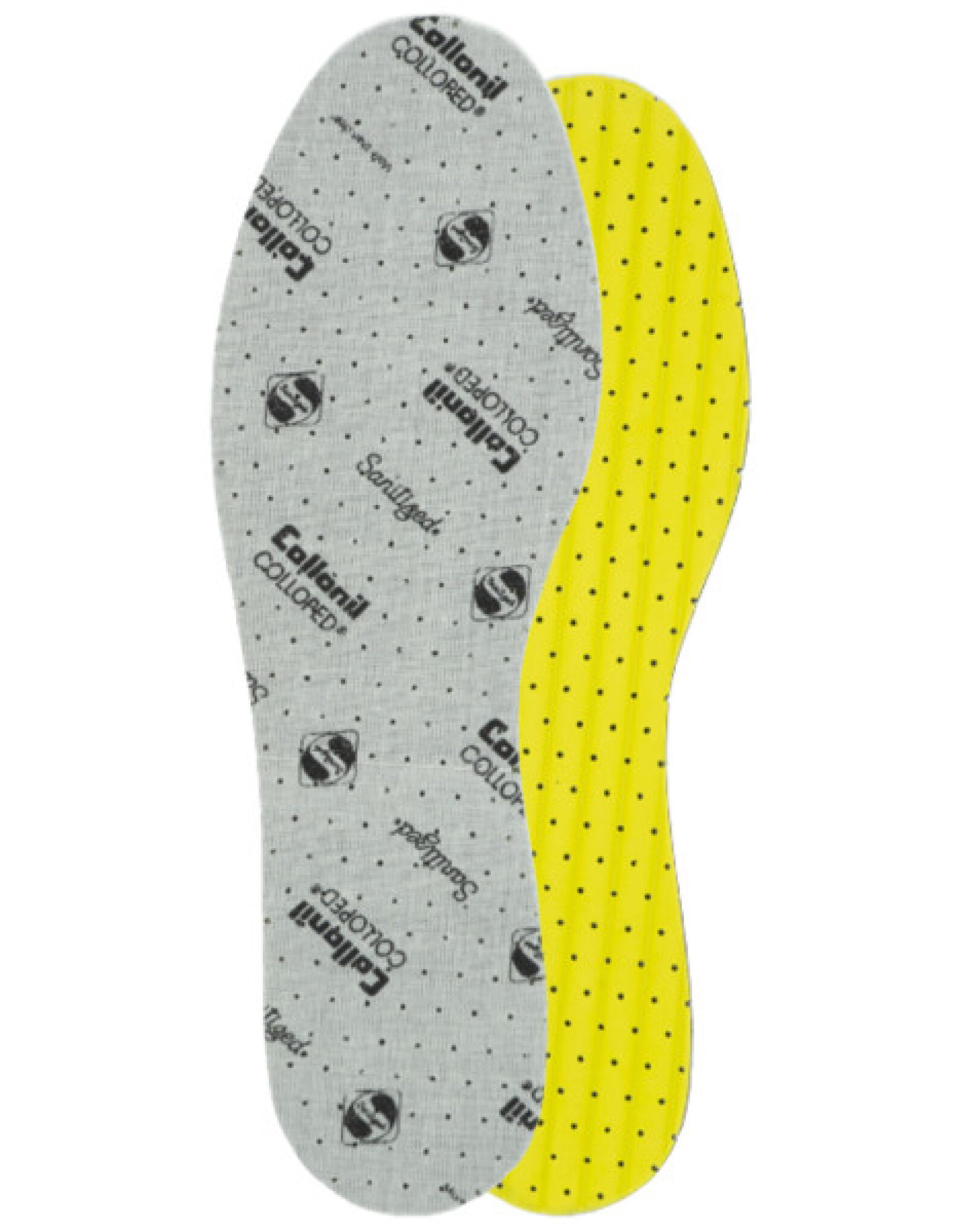 Latex insole from Collonil. The upper side made of an absorbent cotton layer with an integrated deodorant lends the sole a pleasant smell. The intermediate layer made of soft active carbon latex eliminates odours. The soft ribbed latex on the lower side cushions the foot. The perforations ensure optimum air circulation.2-5 days delivery