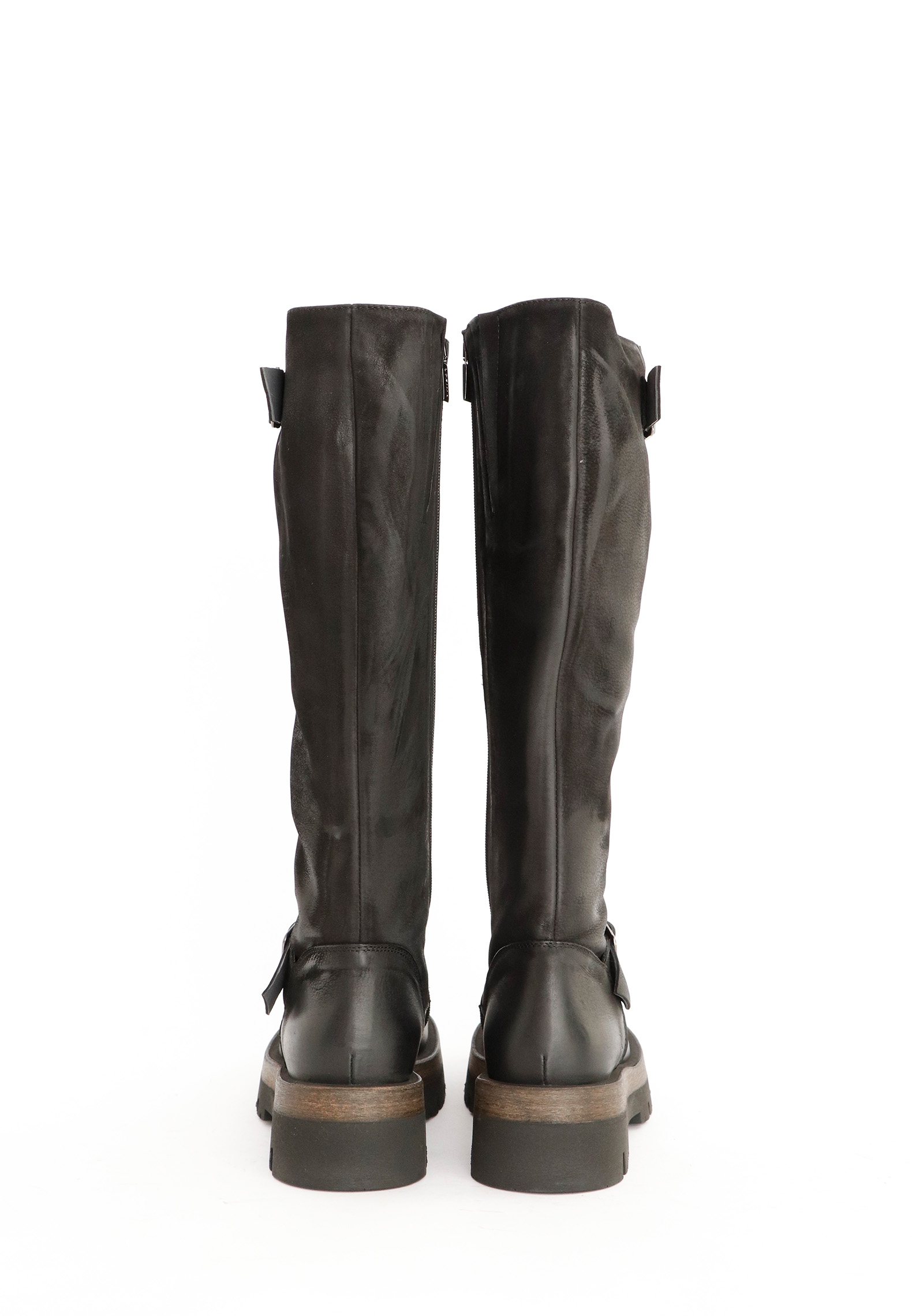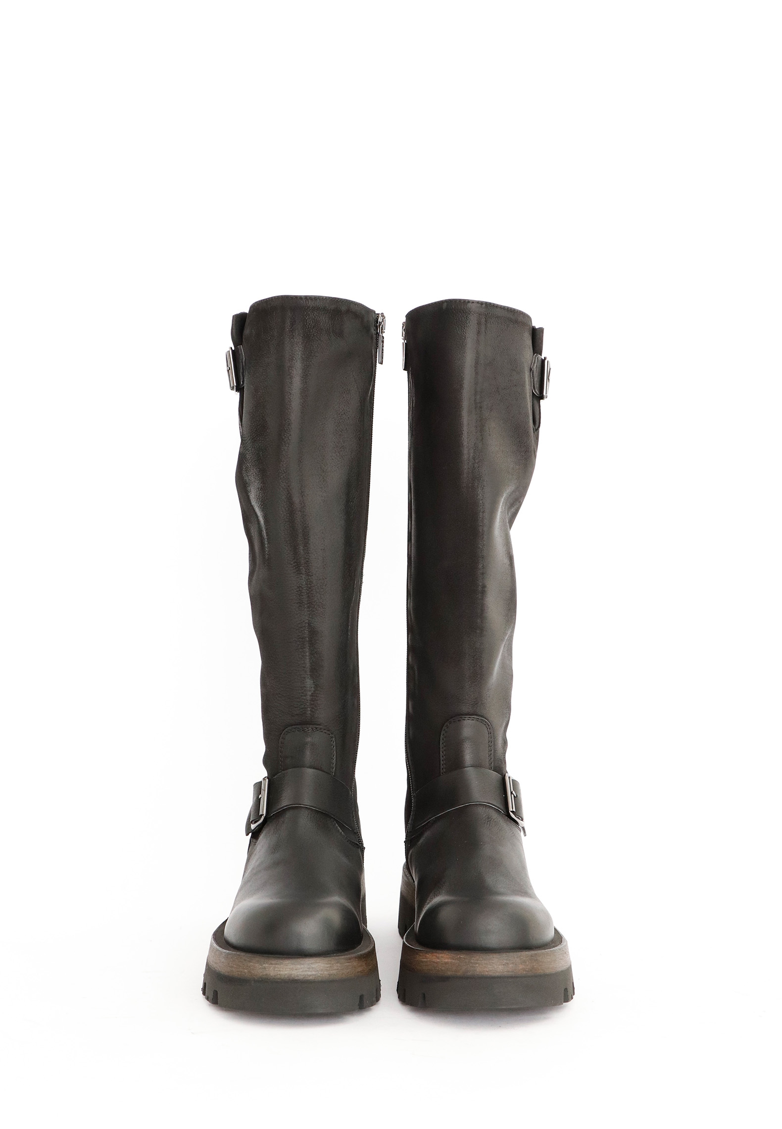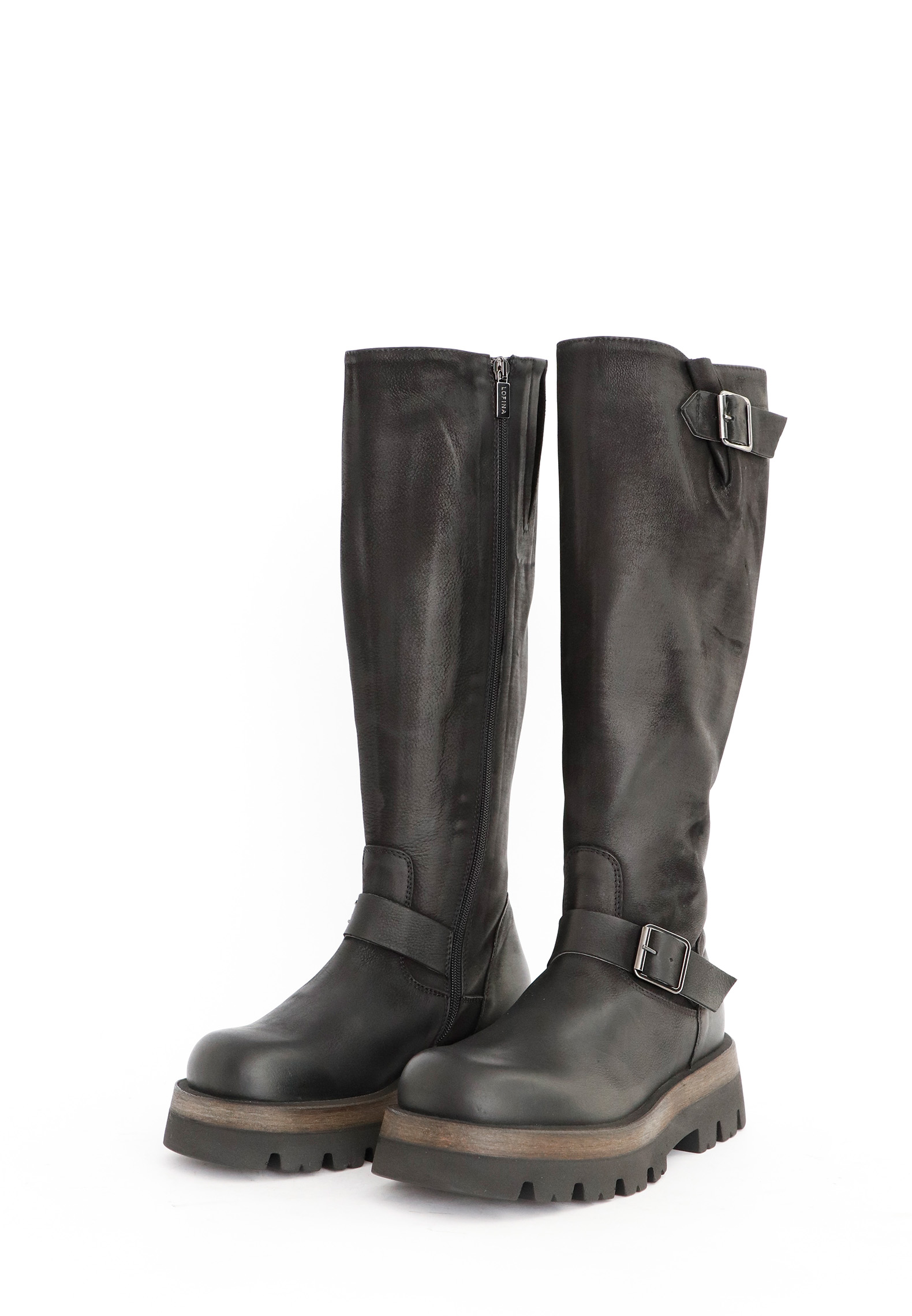 High shaft biker-boots in calfskin with zipper on the inside and buckles on the outside. The sole is a light weight sole with a piece of rubber in the middle. All Lofina shoes are carefully crafted by hand at a small family-owned factory in central Italy. Every style is uniquely manufactured from exclusive core leather materials sourced nearby.