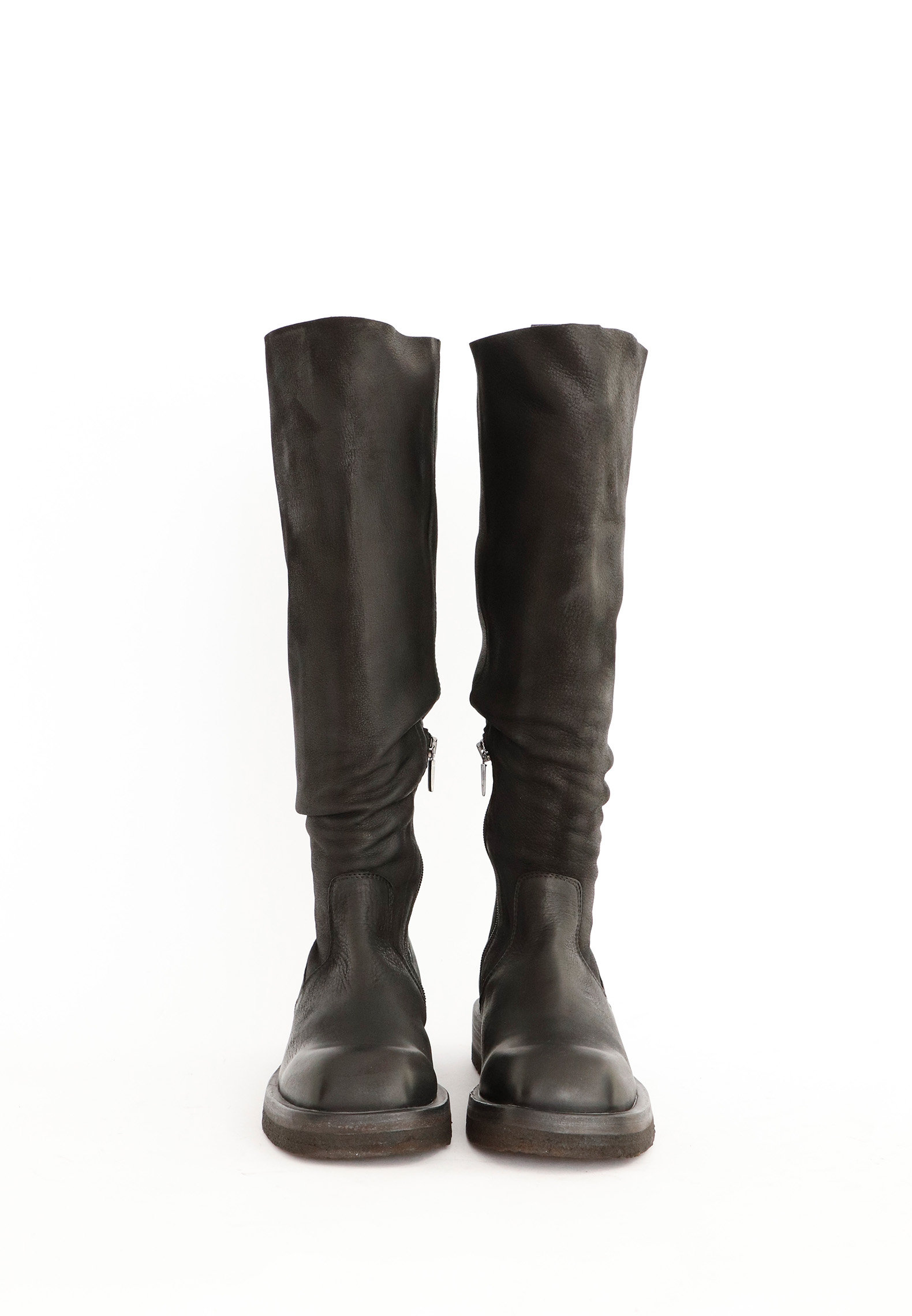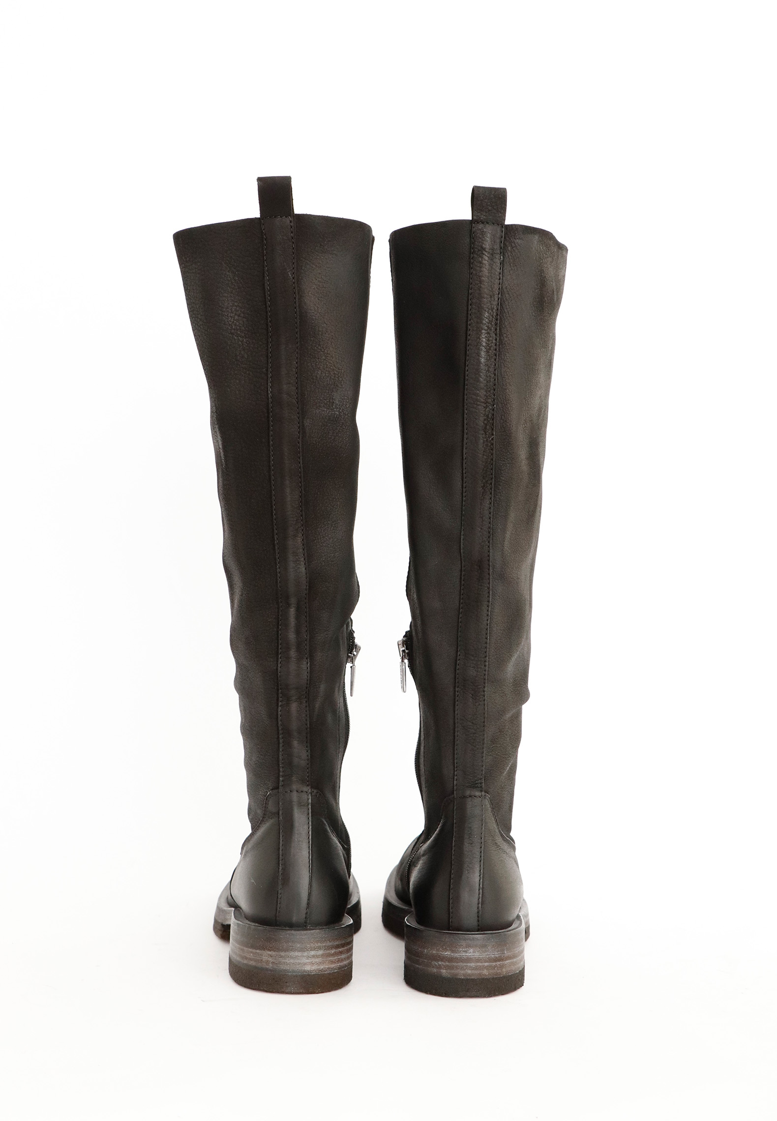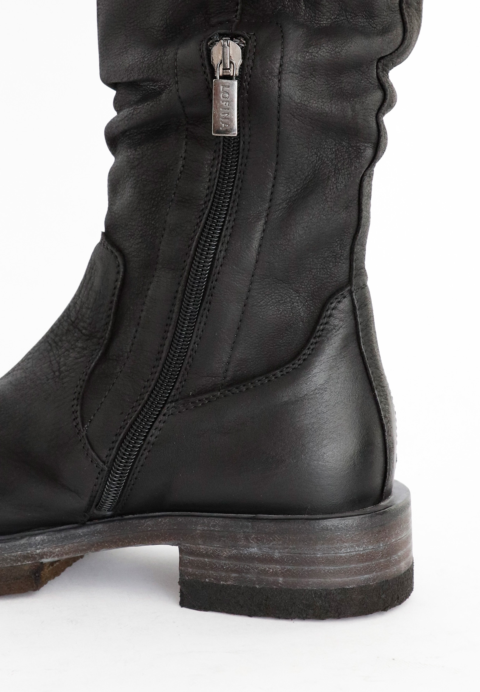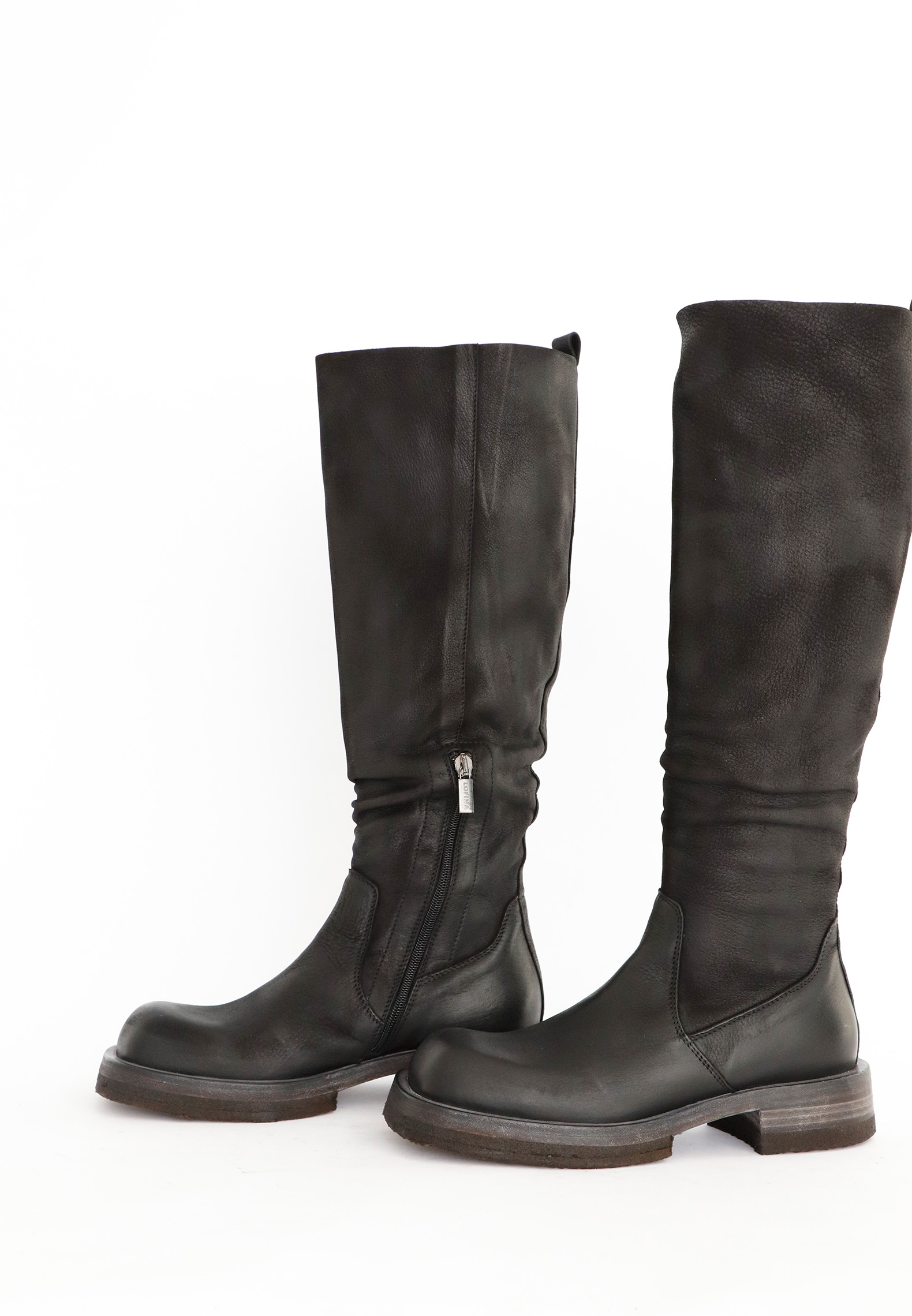 Long boot in calfskin with an un-lined shaft. The front of the boot is squared. The sole is a combination of natural rubber and washed leather that gives a cool and raw look. All Lofina shoes are carefully crafted by hand at a small family-owned factory in central Italy. Every style is uniquely manufactured from exclusive core leather materials sourced nearby.Material