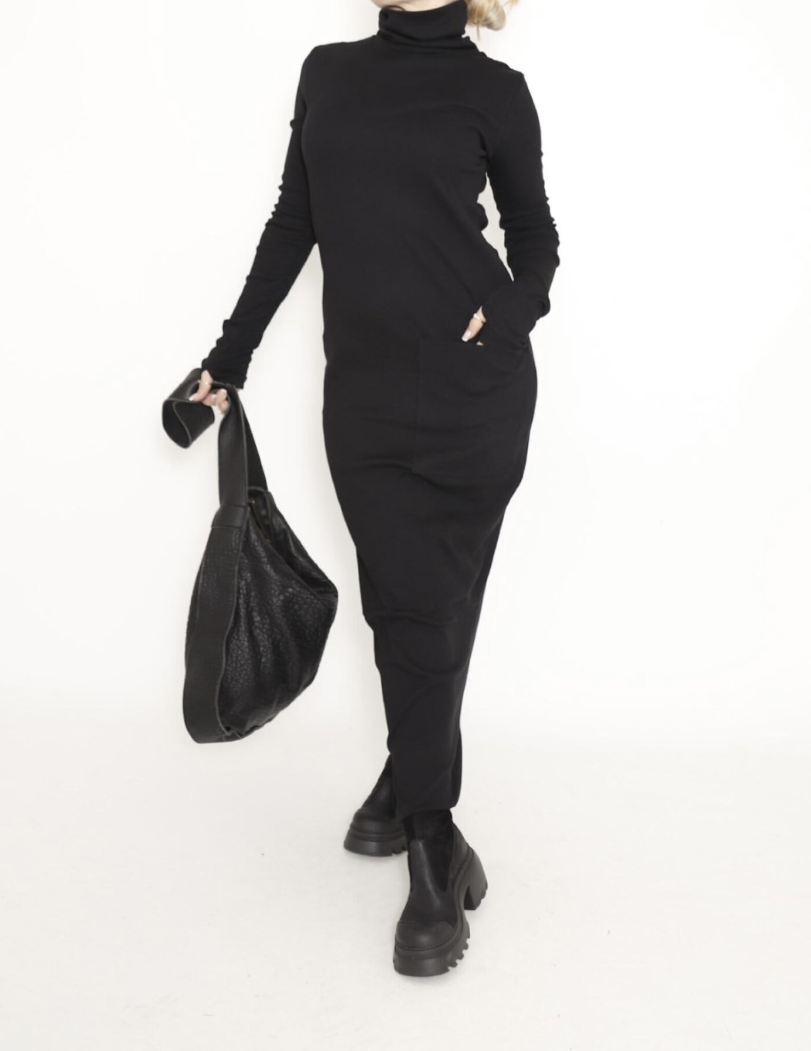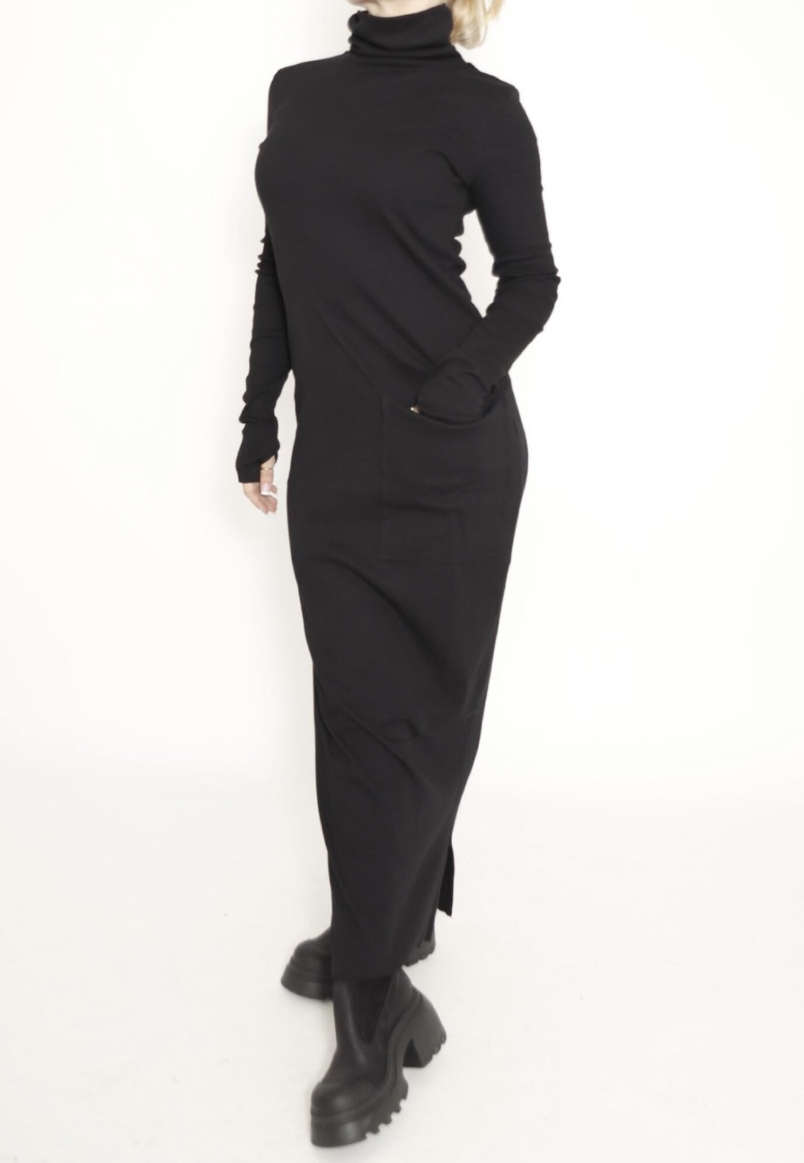 Fitted dress with a turtle neck. This dress will look great with both a pair of chunky boots and a pair of high heels.
