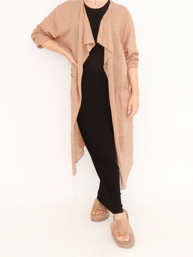 Denne lange cardigan med frontlommer er lavet i en let og åndbar bomuld/hør-blanding, der giver et afslappet og naturligt look. Perfekt til lag-på-lag styling, uanset om du ønsker et casual eller elegant udtryk. Den løse pasform og bløde tekstur gør den ideel til både forår og kølige sommeraftener.
