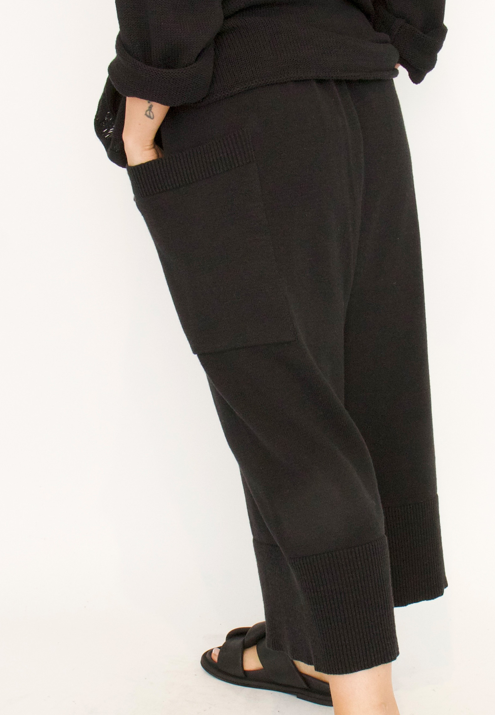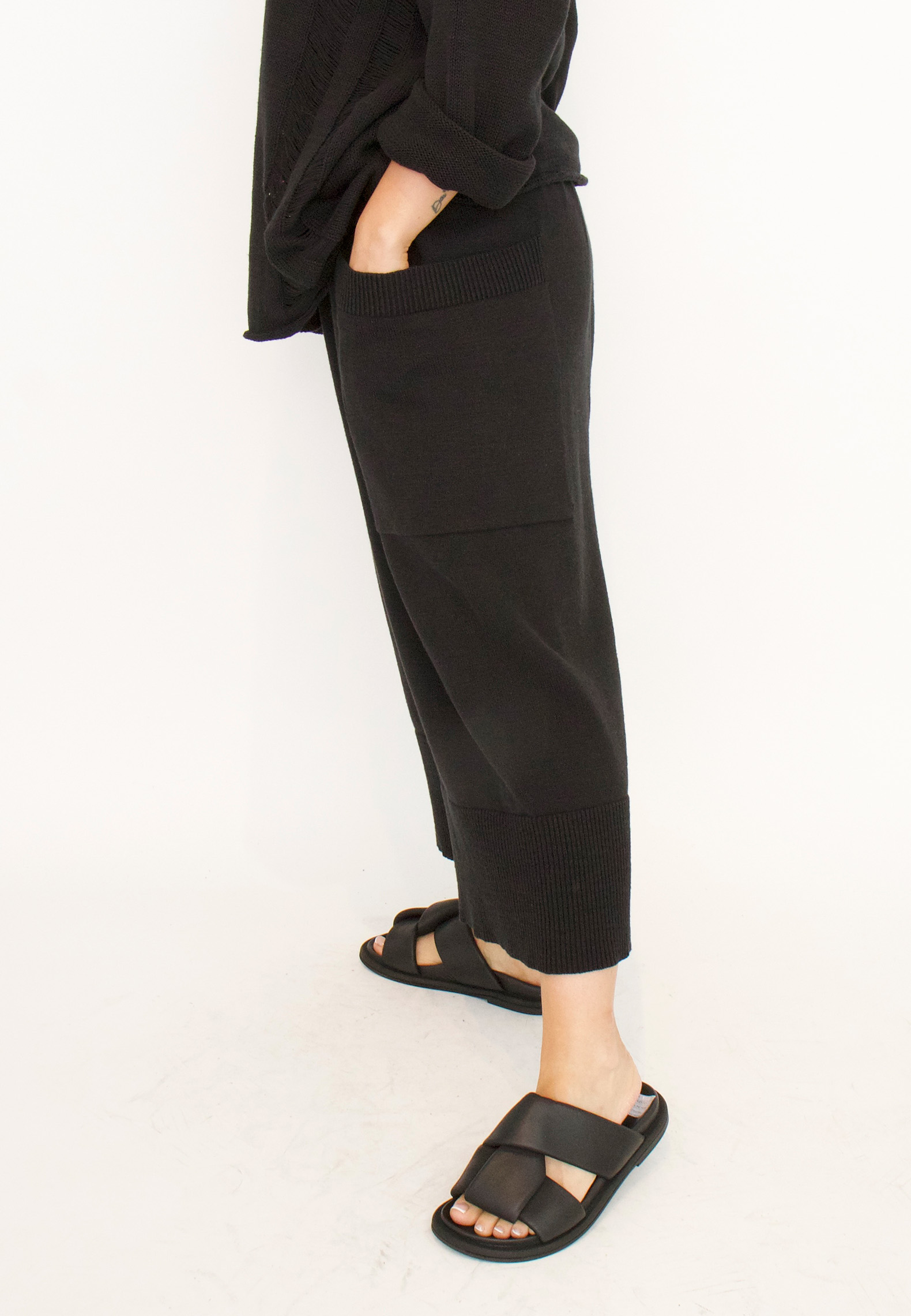¾ lange strikbukser med vide ben og store lommer foran. Denne kombination af bomuld og hør sikrer en blød, åndbar og let kvalitet. Alt Sort Aarhus tøj er produceret i Portugal af nøje udvalgte lokale materialer og kvaliteter med fokus på design og pasform.