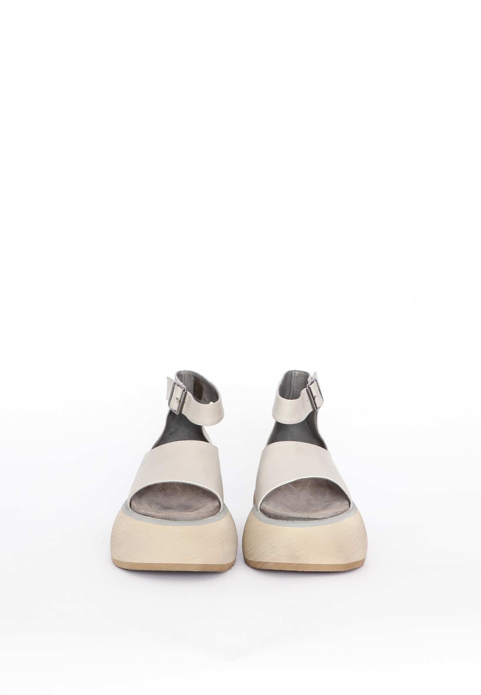 Open sandal with buckle closure. The sandal is made in light grey calfskin with a pigskin lining, and comes with a soft footbed sole made in suede for good comfort. The sole is firm and chunky.Material
