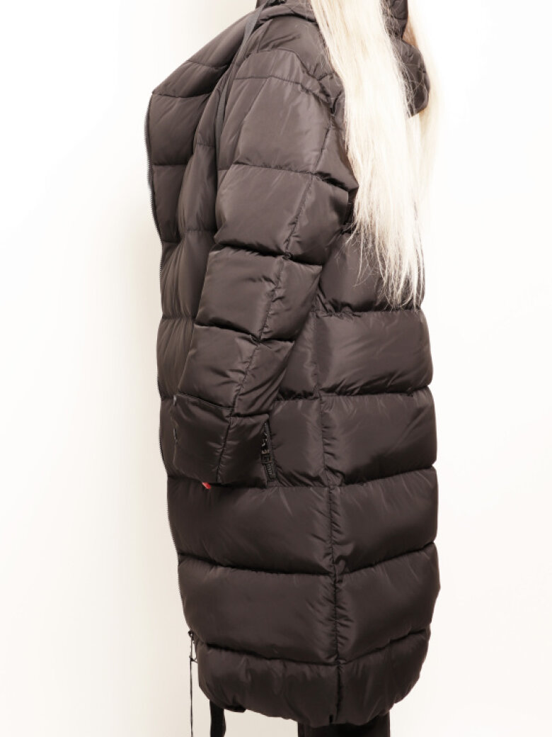 Style nr. PWARNI. La Haine lang dunjakke. Jakken har lynlås, lommer og hætte. Jakken har knapper i kraven. Med snøre i bunden så den kan reguleres. Jakken er stor i størrelsen